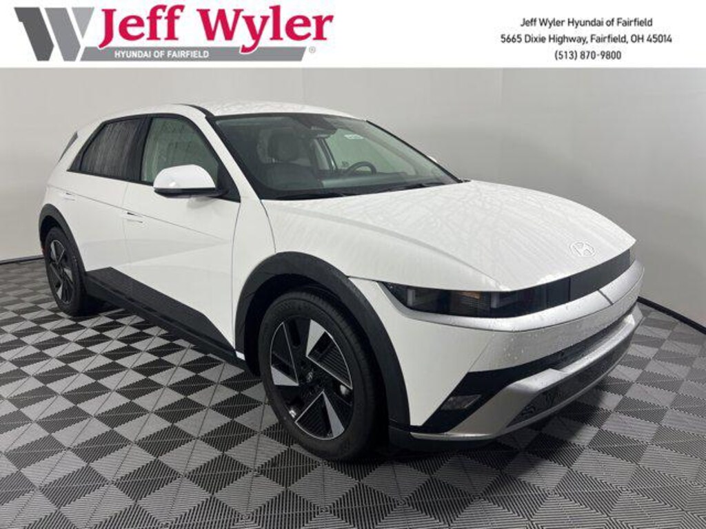 2026 Hyundai IONIQ 5 Atlas White SEL AWD 1-Speed Automatic Electric Motor Android Auto, Apple CarPlay, CALL NOW FOR YOUR VIP APPOINTMENT 513-870-9800, FULLY SERVICED w/RECORDS, GUARANTEED FINANCING!! NO MATTER YOUR SITUATION WE CAN GET AN APPROVAL!!, THE #1 Volume dealer in the region! Come see why for yourself Today!!, WE PAY MORE FOR YOUR TRADE!!. 110/87 City/Highway MPG Jeff Wyler Hyundai of Fairfield is excited to offer this great-looking 2026 Hyundai IONIQ 5 SEL in Atlas White. Well equipped with: Option Group 01, Android Auto, Apple CarPlay, CALL NOW FOR YOUR VIP APPOINTMENT 513-870-9800, FULLY SERVICED w/RECORDS, GUARANTEED FINANCING!! NO MATTER YOUR SITUATION WE CAN GET AN APPROVAL!!, THE #1 Volume dealer in the region! Come see why for yourself Today!!, WE PAY MORE FOR YOUR TRADE!!, 4-Wheel Disc Brakes, 6 Speakers, ABS brakes, Air Conditioning, All Season Fitted Liners, Alloy wheels, AM/FM radio: SiriusXM, Apple CarPlay & Android Auto, Auto High-beam Headlights, Auto-dimming Rear-View mirror, Automatic temperature control, Bodyside moldings, Brake assist, Bumpers: body-color, Cargo Net, Carpeted Floor Mats, Delay-off headlights, Driver door bin, Driver vanity mirror, Dual front impact airbags, Dual front side impact airbags, Electronic Stability Control, Emergency communication system: Bluelink+, First Aid Kit, Four wheel independent suspension, Front anti-roll bar, Front Bucket Seats, Front Center Armrest w/Storage, Front dual zone A/C, Front reading lights, Fully automatic headlights, Garage door transmitter: HomeLink, H-Tex Artifical Leather Seating Surfaces, harman/kardon® Speakers, Heated door mirrors, Heated Front Bucket Seats, Heated front seats, Illuminated entry, Low tire pressure warning, Navigation System, Occupant sensing airbag, Outside temperature display, Overhead airbag, Overhead console, Panic alarm, Passenger door bin, Passenger vanity mirror, Power door mirrors, Power driver seat, Power Liftgate, Power passenger seat, Power steering, Power windows, Radio: AM/FM/SiriusXM/HD Audio System, Rear anti-roll bar, Rear reading lights, Rear seat center armrest, Rear side impact airbag, Rear window defroster, Rear window wiper, Remote keyless entry, Security system, Speed control, Speed-sensing steering, Split folding rear seat, Spoiler, Steering wheel mounted audio controls, Telescoping steering wheel, Tilt steering wheel, Traction control, Trip computer, Turn signal indicator mirrors, Variably intermittent wipers, and Wheels: 19" x 7.5J Alloy.