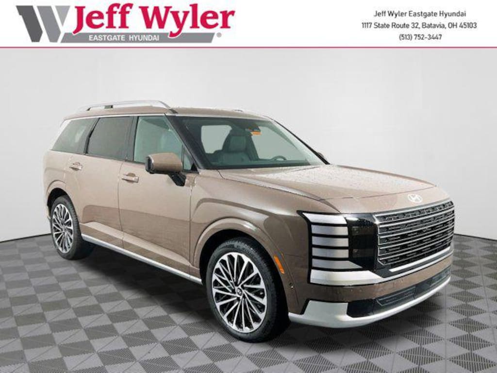 Cast Iron Brown Pearl 2026 Hyundai Palisade Calligraphy V6 AWD 8-Speed Automatic 18/24 City/Highway MPG Jeff Wyler Eastgate Auto Mall is pleased to offer this wonderful-looking 2026 Hyundai Palisade Calligraphy in Cast Iron Brown Pearl. Well equipped with: Option Group 01, 14 Speakers, 3rd row seats: split-bench, 4-Wheel Disc Brakes, ABS brakes, Air Conditioning, Alloy wheels, AM/FM radio: SiriusXM, Apple CarPlay & Android Auto, Audio memory, Auto High-beam Headlights, Auto-dimming door mirrors, Auto-dimming Rear-View mirror, Auto-leveling suspension, Automatic temperature control, Brake assist, Bumpers: body-color, Cargo Organizer, Cargo Tray, Carpeted Floor Mats, Compass, Delay-off headlights, Driver door bin, Driver vanity mirror, Dual front impact airbags, Dual front side impact airbags, Electronic Stability Control, Emergency communication system: Bluelink+, Exterior Parking Camera Rear, First Aid Kit, Four wheel independent suspension, Front anti-roll bar, Front Bucket Seats, Front Center Armrest, Front dual zone A/C, Front reading lights, Fully automatic headlights, Garage door transmitter: HomeLink, Genuine wood console insert, Genuine wood dashboard insert, Heads-Up Display, Heated & Ventilated Front Bucket Seats, Heated door mirrors, Heated front seats, Heated rear seats, Heated steering wheel, HVAC memory, Illuminated entry, Knee airbag, Leather steering wheel, Low tire pressure warning, Memory seat, Navigation System, Occupant sensing airbag, Outside temperature display, Overhead airbag, Overhead console, Panic alarm, Passenger door bin, Passenger vanity mirror, Power door mirrors, Power driver seat, Power Liftgate, Power moonroof, Power passenger seat, Power steering, Power windows, Premium Nappa Leather Seat Trim, Radio data system, Radio: Infotainment Navigation System, Rain sensing wipers, Rear air conditioning, Rear anti-roll bar, Rear audio controls, Rear reading lights, Rear side impact airbag, Rear window defroster, Rear window wiper, Reclining 3rd row seat, Remote keyless entry, Security system, Speed control, Split folding rear seat, Spoiler, Steering wheel mounted audio controls, Tachometer, Telescoping steering wheel, Tilt steering wheel, Traction control, Trip computer, Turn signal indicator mirrors, Variably intermittent wipers, Ventilated front seats, Ventilated rear seats, and Wheels: 21" x 8.5J Alloy.