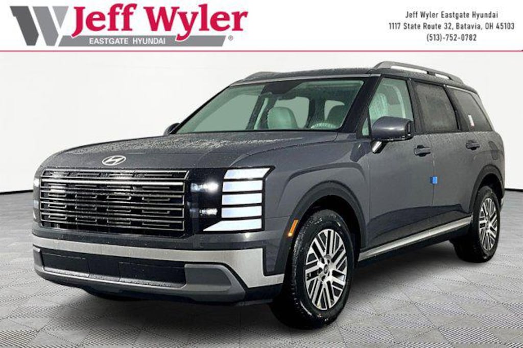 Ecotronic Gray Pearl 2026 Hyundai Palisade Hybrid SEL 7 Passenger 2.5L Turbocharged GDI 4-Cylinder Hybrid AWD 6-Speed Automatic 29/30 City/Highway MPG Jeff Wyler Eastgate Auto Mall is delighted to offer this good-looking 2026 Hyundai Palisade Hybrid SEL in Ecotronic Gray Pearl. Well equipped with: Option Group 01, 100W Charging Cable, 3rd row seats: split-bench, 4-Wheel Disc Brakes, 8 Speakers, ABS brakes, Air Conditioning, Alloy wheels, AM/FM radio: SiriusXM, Apple CarPlay & Android Auto, Auto High-beam Headlights, Auto-dimming Rear-View mirror, Auto-leveling suspension, Automatic temperature control, Brake assist, Bumpers: body-color, Cargo Cover, Cargo Mat, Up Seatback, Cargo Net, Cargo Tray, Carpeted Floor Mats, Compass, Delay-off headlights, Driver door bin, Driver vanity mirror, Dual front impact airbags, Dual front side impact airbags, Electronic Stability Control, Emergency communication system: None, Exterior Parking Camera Rear, First Aid Kit, Four wheel independent suspension, Front anti-roll bar, Front Bucket Seats, Front Center Armrest, Front dual zone A/C, Front reading lights, Fully automatic headlights, H-Tex Leatherette Seat Trim, Heated door mirrors, Heated Front Bucket Seats, Heated front seats, Illuminated entry, Knee airbag, Leather steering wheel, Low tire pressure warning, Navigation System, Occupant sensing airbag, Outside temperature display, Overhead airbag, Overhead console, Panic alarm, Passenger door bin, Passenger vanity mirror, Power door mirrors, Power driver seat, Power Liftgate, Power steering, Power windows, Radio data system, Radio: Infotainment Navigation System, Rear air conditioning, Rear anti-roll bar, Rear audio controls, Rear reading lights, Rear side impact airbag, Rear window defroster, Rear window wiper, Reclining 3rd row seat, Remote keyless entry, Security system, Speed control, Split folding rear seat, Spoiler, Steering wheel mounted audio controls, Tachometer, Telescoping steering wheel, Tilt steering wheel, Traction control, Trip computer, Turn signal indicator mirrors, Variably intermittent wipers, and Wheels: 18" x 8.0J Alloy. 29/30 City/Highway MPG
