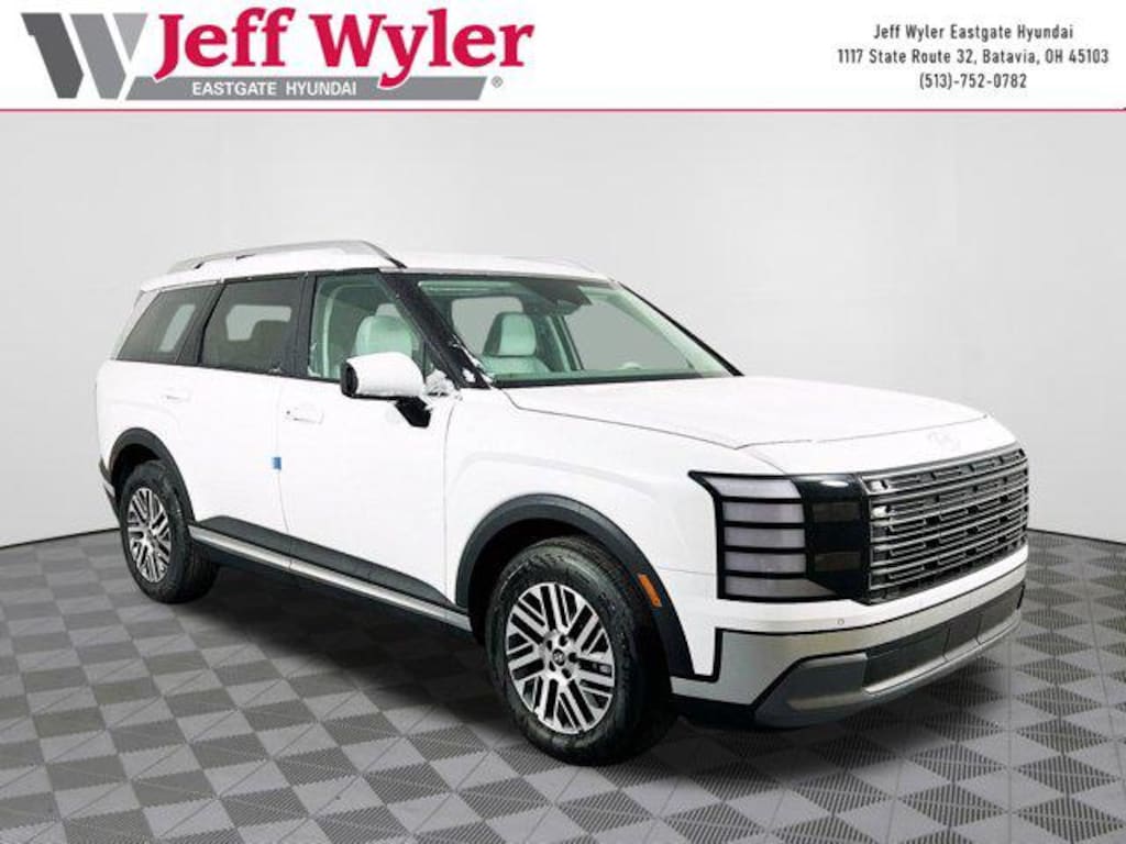 Creamy White Pearl 2026 Hyundai Palisade SEL 7 Passenger V6 AWD 8-Speed Automatic 18/24 City/Highway MPG Jeff Wyler Eastgate Auto Mall is delighted to offer this beautiful-looking 2026 Hyundai Palisade SEL in Creamy White Pearl. Well equipped with: Option Group 01, 3rd row seats: split-bench, 4-Wheel Disc Brakes, 8 Speakers, ABS brakes, Air Conditioning, Alloy wheels, AM/FM radio: SiriusXM, Apple CarPlay & Android Auto, Auto High-beam Headlights, Auto-dimming Rear-View mirror, Auto-leveling suspension, Automatic temperature control, Brake assist, Bumpers: body-color, Cargo Cover, Cargo Mat, Up Seatback, Cargo Net, Carpeted Floor Mats, Compass, Delay-off headlights, Driver door bin, Driver vanity mirror, Dual front impact airbags, Dual front side impact airbags, Electronic Stability Control, Emergency communication system: None, Exterior Parking Camera Rear, First Aid Kit, Four wheel independent suspension, Front anti-roll bar, Front Bucket Seats, Front Center Armrest, Front dual zone A/C, Front reading lights, Fully automatic headlights, H-Tex Leatherette Seat Trim, Heated door mirrors, Heated Front Bucket Seats, Heated front seats, Illuminated entry, Knee airbag, Leather steering wheel, Low tire pressure warning, Navigation System, Occupant sensing airbag, Outside temperature display, Overhead airbag, Overhead console, Panic alarm, Passenger door bin, Passenger vanity mirror, Power door mirrors, Power driver seat, Power Liftgate, Power steering, Power windows, Radio data system, Radio: Infotainment Navigation System, Rear air conditioning, Rear anti-roll bar, Rear audio controls, Rear reading lights, Rear side impact airbag, Rear window defroster, Rear window wiper, Reclining 3rd row seat, Remote keyless entry, Security system, Speed control, Split folding rear seat, Spoiler, Steering wheel mounted audio controls, Tachometer, Telescoping steering wheel, Tilt steering wheel, Traction control, Trip computer, Turn signal indicator mirrors, Variably intermittent wipers, and Wheels: 18" x 8.0J Alloy.