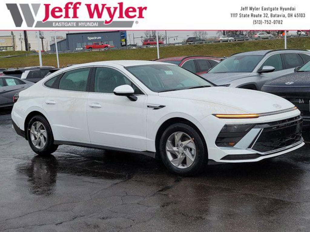Serenity White 2026 Hyundai Sonata SE I4 FWD 8-Speed Automatic 28/38 City/Highway MPG Jeff Wyler Eastgate Auto Mall is delighted to offer this beautiful-looking 2026 Hyundai Sonata SE in Serenity White. Well equipped with: Option Group 01, 16" x 6.5J Aluminum Alloy Wheels, 4-Wheel Disc Brakes, 6 Speakers, ABS brakes, Air Conditioning, Alloy wheels, AM/FM radio: SiriusXM, Apple CarPlay & Android Auto, Auto High-beam Headlights, Brake assist, Bumpers: body-color, Cargo Net, Cargo Tray, Carpeted Floor Mats, Delay-off headlights, Door Panel Protector, Driver door bin, Driver vanity mirror, Dual front impact airbags, Dual front side impact airbags, Electronic Stability Control, Emergency communication system: None, Exterior Parking Camera Rear, First Aid Kit, Four wheel independent suspension, Front anti-roll bar, Front Bucket Seats, Front Center Armrest, Front reading lights, Fully automatic headlights, Illuminated entry, Knee airbag, Low tire pressure warning, Mud Guards, Occupant sensing airbag, Outside temperature display, Overhead airbag, Overhead console, Panic alarm, Passenger door bin, Passenger vanity mirror, Power door mirrors, Power steering, Power windows, Premium Cloth Seating Surfaces, Radio data system, Radio: AM/FM/HD/MP3/SiriusXM, Rear anti-roll bar, Rear side impact airbag, Rear window defroster, Remote keyless entry, Security system, Speed control, Speed-sensing steering, Speed-Sensitive Wipers, Split folding rear seat, Steering wheel mounted audio controls, Tachometer, Telescoping steering wheel, Tilt steering wheel, Traction control, Trip computer, and Variably intermittent wipers. 28/38 City/Highway MPG