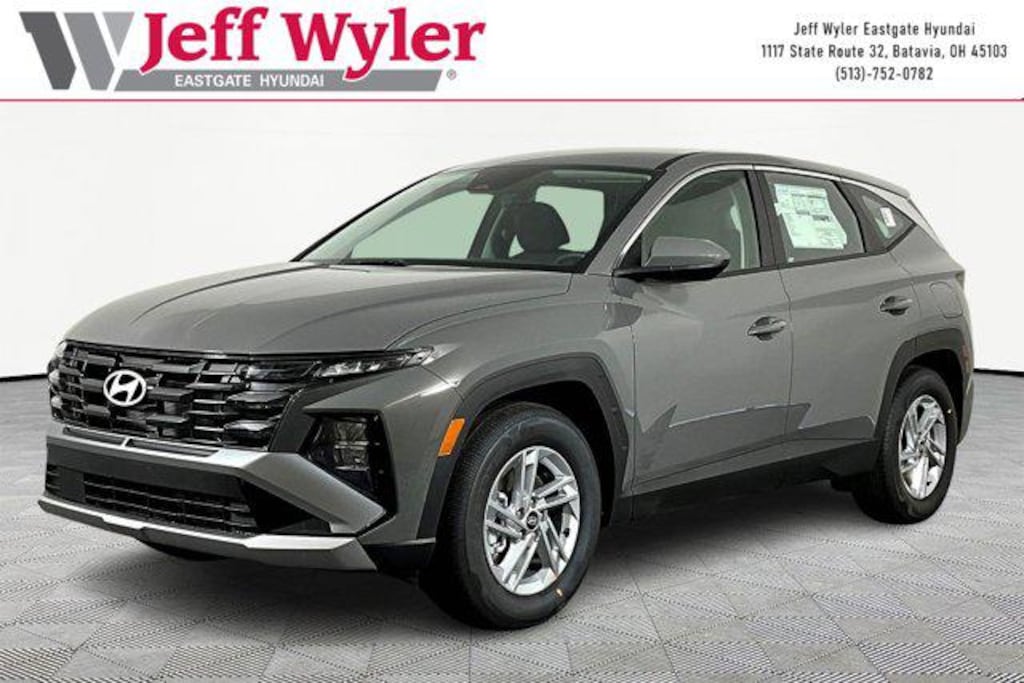 Hampton Gray 2026 Hyundai Tucson SE 2.5L I4 DGI DOHC 16V LEV3-SULEV30 187hp AWD 8-Speed Automatic with SHIFTRONIC 24/30 City/Highway MPG Jeff Wyler Eastgate Auto Mall is pleased to offer this handsome 2026 Hyundai Tucson SE in Hampton Gray. Well equipped with: Option Group 01, 17" x 7.0J Alloy Wheels, 4-Wheel Disc Brakes, 6 Speakers, ABS brakes, Air Conditioning, Alloy wheels, AM/FM radio: SiriusXM, Apple CarPlay & Android Auto, Auto High-beam Headlights, Brake assist, Bumpers: body-color, Cargo Net, Carpeted Floor Mats, Cloth Seat Trim, Delay-off headlights, Driver door bin, Driver vanity mirror, Dual front impact airbags, Dual front side impact airbags, Electronic Stability Control, Emergency communication system: None, Four wheel independent suspension, Front anti-roll bar, Front Bucket Seats, Front Center Armrest, Front reading lights, Fully automatic headlights, Illuminated entry, Low tire pressure warning, Occupant sensing airbag, Outside temperature display, Overhead airbag, Overhead console, Panic alarm, Passenger door bin, Passenger vanity mirror, Power door mirrors, Power steering, Power windows, Radio data system, Radio: AM/FM/HD Audio System, Rear anti-roll bar, Rear reading lights, Rear seat center armrest, Rear side impact airbag, Rear window defroster, Rear window wiper, Remote keyless entry, Security system, Speed control, Split folding rear seat, Spoiler, Steering wheel mounted audio controls, Tachometer, Telescoping steering wheel, Tilt steering wheel, Traction control, Trip computer, and Variably intermittent wipers. 24/30 City/Highway MPG