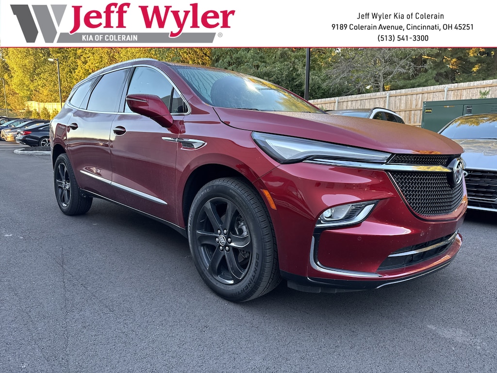 Jeff Wyler Kia of Colerain is delighted to offer this good-looking 2023 Buick Enclave Essence in Cherry Red Tintcoat. Experience Buick Package (Front Power Sliding Moonroof), Floor Liner Package (LPO) (1st & 2nd Row All-Weather Floor Liners (LPO), 3rd Row All-Weather Floor Liner (LPO), and Integrated Cargo Liner (LPO)), Preferred Equipment Group 1SL (Front & Rear Park Assist and Heated Steering Wheel), Sport Touring Edition (Sport Touring Liftgate Badging, Unique Sport Grille w/Body-Color Surround, and Wheels: 20" Gloss Black), 18" Aluminum Wheels, 3.49 Axle Ratio, 3rd row seats: split-bench, 4-Wheel Disc Brakes, 6 Speakers, 6-Speaker Audio System Feature, 6-Way Power Front Passenger Seat Adjuster, 7-Passenger Seating, 8-Way Power Driver Seat Adjuster, ABS brakes, Air Conditioning, Alloy wheels, AM/FM radio: SiriusXM with 360L, Auto High-beam Headlights, Auto-dimming door mirrors, Auto-dimming Rear-View mirror, Automatic temperature control, Brake assist, Bumpers: body-color, Compass, Delay-off headlights, Driver door bin, Driver vanity mirror, Dual front impact airbags, Dual front side impact airbags, Electronic Stability Control, Emergency communication system: OnStar and Buick connected services capable, Four wheel independent suspension, Front anti-roll bar, Front Bucket Seats, Front Center Armrest, Front dual zone A/C, Front reading lights, Fully automatic headlights, Garage door transmitter, Heated door mirrors, Heated Driver & Front Passenger Seats, Heated front seats, Heated steering wheel, Illuminated entry, Leather steering wheel, Low tire pressure warning, Occupant sensing airbag, Outside temperature display, Overhead airbag, Overhead console, Panic alarm, Passenger door bin, Passenger vanity mirror, Perforated Leather-Appointed Seat Trim, Power door mirrors, Power Driver Lumbar Control Seat Adjuster, Power driver seat, Power Liftgate, Power Passenger Lumbar Control Seat Adjuster, Power passenger seat, Power steering, Power windows, Premium audio system: Buick Infotainment System, Radio data system, Radio: Buick Infotainment System AM/FM Stereo, Rear air conditioning, Rear anti-roll bar, Rear reading lights, Rear window defroster, Rear window wiper, Remote keyless entry, Roof rack: rails only, Security system, SiriusXM w/360L, Speed control, Speed-sensing steering, Spoiler, Steering wheel mounted audio controls, Tachometer, Telescoping steering wheel, Tilt steering wheel, Traction control, Trip computer, Turn signal indicator mirrors, Variably intermittent wipers, Voltmeter, and Wireless Apple CarPlay/Wireless Android Auto Our PRE-OWNED vehicles are put through a rigorous 167- POINT QUALITY ASSURANCE INSPECTION along with an average amount of over $1,400.00 SPENT to recondition each vehicle so we can be sure to deliver you the highest quality vehicle like you deserve! ***ONLINE PRICE DOES NOT INCLUDE WYLER FAMILY FIRST PACKAGE***