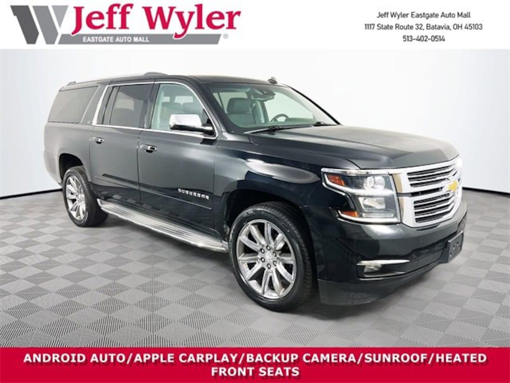Jeff Wyler Eastgate Auto Mall is very proud to offer this charming 2015 Chevrolet Suburban LTZ in Black. Well equipped with: License Plate Front Mounting Package, Magnetic Ride Control Suspension Package, Preferred Equipment Group 1LZ (3rd Row 60/40 Power Fold Split-Bench, Auto-Dimming Inside Rear-View Mirror, Color-Keyed Heated Leather-Wrapped Steering Wheel, Driver & Front Passenger Airbags, Floor Console w/Storage Area, Fog Lamps, Forward Collision Alert Sensor Indicator, Front & Rear Parking Assist, Hands Free Power Liftgate, Heated 2nd Row Seats, Heavy-Duty Locking Rear Differential (DISC), Keyless Start Switch, Lane Departure Warning & Safety Alert Seat, Memory Settings, Passive Entry System, Power Folding & Adjustable Heated Outside Mirrors, Power Release 2nd Row Bucket Seats, Power Tilt & Telescoping Steering Column, Power-Adjustable Accelerator & Brake Pedals, Rear Cross-Traffic Alert Sensor Indicator, Side Blind Zone Alert w/Lane Change Alert, Universal Home Remote, and Wireless Charging), Sun, Entertainment & Destinations Package (3rd Row DVD Screen, Power Tilt-Sliding Sunroof w/Express-Open/Close, and Rear Seat Entertainment System), 10 Speakers, 3.08 Rear Axle Ratio, 3rd row seats: split-bench, 4-Wheel Disc Brakes, ABS brakes, Adaptive suspension, Adjustable pedals, Air Conditioning, Alloy wheels, AM/FM radio: SiriusXM, Auto-dimming door mirrors, Auto-dimming Rear-View mirror, Automatic temperature control, Bodyside moldings, Bose Centerpoint Surround Sound 10-Speaker System, Brake assist, Bumpers: body-color, CD player, Compass, Delay-off headlights, Driver door bin, Driver vanity mirror, Dual front impact airbags, Dual front side impact airbags, Electronic Stability Control, Emergency communication system: OnStar Directions & Connections, Exterior Parking Camera Rear, Front anti-roll bar, Front Bucket Seats, Front Center Armrest, Front Console Organizer, Front dual zone A/C, Front fog lights, Front reading lights, Front Reclining Bucket Seats, Front wheel independent suspension, Fully automatic headlights, Garage door transmitter, Headphones, Heated & Cooled Driver & Front Passenger Seats, Heated door mirrors, Heated front seats, Heated rear seats, Heated steering wheel, High-Intensity Discharge Headlights, Illuminated entry, Leather Shift Knob, Low tire pressure warning, Memory seat, Navigation System, Occupant sensing airbag, OnStar w/4G LTE, Outside temperature display, Overhead airbag, Overhead console, Panic alarm, Passenger door bin, Passenger vanity mirror, Pedal memory, Perforated Leather-Appointed Seat Trim, Power door mirrors, Power driver seat, Power Liftgate, Power passenger seat, Power steering, Power windows, Radio: Chevrolet MyLink w/Navigation/AM/FM Stereo, Rain sensing wipers, Rear air conditioning, Rear anti-roll bar, Rear audio controls, Rear reading lights, Rear window defroster, Rear window wiper, Remote keyless entry, Roof rack: rails only, Security system, Single-Slot CD/MP3 Player, SiriusXM Satellite & HD Radio, Speed control, Speed-sensing steering, Split folding rear seat, Spoiler, Steering wheel memory, Steering wheel mounted audio controls, Tachometer, Telescoping steering wheel, Tilt steering wheel, Traction control, Trip computer, Turn signal indicator mirrors, Variably intermittent wipers, Ventilated front seats, Voltmeter, Wheel Locks, Wheels: 20" x 9" Polished-Aluminum, and Wheels: 22" Premium Painted w/Chrome Inserts. Reviews: * If you want maximum cargo and passenger capacity, combined with 4-wheel-drive (4WD) capability, big-trailer towing capacity, and a luxurious interior, the 2015 Chevrolet Suburban is your best pick. Source: KBB.com * Seats up to nine people; big cargo capacity; quiet highway ride; strong V8 power; high-quality interior. Source: EdmundsAwards: * 2015 KBB.com Best Resale Value Awards Ask about available certifications. Used vehicles 10 years of age or newer with less than 100,000 miles are eligible for the Wyler Assurance Program, but eligible vehicl