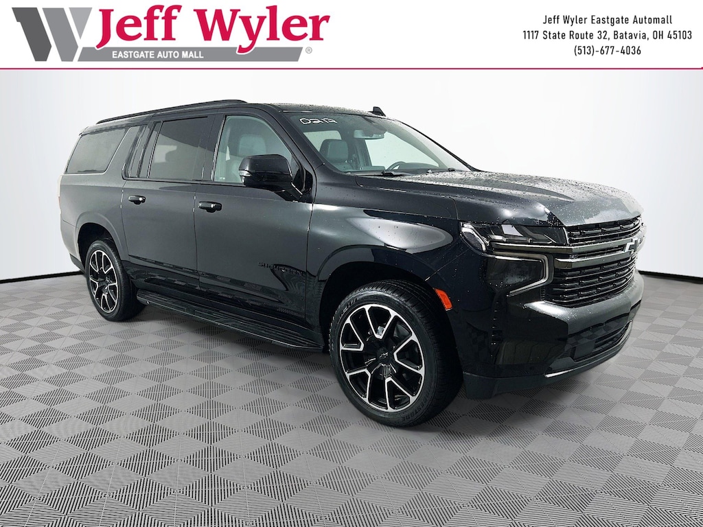 Jeff Wyler Eastgate Auto Mall is honored to offer this stunning 2021 Chevrolet Suburban RST in Black. Well equipped with: Driver Alert Package (Front & Rear Park Assist, Lane Change Alert w/Side Blind Zone Alert, Lane Keep Assist w/Lane Departure Warning, and Rear Cross Traffic Alert), Luxury Package (2nd Row Pwr Release 60/40 Split-Folding Bench Seat, 3rd Row 60/40 Power-Folding Split-Bench, Automatic Heated Steering Wheel, HD Surround Vision, Heated 2nd Row Outboard Seats, Memory Settings, Outside Heated Power-Adjustable Mirrors, Power Tilt & Telescopic Steering Column, and Rear Pedestrian Alert), Preferred Equipment Group 1SP (10-Way Power Driver & Passenger Seat Adjusters, 1st & 2nd Row Color-Keyed Carpeted Floor Mats, 2 USB Data Ports, Auto-Dimming Inside Rear-View Mirror, Bose 9-Speaker Stereo Audio System Feature, Bright Front & Rear Door Sill Plates, Color-Keyed Carpeting Floor Covering, Driver & Front Outboard Passenger Airbags, Floor Console w/Storage Area, Hands-Free Rear Power Programmable Liftgate, HD Radio, Heated Driver & Front Passenger Seats, Infotainment Display, Leather-Wrapped Steering Wheel, LED Daytime Running Lamps, Memory Settings For Driver, Remote Start, SiriusXM Radio w/360L, and Universal Home Remote), 3.23 Rear Axle Ratio, 3rd row seats: split-bench, 4-Wheel Disc Brakes, 9 Speakers, ABS brakes, Air Conditioning, Alloy wheels, AM/FM radio: SiriusXM with 360L, Apple CarPlay/Android Auto, Auto High-beam Headlights, Auto-dimming Rear-View mirror, Automatic temperature control, Brake assist, Bumpers: body-color, Compass, Delay-off headlights, Driver door bin, Driver vanity mirror, Dual front impact airbags, Dual front side impact airbags, Dual-Pane Power Panoramic Sunroof, Electronic Stability Control, Emergency communication system: OnStar and Chevrolet connected services capable, Four wheel independent suspension, Front anti-roll bar, Front Bucket Seats, Front Center Armrest, Front dual zone A/C, Front reading lights, Fully automatic headlights, Garage door transmitter, Heated door mirrors, Heated front seats, Illuminated entry, Leather steering wheel, Low tire pressure warning, Memory seat, Occupant sensing airbag, Outside temperature display, Overhead airbag, Overhead console, Panic alarm, Passenger door bin, Passenger vanity mirror, Perforated Leather Seating Surfaces, Power door mirrors, Power driver seat, Power Liftgate, Power passenger seat, Power Release 2nd Row Bucket Seats, Power steering, Power windows, Premium audio system: Chevrolet Infotainment 3 Plus, Premium Smooth Ride Suspension, Radio: Chevrolet Infotainment 3 Plus System, Rain sensing wipers, Rear air conditioning, Rear anti-roll bar, Rear reading lights, Rear seat center armrest, Rear window defroster, Rear window wiper, Remote keyless entry, Roof rack: rails only, Security system, Speed control, Speed-sensing steering, Split folding rear seat, Spoiler, Steering wheel mounted audio controls, Tachometer, Telescoping steering wheel, Tilt steering wheel, Traction control, Trip computer, Variably intermittent wipers, Voltmeter, Wheel Locks (Set of 4) (LPO), and Wheels: 22" x 9" Bright Machined. Ask about available certifications. Used vehicles 10 years of age or newer with less than 100,000 miles are eligible for the Wyler Assurance Program, but eligible vehicles must pass our reconditioning process and multi-point inspection. Provided the vehicle passes inspection, vehicles will be eligible for the 6 month/6,000 mile limited warranty. The 6 month/6,000 mile limited warranty is NOT available on AS-IS vehicles, wholesale vehicles, lease buyback/pass-thru vehicles or un-inspected vehicles. Note that this program can also apply to vehicles where the remaining factory coverage is less than 6 months or 6,000 miles. Please check the Federal Trade Commission (FTC) Buyers guide on the vehicle for full details as to whether or not warranty coverage may apply. Contact Dealer for additional details. The Wyler Assurance 6 month/6,000 Mile limited
