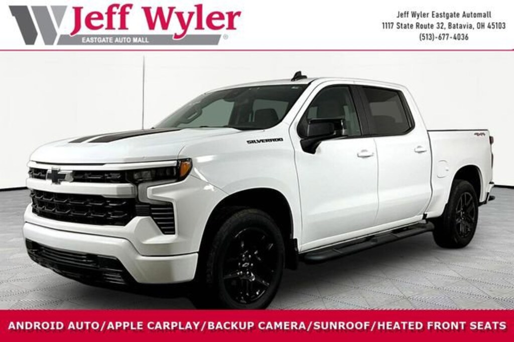 Jeff Wyler Eastgate Auto Mall is very proud to offer this charming-looking 2022 Chevrolet Silverado 1500 RST in Summit White. Well equipped with: Convenience Package (10-Way Power Driver Seat w/Lumbar, 120-Volt Bed Mounted Power Outlet, 120-Volt Instrument Panel Power Outlet, Dual Rear USB Ports (Charge Only), Dual-Zone Automatic Climate Control, Electric Rear-Window Defogger, Heated Driver & Front Outboard Passenger Seats, Heated Steering Wheel, Keyless Open & Start, Leather Wrapped Steering Wheel, Manual Tilt/Telescoping Steering Column, Remote Vehicle Starter System, and Theft Deterrent System (Unauthorized Entry)), Convenience Package II (Hitch Guidance w/Hitch View, Integrated Trailer Brake Controller, Power Sliding Rear Window w/Rear Defogger, Premium Bose 7-Speaker Sound System, Trailering App, and Universal Home Remote), High Capacity Suspension Package, Preferred Equipment Group 1SP (12.3" Multicolor Reconfigurable Digital Display, 6-Speaker Audio System, All-Star Edition, Auto-Locking Rear Differential, Bluetooth® For Phone, Chevrolet Connected Access Capable, Color-Keyed Carpeting Floor Covering, Compass, Deep-Tinted Glass, Electrical Steering Column Lock, Electronic Cruise Control, EZ Lift Power Lock & Release Tailgate, Front Frame-Mounted Black Recovery Hooks, Front LED Fog Lamps, Front Rubberized Vinyl Floor Mats, HD Rear Vision Camera, Heated Power-Adjustable Outside Mirrors, High Gloss Black Mirror Caps, Inside Rear-View Mirror w/Tilt, LED Cargo Area Lighting, OnStar & Chevrolet Connected Services Capable, Power Front Windows w/Driver Express Up/Down, Power Front Windows w/Passenger Express Down, Power Rear Windows w/Express Down, Rear 60/40 Folding Bench Seat (Folds Up), Rear Rubberized-Vinyl Floor Mats, SiriusXM w/360L, Standard Tailgate, Steering Wheel Audio Controls, Wi-Fi Hot Spot Capable, and Wireless Phone Projection), Protection Package (Chevytec Spray-On Black Bedliner and Rear Wheelhouse Liners), Rally Edition (4" Black Round Assist Steps (LPO) and Wheels: 20" x 9" High Gloss Black Painted Alum), Standard Suspension Package, Trailering Package (Hitch Guidance), 2 USB Data Ports, 220 Amp Alternator, 3.23 Rear Axle Ratio, 4-Wheel Disc Brakes, 40/20/40 Front Split-Bench Seat, 6 Speakers, ABS brakes, Air Conditioning, All-Weather Floor Liner (LPO), Alloy wheels, AM/FM radio: SiriusXM with 360L, Apple CarPlay/Android Auto, Auto High-beam Headlights, Automatic Emergency Braking, Automatic temperature control, Brake assist, Bumpers: body-color, Cloth Seat Trim, Delay-off headlights, Driver door bin, Driver vanity mirror, Dual Exhaust w/Polished Outlets, Dual front impact airbags, Dual front side impact airbags, Electronic Stability Control, Electronic Transmission Range Selector Shifter, Floor Mounted Center Console, Following Distance Indicator, Forward Collision Alert, Front anti-roll bar, Front Bucket Seats, Front Center Armrest w/Storage, Front dual zone A/C, Front fog lights, Front Pedestrian Braking, Front reading lights, Front wheel independent suspension, Fully automatic headlights, Heated door mirrors, Heated front seats, Heated steering wheel, Illuminated entry, IntelliBeam Automatic High Beam On/Off, Lane Keep Assist w/Lane Departure Warning, Low tire pressure warning, Not Equipped w/Dynamic Fuel Management, Not Equipped w/Steering Column Lock, Occupant sensing airbag, Outside temperature display, Overhead airbag, Overhead console, Panic alarm, Passenger door bin, Passenger vanity mirror, Power door mirrors, Power driver seat, Power steering, Power Sunroof, Power windows, Premium audio system: Chevrolet Infotainment 3 Premium, Radio data system, Radio: Chevrolet Infotainment 3 Premium System, Rear reading lights, Rear step bumper, Rear window defroster, Remote keyless entry, Security system, Speed control, Speed-sensing steering, Split folding rear seat, Steering wheel mounted audio controls, Tachometer, Telescoping steering wheel, Tilt steering wheel, Traction control, Trip computer, Variably in