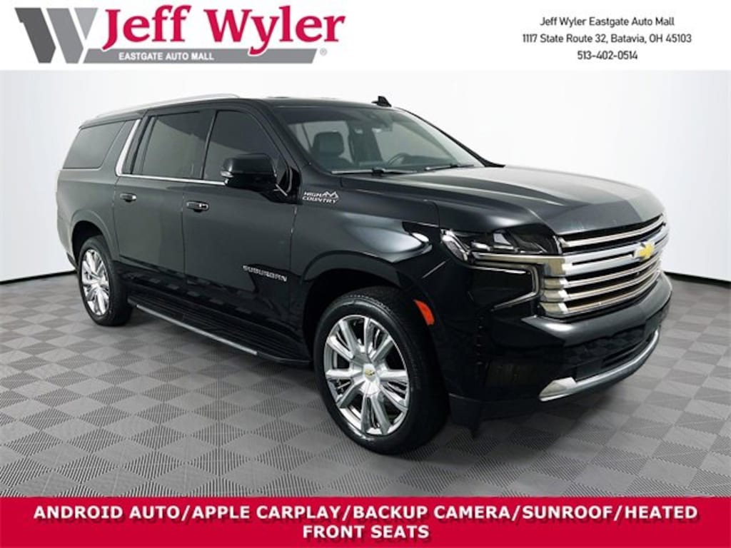 Jeff Wyler Eastgate Auto Mall is delighted to offer this beautiful 2022 Chevrolet Suburban High Country in Black. Well equipped with: Advanced Trailering Package (Hitch Guidance w/Hitch View, Integrated Trailer Brake Controller, Smart Trailer Integration Indicator, and Trailer Side Blind Zone Alert), Max Trailering Package (Extra Capacity Cooling System), Preferred Equipment Group 3LZ (15" Diagonal Multi-Color Head-Up Display, 1st & 2nd Row Color-Keyed Carpeted Floor Mats, 2-Speed Active Electronic AutoTrac Transfer Case, 3rd Row 60/40 Power-Folding Split-Bench, Automatic Stop/Start, Bose 10-Speaker Surround w/CenterPoint, Bright Front & Rear Door Sill Plates, Chrome Door Handles w/Body-Color Strip, Color-Keyed Carpeting Floor Covering, Driver & Front Outboard Passenger Airbags, Dual Exhaust System, Enhanced Driver Information Center, Floor Console, Front & Rear Park Assist, Hands-Free Rear Power Programmable Liftgate, HD Surround Vision, Heated & Ventilated Driver & Front Passenger Seats, Heated 2nd Row Outboard Seats, Heated Driver & Front Passenger Seats, Heated Steering Wheel, Hill Descent Control, Infotainment Display, Inside Rearview Auto-Dimming Rear Camera Mirror, Lane Change Alert w/Side Blind Zone Alert, Leather-Wrapped Steering Wheel, LED Daytime Running Lamps, Memory Settings, Outside Heated Power-Adjustable Mirrors, Power Release 2nd Row Bucket Seats, Power Tilt & Telescopic Steering Column, Rear Camera Mirror Washer, Rear Cross Traffic Alert, Rear Pedestrian Alert, Remote Start, Safety Alert Seat, SiriusXM Radio w/360L, Start/Stop System Disable Button, Universal Home Remote, and Wireless Charging), 10 Speakers, 3.23 Rear Axle Ratio, 3rd row seats: split-bench, 4-Wheel Disc Brakes, ABS brakes, Adaptive suspension, Air Conditioning, Alloy wheels, AM/FM radio: SiriusXM with 360L, Apple CarPlay/Android Auto, Auto High-beam Headlights, Auto-dimming door mirrors, Auto-dimming Rear-View mirror, Auto-leveling suspension, Automatic temperature control, Brake assist, Bumpers: body-color, Compass, Delay-off headlights, Driver door bin, Driver vanity mirror, Dual front impact airbags, Dual front side impact airbags, Dual-Pane Power Panoramic Sunroof, Electronic Stability Control, Emergency communication system: OnStar and Chevrolet connected services capable, Engine Block Heater, Four wheel independent suspension, Front anti-roll bar, Front Bucket Seats, Front Center Armrest, Front dual zone A/C, Front reading lights, Fully automatic headlights, Garage door transmitter, Heads-Up Display, Heated door mirrors, Heated front seats, Heated rear seats, Heated steering wheel, Illuminated entry, Leather steering wheel, Low tire pressure warning, Magnetic Ride Control Suspension, Memory seat, Navigation System, Not Equipped w/4-Way Driver & Fr Pass Pwr Lumbar, Not Equipped w/Steering Column Lock, Occupant sensing airbag, Outside temperature display, Overhead airbag, Overhead console, Panic alarm, Passenger door bin, Passenger vanity mirror, Perforated Leather Seating Surfaces, Power door mirrors, Power driver seat, Power Liftgate, Power passenger seat, Power steering, Power windows, Premium audio system: Chevrolet Infotainment 3 Premium, Radio: Chevrolet Infotainment 3 Premium System, Rain sensing wipers, Rear air conditioning, Rear anti-roll bar, Rear reading lights, Rear window defroster, Rear window wiper, Remote keyless entry, Roof rack: rails only, Security system, Speed control, Speed-sensing steering, Split folding rear seat, Spoiler, Steering wheel memory, Steering wheel mounted audio controls, Tachometer, Telescoping steering wheel, Tilt steering wheel, Traction control, Trip computer, Turn signal indicator mirrors, Variably intermittent wipers, Ventilated front seats, Voltmeter, Wheel Locks (Set of 4) (LPO), and Wheels: 22" x 9" Sterling Silver Premium Painted. CARFAX One-Owner. Clean CARFAX. Ask about available certifications. Used vehicles 10 years of age or newer with less than 100,000 miles are eligible for the Wyler A