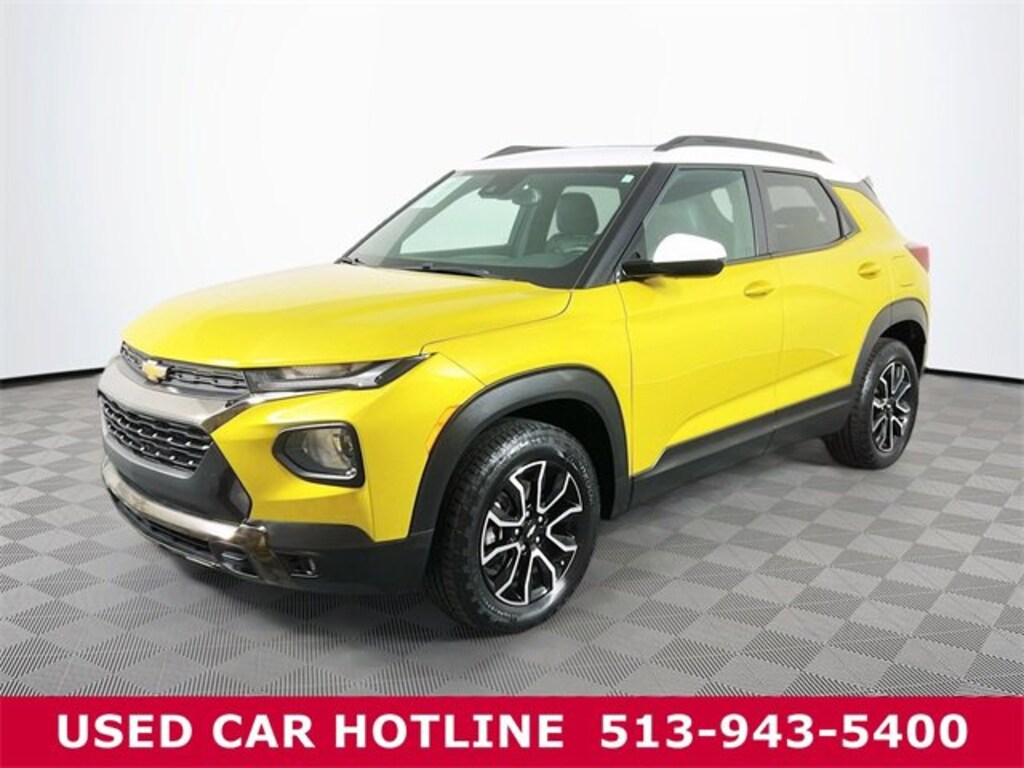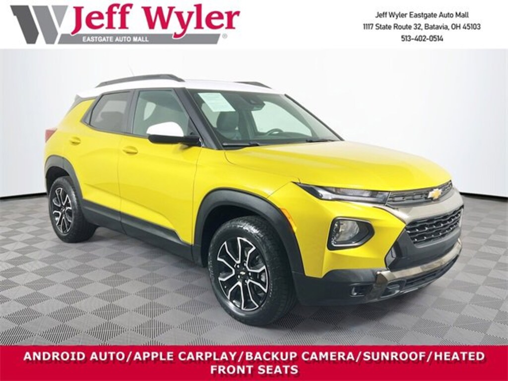 Jeff Wyler Eastgate Auto Mall is pumped up to offer this terrific-looking 2023 Chevrolet TrailBlazer ACTIV in Nitro Yellow Metallic. Well equipped with: Convenience Package (1 Type-A & 1 Type-C USB Charging-Only Ports, 120-Volt Power Outlet, 8" Diagonal Color Touchscreen Display, Cabin Humidity Sensor, Driver & Front Passenger Illuminated Vanity Mirrors, Inside Rear-View Auto-Dimming Mirror, and Single-Zone Auto Climate Control Air Conditioning), Driver Confidence Package (Lane Change Alert w/Side Blind Zone Alert, Rear Cross Traffic Alert, and Rear Park Assist), Preferred Equipment Group 1SA (Heated Steering Wheel), Sun & Liftgate Package (Dual-Pane Panoramic Power Sunroof and Hands-Free Power Programmable Liftgate), 2-Way Adjustable Front Head Restraints, 2-Way Power Driver Lumbar Seat Adjuster, 3.17 Axle Ratio, 4-Way Manual Front Passenger Seat Adjuster, 4-Wheel Disc Brakes, 6 Speakers, 6-Speaker Audio System Feature w/Amplifier, 7" Diagonal Color Touchscreen, 8-Way Power Driver Seat Adjuster, ABS brakes, Air Conditioning, Alloy wheels, AM/FM radio: SiriusXM, Auto High-beam Headlights, Brake assist, Bumpers: body-color, Compass, Delay-off headlights, Driver door bin, Driver vanity mirror, Dual front impact airbags, Dual front side impact airbags, Electronic Stability Control, Emergency communication system: OnStar and Chevrolet connected services capable, Exterior Parking Camera Rear, Flat-Folding Front Passenger Seatback, Front & Rear Black Bowtie Emblems (LPO), Front anti-roll bar, Front Bucket Seats, Front Center Armrest, Front fog lights, Front License Plate Bracket, Front reading lights, Front wheel independent suspension, Fully automatic headlights, Heated door mirrors, Heated Driver & Front Passenger Seats, Heated front seats, Heated steering wheel, Illuminated entry, Knee airbag, Leather Shift Knob, Leather steering wheel, Leatherette Seat Trim, Low tire pressure warning, Not Equipped w/Rear Park Assist (060), Occupant sensing airbag, Overhead airbag, Overhead console, Panic alarm, Passenger door bin, Passenger vanity mirror, Power door mirrors, Power driver seat, Power steering, Power windows, Radio data system, Radio: Chevrolet Infotainment 3 System, Rear seat center armrest, Rear side impact airbag, Rear window defroster, Rear window wiper, Remote keyless entry, Ride & Handling Suspension, Security system, SiriusXM Radio, Speed control, Split folding rear seat, Spoiler, Steering wheel mounted audio controls, Summit White Two-Tone Roof, Tachometer, Telescoping steering wheel, Tilt steering wheel, Traction control, Trip computer, Variably intermittent wipers, Wheels: 17" High Gloss Black Machined Aluminum, and Wireless Apple CarPlay/Android Auto. CARFAX One-Owner. Clean CARFAX. Ask about available certifications. Used vehicles 10 years of age or newer with less than 100,000 miles are eligible for the Wyler Assurance Program, but eligible vehicles must pass our reconditioning process and multi-point inspection. Provided the vehicle passes inspection, vehicles will be eligible for the 6 month/6,000 mile limited warranty. The 6 month/6,000 mile limited warranty is NOT available on AS-IS vehicles, wholesale vehicles, lease buyback/pass-thru vehicles or un-inspected vehicles. Note that this program can also apply to vehicles where the remaining factory coverage is less than 6 months or 6,000 miles. Please check the Federal Trade Commission (FTC) Buyers guide on the vehicle for full details as to whether or not warranty coverage may apply. Contact Dealer for additional details. The Wyler Assurance 6 month/6,000 Mile limited warranty ends 6 months from the date of the Retail Purchase Agreement (BUYERS ORDER) or when the vehicle's odometer registers 6,000 additional miles to the mileage listed on the BUYERS ORDER, whichever comes first. Your Deductible - The warranty holder on your contract pays the first $100 of each covered repair.