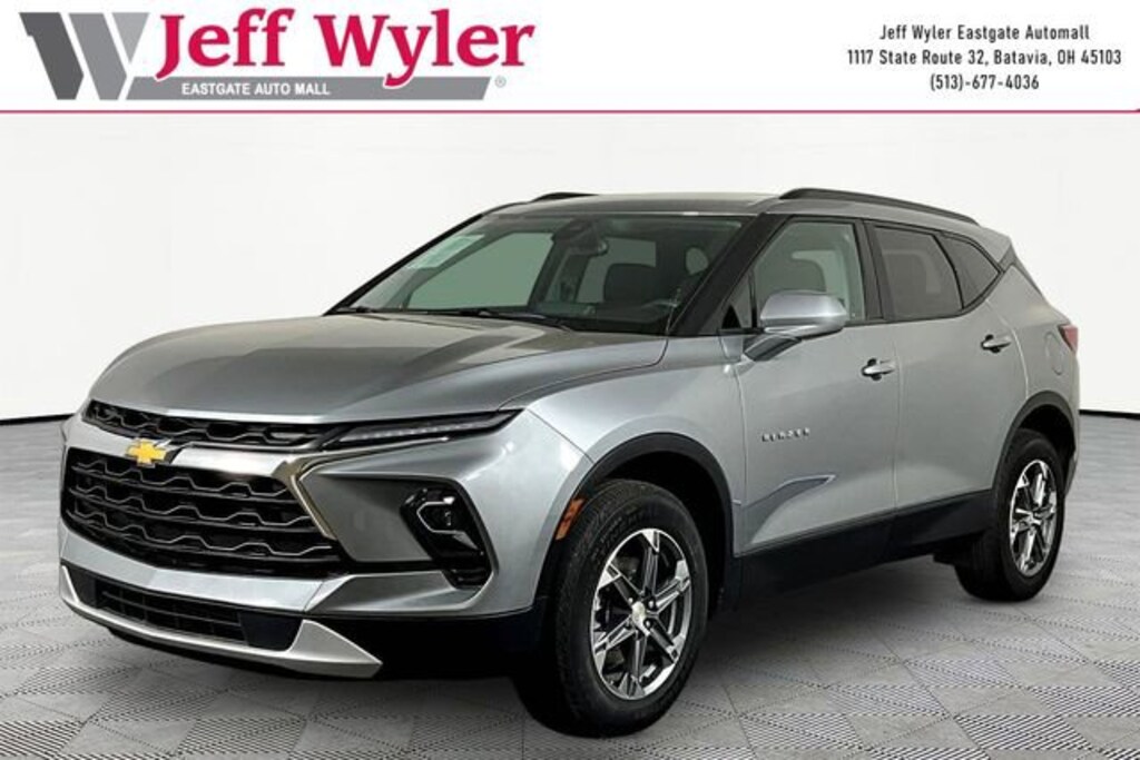 Jeff Wyler Eastgate Auto Mall is pleased to offer this good-looking 2024 Chevrolet Blazer LT in Sterling Gray Metallic. Well equipped with: Convenience Package (Adaptive Cruise Control, Black Roof-Mounted Side Rails, Enhanced Automatic Emergency Braking, Inside Rear-View Auto-Dimming Mirror, Rear Power Programmable Liftgate, Universal Home Remote, and Wireless Charging), Driver Confidence Package (Lane Change Alert w/Side Blind Zone Alert, Rear Cross Traffic Alert, and Rear Park Assist w/Audible Warning), Floor Liner Package (LPO) (1st & 2nd Row All-Weather Floor Liners (LPO) and Integrated Cargo Liner (LPO)), Preferred Equipment Group 2LT, 170 Amp Alternator, 3.47 Final Drive Axle Ratio, 4-Way Manual Front Passenger Seat Adjuster, 4-Wheel Disc Brakes, 6 Speakers, 6-Speaker Audio System Feature, 8-Way Power Driver Seat Adjuster, ABS brakes, Air Conditioning, Alloy wheels, AM/FM radio: SiriusXM with 360L, Apple CarPlay/Android Auto, Auto High-beam Headlights, Automatic temperature control, Brake assist, Bumpers: body-color, Child-Seat-Sensing Airbag, Compass, Delay-off headlights, Driver door bin, Driver vanity mirror, Dual front impact airbags, Dual front side impact airbags, Electronic Stability Control, Emergency communication system: OnStar and Chevrolet connected services capable, Four wheel independent suspension, Front anti-roll bar, Front Bucket Seats, Front Center Armrest, Front dual zone A/C, Front reading lights, Fully automatic headlights, Heated door mirrors, Heated Driver & Front Passenger Seats, Heated front seats, Illuminated entry, Knee airbag, Leather Shift Knob, Low tire pressure warning, Occupant sensing airbag, Outside temperature display, Overhead airbag, Overhead console, Panic alarm, Passenger door bin, Passenger vanity mirror, Power door mirrors, Power Driver Lumbar Control, Power driver seat, Power steering, Power windows, Premium audio system: Chevrolet Infotainment 3 Plus, Premium Cloth Seat Trim, Radio data system, Radio: Chevrolet Infotainment 3 Plus System, Rear anti-roll bar, Rear reading lights, Rear seat center armrest, Rear window defroster, Rear window wiper, Remote keyless entry, Ride & Handling Suspension, Security system, SiriusXM w/360L, Speed control, Speed-sensing steering, Split folding rear seat, Spoiler, Steering wheel mounted audio controls, Tachometer, Telescoping steering wheel, Tilt steering wheel, Traction control, Trip computer, Variably intermittent wipers, Voltmeter, and Wheels: 18" Grazen Metallic Aluminum. Ask about available certifications. Used vehicles 10 years of age or newer with less than 100,000 miles are eligible for the Wyler Assurance Program, but eligible vehicles must pass our reconditioning process and multi-point inspection. Provided the vehicle passes inspection, vehicles will be eligible for the 6 month/6,000 mile limited warranty. The 6 month/6,000 mile limited warranty is NOT available on AS-IS vehicles, wholesale vehicles, lease buyback/pass-thru vehicles or un-inspected vehicles. Note that this program can also apply to vehicles where the remaining factory coverage is less than 6 months or 6,000 miles. Please check the Federal Trade Commission (FTC) Buyers guide on the vehicle for full details as to whether or not warranty coverage may apply. Contact Dealer for additional details. The Wyler Assurance 6 month/6,000 Mile limited warranty ends 6 months from the date of the Retail Purchase Agreement (BUYERS ORDER) or when the vehicle's odometer registers 6,000 additional miles to the mileage listed on the BUYERS ORDER, whichever comes first. Your Deductible - The warranty holder on your contract pays the first $100 of each covered repair.