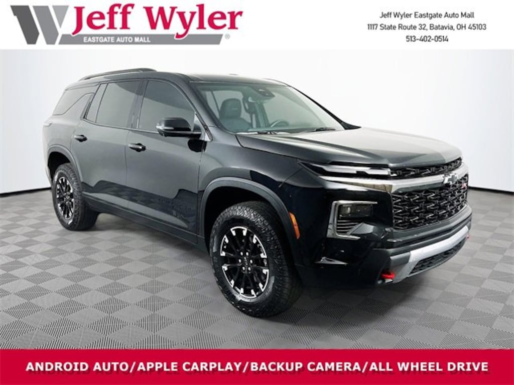 Jeff Wyler Eastgate Auto Mall is very proud to offer this good-looking 2025 Chevrolet Traverse Z71 in Mosaic Black Metallic. Well equipped with: Driver Confidence Package (HD Surround Vision, Power Outlet, Rear Pedestrian Alert, and Traffic Sign Recognition), Floor Liner Package (LPO) (1st & 2nd Row All-Weather Floor Liners (LPO) and 3rd Row All-Weather Floor Liner (LPO)), Preferred Equipment Group 2Z7, 3rd row seats: split-bench, 4-Way Manual Front Passenger Seat Adjuster, 4-Wheel Disc Brakes, 6 Speakers, 6-Speaker Audio System Feature, 8-Way Power Driver Seat Adjuster, ABS brakes, Air Conditioning, Alloy wheels, AM/FM radio: SiriusXM with 360L, Apple CarPlay/Android Auto, Auto High-beam Headlights, Automatic temperature control, Brake assist, Cargo Mat, Child-Seat-Sensing Airbag, Compass, Delay-off headlights, Driver door bin, Driver vanity mirror, Dual front impact airbags, Dual front side impact airbags, Electronic Stability Control, Emergency communication system: OnStar, Evotex Seat Trim, Four wheel independent suspension, Front anti-roll bar, Front Bucket Seats, Front Center Armrest, Front dual zone A/C, Front reading lights, Fully automatic headlights, Heated door mirrors, Heated front seats, Heated steering wheel, Illuminated entry, Low tire pressure warning, Navigation System, Occupant sensing airbag, Outside temperature display, Overhead airbag, Overhead console, Panic alarm, Passenger door bin, Passenger vanity mirror, Power door mirrors, Power driver seat, Power Liftgate, Power steering, Power windows, Radio data system, Radio: Audio System w/17.7" Diagonal Display, Rear air conditioning, Rear anti-roll bar, Rear reading lights, Rear window defroster, Rear window wiper, Remote keyless entry, Security system, SiriusXM w/360L Trial Subscription, Speed control, Speed-sensing steering, Spoiler, Steering wheel mounted audio controls, Tachometer, Telescoping steering wheel, Tilt steering wheel, Traction control, Trip computer, Turn signal indicator mirrors, Variably intermittent wipers, Voltmeter, and Wheels: 18" High Gloss Black Painted Aluminum. CARFAX One-Owner. Clean CARFAX. Ask about available certifications. Used vehicles 10 years of age or newer with less than 100,000 miles are eligible for the Wyler Assurance Program, but eligible vehicles must pass our reconditioning process and multi-point inspection. Provided the vehicle passes inspection, vehicles will be eligible for the 6 month/6,000 mile limited warranty. The 6 month/6,000 mile limited warranty is NOT available on AS-IS vehicles, wholesale vehicles, lease buyback/pass-thru vehicles or un-inspected vehicles. Note that this program can also apply to vehicles where the remaining factory coverage is less than 6 months or 6,000 miles. Please check the Federal Trade Commission (FTC) Buyers guide on the vehicle for full details as to whether or not warranty coverage may apply. Contact Dealer for additional details. The Wyler Assurance 6 month/6,000 Mile limited warranty ends 6 months from the date of the Retail Purchase Agreement (BUYERS ORDER) or when the vehicle's odometer registers 6,000 additional miles to the mileage listed on the BUYERS ORDER, whichever comes first. Your Deductible - The warranty holder on your contract pays the first $100 of each covered repair.