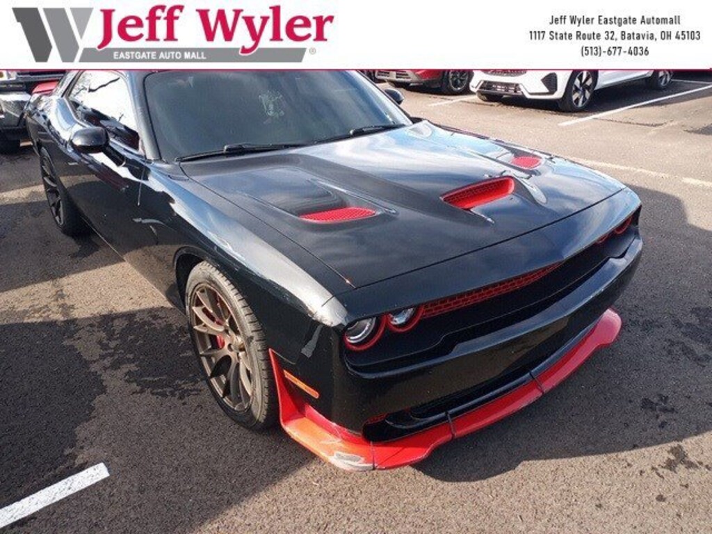 Jeff Wyler Eastgate Auto Mall is honored to offer this attractive 2016 Dodge Challenger SRT Hellcat in Pitch Black Clearcoat. Well equipped with: Quick Order Package 25R SRT Hellcat, 18 Speakers, 4-Wheel Disc Brakes, ABS brakes, Adaptive suspension, Air Conditioning, Alloy wheels, AM/FM radio: SiriusXM, Anti-whiplash front head restraints, Auto High-beam Headlights, Auto-dimming Rear-View mirror, Automatic temperature control, Brake assist, Bumpers: body-color, Compass, Delay-off headlights, Driver door bin, Driver vanity mirror, Dual front impact airbags, Dual front side impact airbags, Electronic Stability Control, Emergency communication system: Uconnect Access, Four wheel independent suspension, Front anti-roll bar, Front Bucket Seats, Front Center Armrest, Front dual zone A/C, Front reading lights, Fully automatic headlights, Garage door transmitter: HomeLink, harman/kardon® Speakers, Heated door mirrors, Heated front seats, Heated steering wheel, High-Intensity Discharge Headlights, Illuminated entry, Laguna Performance Seats w/SRT Embossed Logo, Leather Shift Knob, Low tire pressure warning, Navigation System, Outside temperature display, Overhead airbag, Overhead console, Panic alarm, ParkView Rear Back-Up Camera, Passenger door bin, Passenger vanity mirror, Pirelli Brand Tires, Power door mirrors, Power driver seat, Power steering, Power Sunroof, Power windows, Radio data system, Radio: Uconnect 8.4 NAV, Rain sensing wipers, Rear anti-roll bar, Rear reading lights, Rear seat center armrest, Rear window defroster, Red Seat Belts, Remote keyless entry, Security system, Speed control, Speed-sensing steering, Split folding rear seat, Spoiler, Steering wheel mounted audio controls, Tachometer, Telescoping steering wheel, Tilt steering wheel, Traction control, Trip computer, Variably intermittent wipers, Ventilated front seats, Wheels: 20" x 9.5" Brass Monkey SRT Forged, and Wheels: 20" x 9.5" SRT Low-Gloss Black Forged. Clean CARFAX. Reviews: * Strong engine choices, topped by the insane 707-hp Hellcat V8; actual room for four adults; an enormous trunk, especially compared to rivals; highly customizable thanks to a huge number of options; relatively supple ride, especially on the highway; touchscreen interface is packed with features and easy to use. Source: EdmundsAwards: * JD Power Initial Quality Study (IQS), Vehicle Dependability Study (VDS) * JD Power Initial Quality Study (IQS) * JD Power Initial Quality Study (IQS), Vehicle Dependability Study Ask about available certifications. Used vehicles 10 years of age or newer with less than 100,000 miles are eligible for the Wyler Assurance Program, but eligible vehicles must pass our reconditioning process and multi-point inspection. Provided the vehicle passes inspection, vehicles will be eligible for the 6 month/6,000 mile limited warranty. The 6 month/6,000 mile limited warranty is NOT available on AS-IS vehicles, wholesale vehicles, lease buyback/pass-thru vehicles or un-inspected vehicles. Note that this program can also apply to vehicles where the remaining factory coverage is less than 6 months or 6,000 miles. Please check the Federal Trade Commission (FTC) Buyers guide on the vehicle for full details as to whether or not warranty coverage may apply. Contact Dealer for additional details. The Wyler Assurance 6 month/6,000 Mile limited warranty ends 6 months from the date of the Retail Purchase Agreement (BUYERS ORDER) or when the vehicle's odometer registers 6,000 additional miles to the mileage listed on the BUYERS ORDER, whichever comes first. Your Deductible - The warranty holder on your contract pays the first $100 of each covered repair.