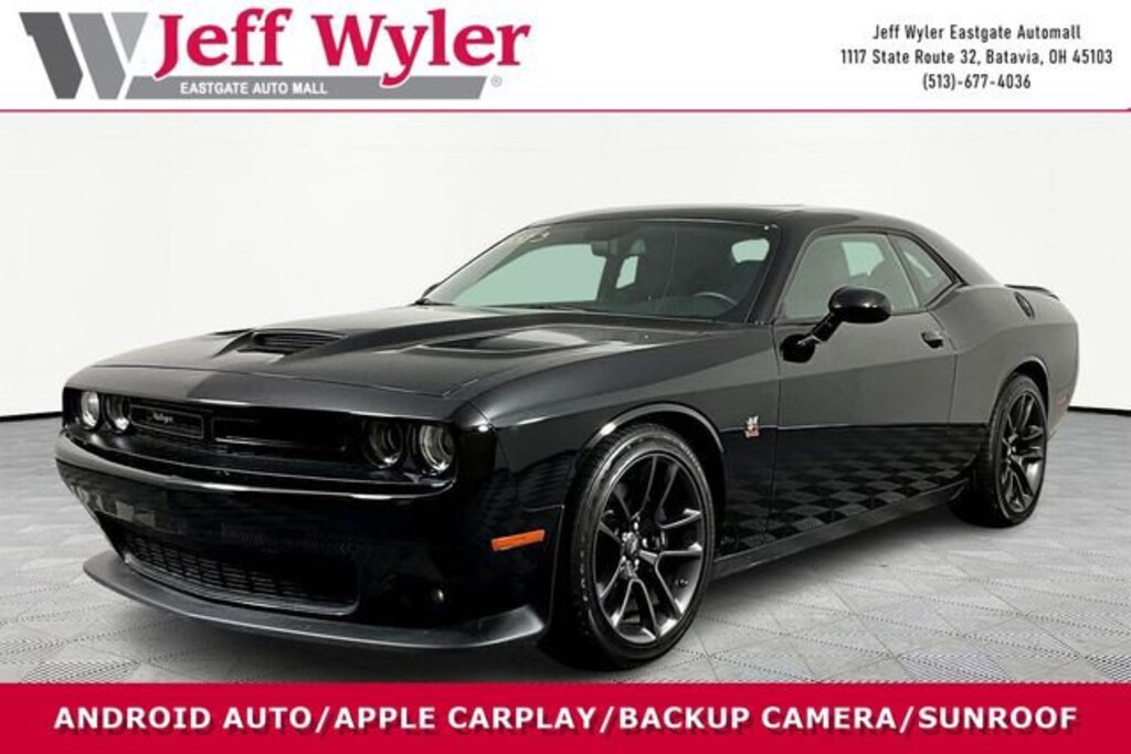Jeff Wyler Eastgate Auto Mall is pumped up to offer this charming 2022 Dodge Challenger R/T Scat Pack in Pitch Black Clearcoat. Well equipped with: Driver Convenience Group (Blind Spot & Cross Path Detection, Body Color Exterior Mirrors, Exterior Mirrors w/Heating Element, High-Intensity Discharge Headlamps, and Power Multi-Function Foldaway Mirrors), Quick Order Package 23G R/T Scat Pack, 1-Yr SiriusXM Guardian Trial, 4-Wheel Disc Brakes, 4G LTE Wi-Fi Hot Spot, 5-Year SiriusXM Traffic Service, 5-Year SiriusXM Travel Link Service, 6 Speakers, 8.4" Touchscreen Display, ABS brakes, Air Conditioning, All Radio Equipped Vehicles, Alloy wheels, AM/FM radio: SiriusXM, Anti-whiplash front head restraints, Apple CarPlay, Apple CarPlay/Android Auto, Auto-dimming Rear-View mirror, Automatic temperature control, Brake assist, Bumpers: body-color, Compass, Compass Gauge, Delay-off headlights, Driver door bin, Driver vanity mirror, Dual front impact airbags, Dual front side impact airbags, Electronic Stability Control, Emergency communication system: SiriusXM Guardian, For Details, Visit DriveUconnect.com, Four wheel independent suspension, Front anti-roll bar, Front Bucket Seats, Front Center Armrest, Front dual zone A/C, Front fog lights, Front License Plate Bracket, Front reading lights, Fully automatic headlights, Garage door transmitter, Google Android Auto, GPS Antenna Input, GPS Navigation, HD Radio, Heated door mirrors, Heated front seats, Heated steering wheel, Illuminated entry, Integrated Center Stack Radio, Integrated Voice Command w/Bluetooth, Leather Shift Knob, Low tire pressure warning, Media Hub (2 USB, AUX), Outside temperature display, Overhead airbag, Overhead console, Panic alarm, ParkView Rear Back-Up Camera, Passenger door bin, Passenger vanity mirror, Power door mirrors, Power driver seat, Power steering, Power Sunroof, Power windows, Radio data system, Radio: Uconnect 4C Nav w/8.4" Display, Radio: Uconnect 4C w/8.4" Display, Rear anti-roll bar, Rear reading lights, Rear seat center armrest, Rear window defroster, Remote keyless entry, Scat Pack Logo Houndstooth Seat, Security system, SiriusXM Satellite Radio, SiriusXM Traffic Plus, SiriusXM Travel Link, Speed control, Speed-sensing steering, Split folding rear seat, Spoiler, Sport steering wheel, Steering wheel mounted audio controls, Tachometer, Telescoping steering wheel, Tilt steering wheel, Traction control, Trip computer, USB Host Flip, Variably intermittent wipers, and Wheels: 20" x 9.0" Lo Gloss Granite CrystaL. CARFAX One-Owner. Ask about available certifications. Used vehicles 10 years of age or newer with less than 100,000 miles are eligible for the Wyler Assurance Program, but eligible vehicles must pass our reconditioning process and multi-point inspection. Provided the vehicle passes inspection, vehicles will be eligible for the 6 month/6,000 mile limited warranty. The 6 month/6,000 mile limited warranty is NOT available on AS-IS vehicles, wholesale vehicles, lease buyback/pass-thru vehicles or un-inspected vehicles. Note that this program can also apply to vehicles where the remaining factory coverage is less than 6 months or 6,000 miles. Please check the Federal Trade Commission (FTC) Buyers guide on the vehicle for full details as to whether or not warranty coverage may apply. Contact Dealer for additional details. The Wyler Assurance 6 month/6,000 Mile limited warranty ends 6 months from the date of the Retail Purchase Agreement (BUYERS ORDER) or when the vehicle's odometer registers 6,000 additional miles to the mileage listed on the BUYERS ORDER, whichever comes first. Your Deductible - The warranty holder on your contract pays the first $100 of each covered repair.