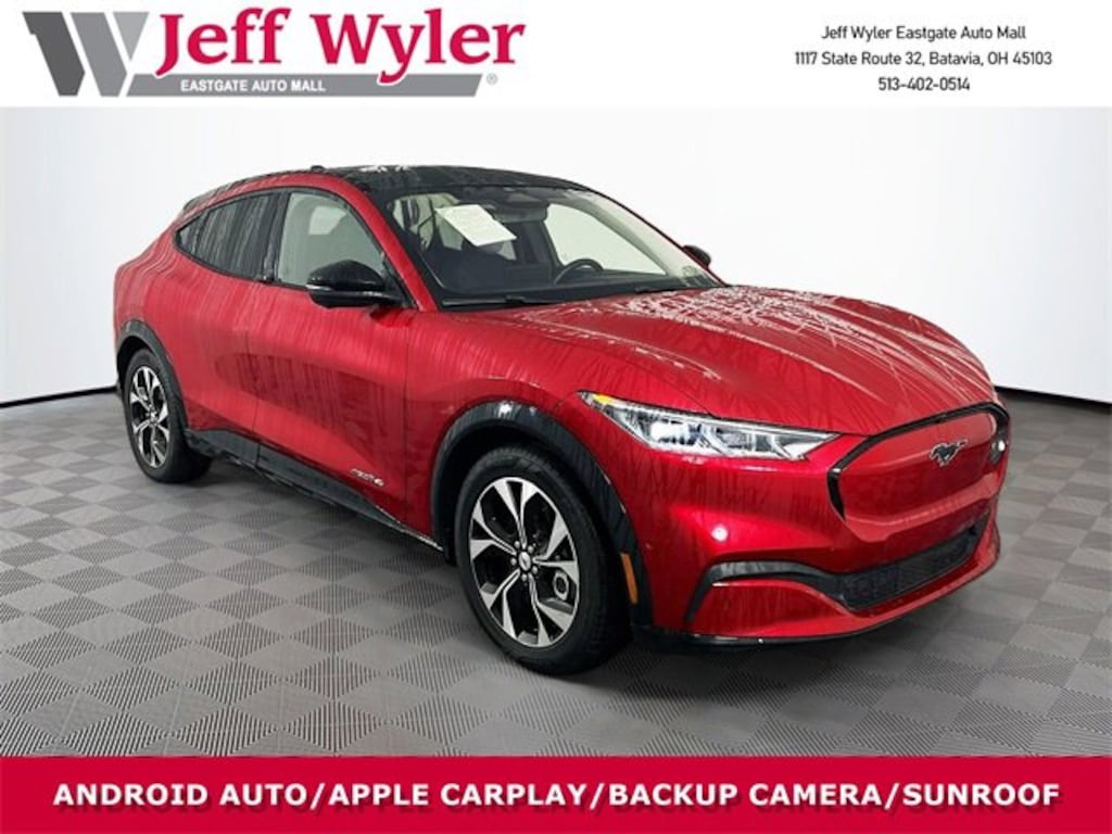 Jeff Wyler Eastgate Auto Mall is excited to offer this beautiful-looking 2021 Ford Mustang Mach-E Premium in Red Metallic. Well equipped with: Equipment Group 300A, 10 Speakers, 4-Wheel Disc Brakes, ABS brakes, Air Conditioning, Alloy wheels, AM/FM radio: SiriusXM, AM/FM Stereo, Apple CarPlay/Android Auto, Auto High-beam Headlights, Auto-dimming Rear-View mirror, Automatic temperature control, Axle Ratio: 9.05, Brake assist, Bumpers: body-color, Compass, Delay-off headlights, Driver door bin, Driver vanity mirror, Dual front impact airbags, Dual front side impact airbags, Electronic Stability Control, Emergency communication system: 911 Assist, Exterior Parking Camera Rear, Four wheel independent suspension, Front anti-roll bar, Front Bucket Seats, Front Center Armrest, Front dual zone A/C, Front reading lights, Fully automatic headlights, Garage door transmitter, Heated door mirrors, Heated front seats, Heated Perforated ActiveX Bucket Seats, Heated steering wheel, Illuminated entry, Knee airbag, Low tire pressure warning, Memory seat, Navigation system: Connected Navigation, Occupant sensing airbag, Outside temperature display, Overhead airbag, Overhead console, Panic alarm, Passenger door bin, Passenger vanity mirror, Power door mirrors, Power driver seat, Power Liftgate, Power passenger seat, Power steering, Power windows, Radio data system, Rain sensing wipers, Rear anti-roll bar, Rear seat center armrest, Rear side impact airbag, Rear window defroster, Rear window wiper, Remote keyless entry, Security system, SiriusXM Radio w/360L, Speed control, Speed-sensing steering, Speed-Sensitive Wipers, Split folding rear seat, Spoiler, Steering wheel mounted audio controls, SYNC 4A w/Enhanced Voice Recognition, Telescoping steering wheel, Tilt steering wheel, Traction control, Trip computer, Turn signal indicator mirrors, Variably intermittent wipers, and Wheels: 19" Machined-Face Aluminum. CARFAX One-Owner. Clean CARFAX. Awards: * JD Power Automotive Performance, Execution and Layout (APEAL) Study * NACTOY 2021 North American Utility of the Year Ask about available certifications. Used vehicles 10 years of age or newer with less than 100,000 miles are eligible for the Wyler Assurance Program, but eligible vehicles must pass our reconditioning process and multi-point inspection. Provided the vehicle passes inspection, vehicles will be eligible for the 6 month/6,000 mile limited warranty. The 6 month/6,000 mile limited warranty is NOT available on AS-IS vehicles, wholesale vehicles, lease buyback/pass-thru vehicles or un-inspected vehicles. Note that this program can also apply to vehicles where the remaining factory coverage is less than 6 months or 6,000 miles. Please check the Federal Trade Commission (FTC) Buyers guide on the vehicle for full details as to whether or not warranty coverage may apply. Contact Dealer for additional details. The Wyler Assurance 6 month/6,000 Mile limited warranty ends 6 months from the date of the Retail Purchase Agreement (BUYERS ORDER) or when the vehicle's odometer registers 6,000 additional miles to the mileage listed on the BUYERS ORDER, whichever comes first. Your Deductible - The warranty holder on your contract pays the first $100 of each covered repair.