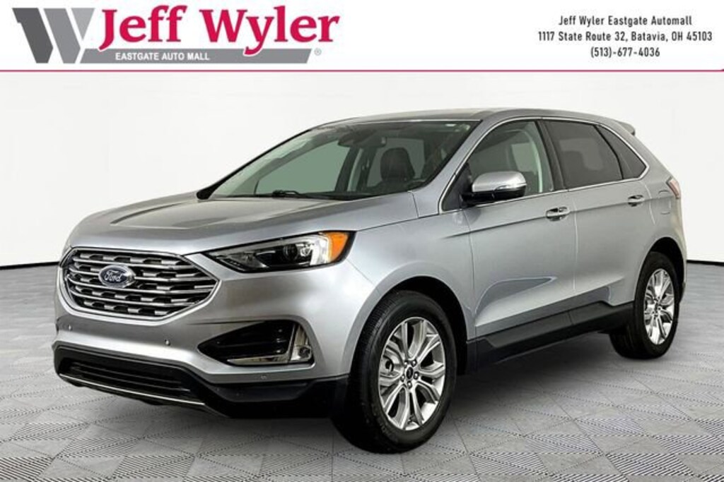 Jeff Wyler Eastgate Auto Mall is pumped up to offer this beautiful 2024 Ford Edge Titanium in Silver Metallic. Well equipped with: Equipment Group 300A, 12 Speakers, 3.80 Axle Ratio, 4-Wheel Disc Brakes, ABS brakes, ActiveX-Trimmed Heated Sport Bucket Seats, Air Conditioning, Alloy wheels, AM/FM radio: SiriusXM with 360L, Auto High-beam Headlights, Auto-dimming Rear-View mirror, Automatic temperature control, Brake assist, Bumpers: body-color, Compass, Delay-off headlights, Driver door bin, Driver vanity mirror, Dual front impact airbags, Dual front side impact airbags, Electronic Stability Control, Emergency communication system: SYNC 4 911 Assist, FordPass Connect, Four wheel independent suspension, Front anti-roll bar, Front Bucket Seats, Front Center Armrest w/Storage, Front dual zone A/C, Front fog lights, Front reading lights, Fully automatic headlights, Garage door transmitter, Heated door mirrors, Heated front seats, Heated steering wheel, Illuminated entry, Knee airbag, Leather steering wheel, Low tire pressure warning, Memory seat, Occupant sensing airbag, Outside temperature display, Overhead airbag, Overhead console, Panic alarm, Passenger door bin, Passenger vanity mirror, Power door mirrors, Power driver seat, Power Liftgate, Power passenger seat, Power steering, Power windows, Radio: B&O Sound System by Bang & Olufsen, Rain sensing wipers, Rear anti-roll bar, Rear reading lights, Rear seat center armrest, Rear window defroster, Rear window wiper, Remote keyless entry, Security system, SiriusXM w/360L, Speed control, Speed-Sensitive Wipers, Split folding rear seat, Spoiler, Steering wheel mounted audio controls, SYNC 4A w/Enhanced Voice Recognition, Tachometer, Telescoping steering wheel, Tilt steering wheel, Traction control, Trip computer, Turn signal indicator mirrors, Variably intermittent wipers, and Wheels: 19" Luster Nickel-Painted Aluminum. CARFAX One-Owner. Ask about available certifications. Used vehicles 10 years of age or newer with less than 100,000 miles are eligible for the Wyler Assurance Program, but eligible vehicles must pass our reconditioning process and multi-point inspection. Provided the vehicle passes inspection, vehicles will be eligible for the 6 month/6,000 mile limited warranty. The 6 month/6,000 mile limited warranty is NOT available on AS-IS vehicles, wholesale vehicles, lease buyback/pass-thru vehicles or un-inspected vehicles. Note that this program can also apply to vehicles where the remaining factory coverage is less than 6 months or 6,000 miles. Please check the Federal Trade Commission (FTC) Buyers guide on the vehicle for full details as to whether or not warranty coverage may apply. Contact Dealer for additional details. The Wyler Assurance 6 month/6,000 Mile limited warranty ends 6 months from the date of the Retail Purchase Agreement (BUYERS ORDER) or when the vehicle's odometer registers 6,000 additional miles to the mileage listed on the BUYERS ORDER, whichever comes first. Your Deductible - The warranty holder on your contract pays the first $100 of each covered repair.