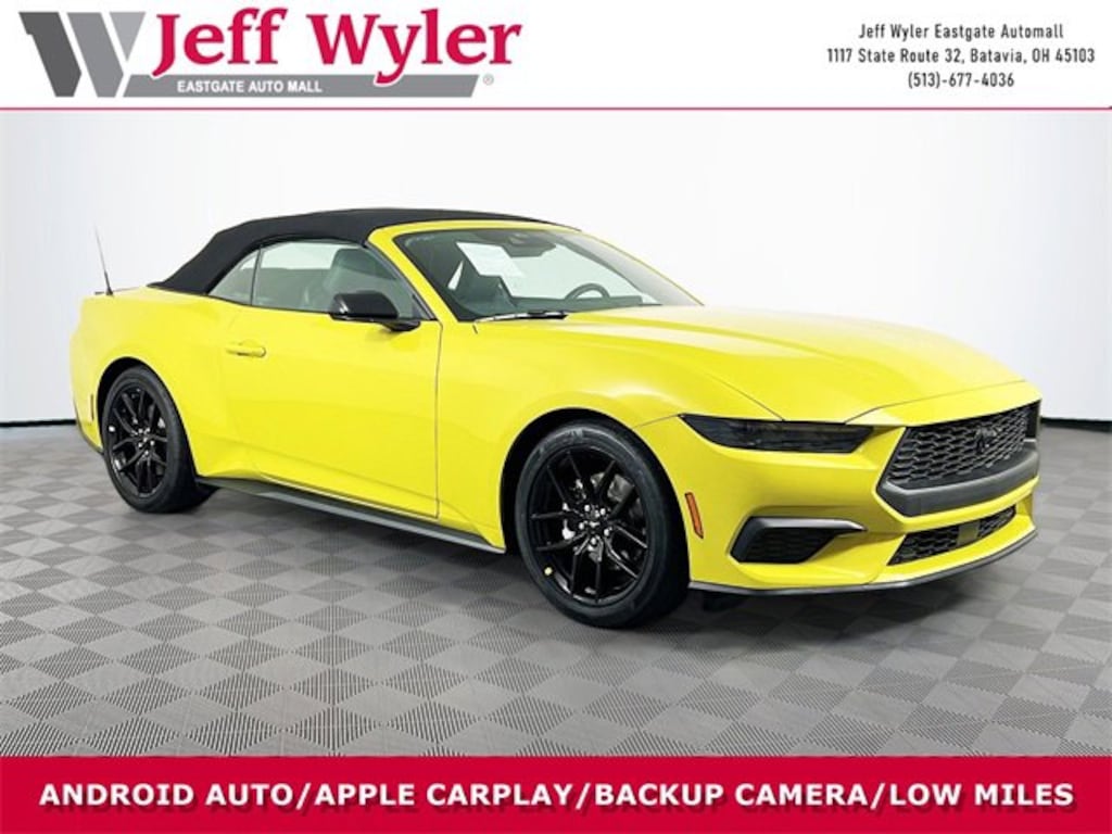 Jeff Wyler Eastgate Auto Mall is honored to offer this charming 2025 Ford Mustang EcoBoost Premium in Lime Yellow Metallic. Well equipped with: Security Package (Active Anti-Theft System, Locking Center Console, and Wheel Locking Kit), ABS brakes, Alloy wheels, Compass, Electronic Stability Control, Front dual zone A/C, Heated door mirrors, Heated front seats, Illuminated entry, Low tire pressure warning, Remote keyless entry, Traction control, 4-Wheel Disc Brakes, 9 Speakers, ActiveX Bucket Seats, Air Conditioning, AM/FM radio: SiriusXM with 360L, AM/FM Stereo, Auto High-beam Headlights, Auto-dimming Rear-View mirror, Automatic temperature control, Brake assist, Bumpers: body-color, Climate Controlled Heated/Cooled Front Seats, Convertible roof lining, Delay-off headlights, Driver door bin, Driver vanity mirror, Dual front impact airbags, Dual front side impact airbags, Emergency communication system: 911 Assist, Exterior Parking Camera Rear, Four wheel independent suspension, Front anti-roll bar, Front Bucket Seats, Front Center Armrest, Front reading lights, Fully automatic headlights, Glass rear window, HD Radio, Heated steering wheel, Knee airbag, Leather Shift Knob, Leather steering wheel, Occupant sensing airbag, Outside temperature display, Overhead console, Panic alarm, Passenger door bin, Passenger vanity mirror, Power convertible roof, Power door mirrors, Power driver seat, Power passenger seat, Power steering, Power windows, Radio data system, Rain sensing wipers, Rear anti-roll bar, Rear Parking Sensors, Rear window defroster, Security system, SiriusXM w/360L, Speed control, Speed-sensing steering, Speed-Sensitive Wipers, Spoiler, Sport steering wheel, Steering wheel mounted audio controls, SYNC 4, Tachometer, Telescoping steering wheel, Tilt steering wheel, Trip computer, Turn signal indicator mirrors, Variably intermittent wipers, Ventilated front seats, Voltmeter, and Wheels: 18" x 8" Machined-Face Aluminum. CARFAX One-Owner. Clean CARFAX. Ask about available certifications. Used vehicles 10 years of age or newer with less than 100,000 miles are eligible for the Wyler Assurance Program, but eligible vehicles must pass our reconditioning process and multi-point inspection. Provided the vehicle passes inspection, vehicles will be eligible for the 6 month/6,000 mile limited warranty. The 6 month/6,000 mile limited warranty is NOT available on AS-IS vehicles, wholesale vehicles, lease buyback/pass-thru vehicles or un-inspected vehicles. Note that this program can also apply to vehicles where the remaining factory coverage is less than 6 months or 6,000 miles. Please check the Federal Trade Commission (FTC) Buyers guide on the vehicle for full details as to whether or not warranty coverage may apply. Contact Dealer for additional details. The Wyler Assurance 6 month/6,000 Mile limited warranty ends 6 months from the date of the Retail Purchase Agreement (BUYERS ORDER) or when the vehicle's odometer registers 6,000 additional miles to the mileage listed on the BUYERS ORDER, whichever comes first. Your Deductible - The warranty holder on your contract pays the first $100 of each covered repair.