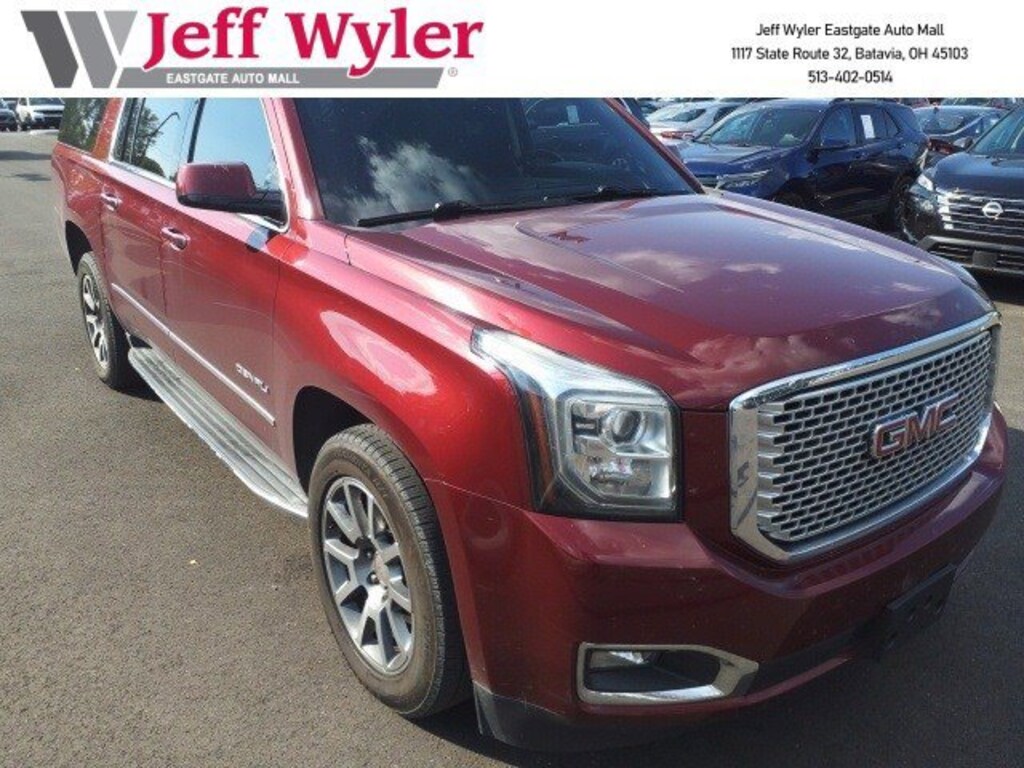 Jeff Wyler Eastgate Auto Mall is excited to offer this handsome 2016 GMC Yukon XL Denali in Crimson Red Tintcoat. Well equipped with: Adaptive Cruise Control w/Front Automatic Braking (4-Wheel Disc & 4-Wheel VAC Power Antilock Brakes and Automatic Collision Preparation), Enhanced Driver Alert Package (Forward Collision Alert Sensor Indicator, Intellibeam Automatic High Beam On/Off Headlamps, Lane Keep Assist, and Safety Alert Driver Seat), License Plate Front Mounting Package, Magnetic Ride Control Suspension Package, Memory Package, Open Road Package (3rd Row DVD Screen, Power Tilt-Sliding Sunroof w/Express-Open/Close, and Rear Seat Blu-Ray/DVD Entertainment System), Preferred Equipment Group 5SA (17" Disc/Disc VAC Power Brakes, 5 Auxiliary 12-volt Power Outlets, Black Assist Steps w/Chrome Strip, Hands Free Power Liftgate, Heated Leather-Wrapped Steering Wheel, Inside Rear-View Auto-Dimming Mirror, Integrated Trailer Brake Controller, OnStar Basic Plan For 5 Years, OnStar w/4G LTE, Passive Entry System, Power Release Second Row Bucket Seats, Power Tilt & Telescopic Steering Column, Power-Adjustable Pedals For Accelerator & Brake, Push Button Keyless Start, Rear Cross-Traffic Alert, Remote Keyless Entry, Side Blind Zone Alert w/Lane Change Alert, Universal Home Remote, and Wireless Charging), 10 Speakers, 3.23 Axle Ratio, 3rd row seats: split-bench, 4-Wheel Disc Brakes, ABS brakes, Adaptive suspension, Adjustable pedals, Air Conditioning, Alloy wheels, AM/FM radio: SiriusXM, Apple CarPlay, Auto High-beam Headlights, Auto-dimming door mirrors, Auto-dimming Rear-View mirror, Automatic temperature control, Bodyside moldings, Bose Centerpoint Premium 10-Speaker Surround Sound, Brake assist, Bumpers: body-color, CD Player, CD player, Compass, Delay-off headlights, Driver door bin, Driver vanity mirror, Dual front impact airbags, Dual front side impact airbags, Electronic Stability Control, Emergency communication system: OnStar, Exterior Parking Camera Rear, Front anti-roll bar, Front Bucket Seats, Front Center Armrest, Front dual zone A/C, Front fog lights, Front reading lights, Front wheel independent suspension, Full-Feature Reclining Bucket Seats, Fully automatic headlights, Garage door transmitter, Genuine wood console insert, Genuine wood dashboard insert, Genuine wood door panel insert, Head-Up Display, Heated & Cooled Driver & Front Passenger Seats, Heated door mirrors, Heated front seats, Heated rear seats, Heated steering wheel, High-Intensity Discharge Headlights, Illuminated entry, Leather Shift Knob, Low tire pressure warning, Memory seat, Navigation System, Occupant sensing airbag, Outside temperature display, Overhead airbag, Overhead console, Panic alarm, Passenger door bin, Passenger vanity mirror, Pedal memory, Perforated Leather-Appointed Seat Trim, Power door mirrors, Power driver seat, Power Liftgate, Power passenger seat, Power steering, Power windows, Premium audio system: IntelliLink, Radio: AM/FM/SiriusXM/HD w/Navigation, Rain sensing wipers, Rear air conditioning, Rear anti-roll bar, Rear reading lights, Rear window defroster, Rear window wiper, Remote keyless entry, Roof rack: rails only, Security system, SiriusXM Satellite Radio, Speed control, Speed-sensing steering, Split folding rear seat, Spoiler, Steering wheel memory, Steering wheel mounted audio controls, Tachometer, Telescoping steering wheel, Tilt steering wheel, Traction control, Trip computer, Turn signal indicator mirrors, Unauthorized Entry Electrical Theft Deterrent Sys., Variably intermittent wipers, Ventilated front seats, Voltmeter, and Wheels: 20" x 9" Ultra Bright Machined Aluminum. Clean CARFAX. Reviews: * Strong V8 power; stout towing capacity; big cargo capacity; available nine-passenger seating; quiet highway ride; high-quality cabin. Source: EdmundsAwards: * 2016 KBB.com Brand Image Awards Ask about available certifications. Used vehicles 10 years of age or newer with less than 100,000 miles are eligible for the Wyler Assura