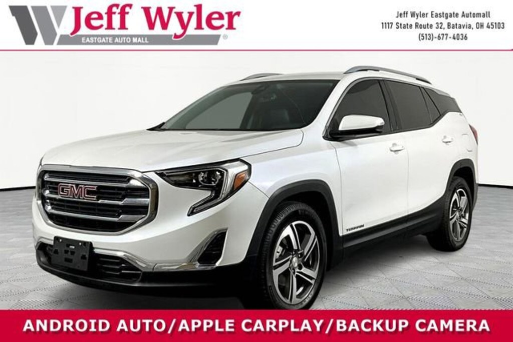 Jeff Wyler Eastgate Auto Mall is excited to offer this wonderful-looking 2021 GMC Terrain SLT in White Frost Tricoat. Well equipped with: Floor Liner Package (LPO) (Front & Rear All-Weather Floor Liners (LPO) and Integrated Cargo Liner (LPO)), License Plate Front Mounting Package, Preferred Equipment Group 4SA, 2 USB Data Ports, 2 USB Data Ports w/SD Card Reader, 3.47 Axle Ratio, 4-Wheel Disc Brakes, 6 Speakers, 6-Speaker Audio System Feature, 8-Way Power Driver Seat Adjuster, ABS brakes, Air Conditioning, Alloy wheels, AM/FM radio: SiriusXM, Apple CarPlay/Android Auto, Auto High-beam Headlights, Auto-dimming door mirrors, Auto-dimming Rear-View mirror, Automatic temperature control, Bluetooth® For Phone, Brake assist, Bumpers: body-color, Compass, Delay-off headlights, Driver & Front Passenger Heated Seats, Driver door bin, Driver vanity mirror, Dual front impact airbags, Dual front side impact airbags, Electronic Stability Control, Emergency communication system: OnStar and GMC connected services capable, Exterior Parking Camera Rear, Four wheel independent suspension, Front anti-roll bar, Front Bucket Seats, Front Center Armrest, Front dual zone A/C, Front fog lights, Front reading lights, Fully automatic headlights, Garage door transmitter, Heated door mirrors, Heated front seats, Heated steering wheel, High-Intensity Discharge Headlights, Illuminated entry, Low tire pressure warning, Memory seat, Occupant sensing airbag, Outside temperature display, Overhead airbag, Overhead console, Panic alarm, Passenger door bin, Passenger vanity mirror, Perforated Leather-Appointed Seat Trim, Power door mirrors, Power Driver Lumbar Control, Power driver seat, Power Liftgate, Power passenger seat, Power steering, Power windows, Radio data system, Radio: GMC Infotainment Audio System w/8" Display, Rear anti-roll bar, Rear seat center armrest, Rear window defroster, Rear window wiper, Remote keyless entry, Roof rack: rails only, Security system, SiriusXM Radio, Speed control, Speed-sensing steering, Split folding rear seat, Spoiler, Steering wheel mounted audio controls, Tachometer, Telescoping steering wheel, Tilt steering wheel, Traction control, Trip computer, Turn signal indicator mirrors, Variably intermittent wipers, and Wheels: 18" x 7" Machined Aluminum w/Gray Accents. Clean CARFAX. Ask about available certifications. Used vehicles 10 years of age or newer with less than 100,000 miles are eligible for the Wyler Assurance Program, but eligible vehicles must pass our reconditioning process and multi-point inspection. Provided the vehicle passes inspection, vehicles will be eligible for the 6 month/6,000 mile limited warranty. The 6 month/6,000 mile limited warranty is NOT available on AS-IS vehicles, wholesale vehicles, lease buyback/pass-thru vehicles or un-inspected vehicles. Note that this program can also apply to vehicles where the remaining factory coverage is less than 6 months or 6,000 miles. Please check the Federal Trade Commission (FTC) Buyers guide on the vehicle for full details as to whether or not warranty coverage may apply. Contact Dealer for additional details. The Wyler Assurance 6 month/6,000 Mile limited warranty ends 6 months from the date of the Retail Purchase Agreement (BUYERS ORDER) or when the vehicle's odometer registers 6,000 additional miles to the mileage listed on the BUYERS ORDER, whichever comes first. Your Deductible - The warranty holder on your contract pays the first $100 of each covered repair.