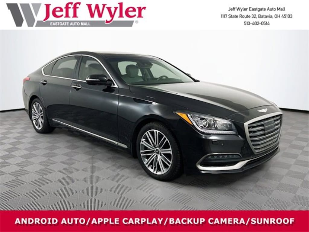 Jeff Wyler Eastgate Auto Mall is pleased to offer this great 2018 Genesis G80 3.8 in Black. Well equipped with: 12-Way Power Heated Front Bucket Seats, 18" Alloy Wheels, 4-Wheel Disc Brakes, 7 Speakers, ABS brakes, Air Conditioning, Alloy wheels, AM/FM radio: SiriusXM, Android Auto & Apple CarPlay, Anti-whiplash front head restraints, Auto High-beam Headlights, Auto tilt-away steering wheel, Auto-dimming door mirrors, Auto-dimming Rear-View mirror, Automatic temperature control, Bodyside moldings, Brake assist, Bumpers: body-color, CD player, Compass, Delay-off headlights, Driver door bin, Driver vanity mirror, Dual front impact airbags, Dual front side impact airbags, Electronic Stability Control, Emergency communication system: Genesis Connected Services, Exterior Parking Camera Rear, Four wheel independent suspension, Front anti-roll bar, Front Bucket Seats, Front Center Armrest, Front dual zone A/C, Front reading lights, Fully automatic headlights, Garage door transmitter: HomeLink, Heated door mirrors, Heated front seats, High intensity discharge headlights: Bi-Xenon, Illuminated entry, Knee airbag, Leather Seating Surfaces, Leather Shift Knob, Leather steering wheel, Low tire pressure warning, Memory seat, Navigation System, Occupant sensing airbag, Outside temperature display, Overhead airbag, Overhead console, Panic alarm, Passenger door bin, Passenger vanity mirror, Power door mirrors, Power driver seat, Power passenger seat, Power steering, Power windows, Radio data system, Radio: AM/FM/XM/HD/CD/MP3 Audio System, Rain sensing wipers, Rear anti-roll bar, Rear reading lights, Rear seat center armrest, Rear side impact airbag, Rear window defroster, Remote keyless entry, Security system, Speed control, Speed-sensing steering, Speed-Sensitive Wipers, Steering wheel memory, Steering wheel mounted audio controls, Tachometer, Telescoping steering wheel, Tilt steering wheel, Traction control, Trip computer, Turn signal indicator mirrors, and Variably intermittent wipers. Ask about available certifications. Used vehicles 10 years of age or newer with less than 100,000 miles are eligible for the Wyler Assurance Program, but eligible vehicles must pass our reconditioning process and multi-point inspection. Provided the vehicle passes inspection, vehicles will be eligible for the 6 month/6,000 mile limited warranty. The 6 month/6,000 mile limited warranty is NOT available on AS-IS vehicles, wholesale vehicles, lease buyback/pass-thru vehicles or un-inspected vehicles. Note that this program can also apply to vehicles where the remaining factory coverage is less than 6 months or 6,000 miles. Please check the Federal Trade Commission (FTC) Buyers guide on the vehicle for full details as to whether or not warranty coverage may apply. Contact Dealer for additional details. The Wyler Assurance 6 month/6,000 Mile limited warranty ends 6 months from the date of the Retail Purchase Agreement (BUYERS ORDER) or when the vehicle's odometer registers 6,000 additional miles to the mileage listed on the BUYERS ORDER, whichever comes first. Your Deductible - The warranty holder on your contract pays the first $100 of each covered repair.