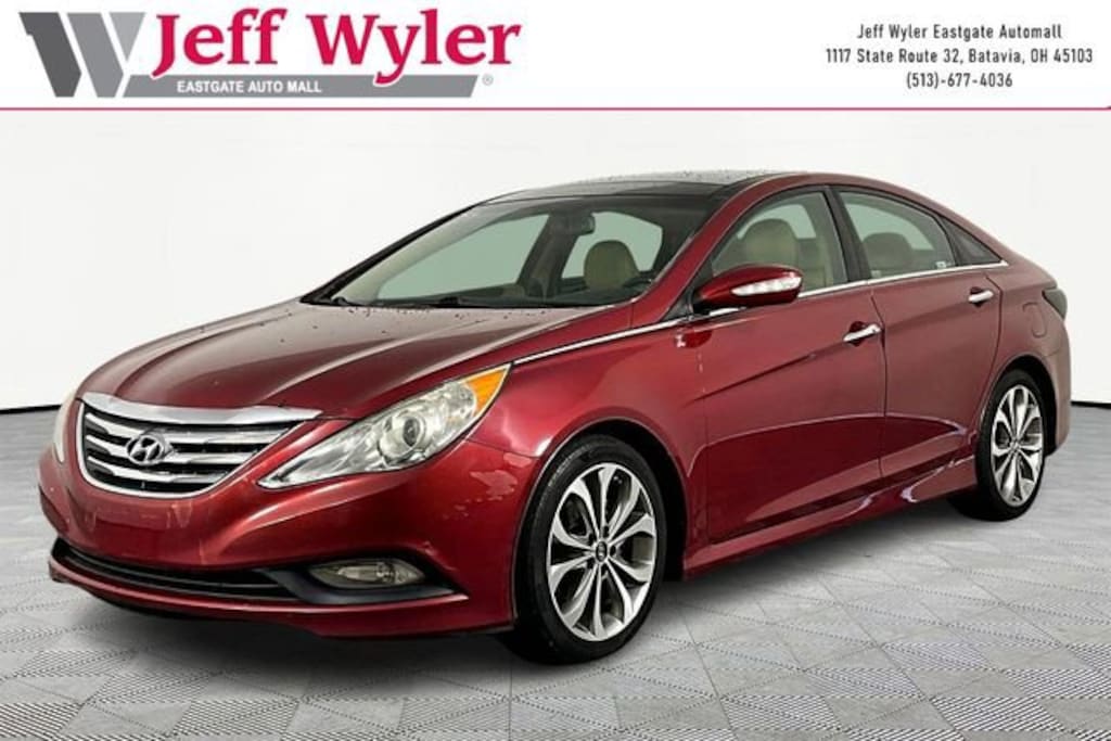Jeff Wyler Eastgate Auto Mall is honored to offer this good-looking 2014 Hyundai Sonata Limited in Venetian Red Metallic. Well equipped with: Technology Package 05, 18 x 7.5J Hyper Silver Aluminum Alloy Wheels, 4-Wheel Disc Brakes, 7 Speakers, ABS brakes, Air Conditioning, Alloy wheels, AM/FM radio: SiriusXM, Anti-whiplash front head restraints, Auto-dimming Rear-View mirror, Automatic temperature control, Brake assist, Bumpers: body-color, Cargo Net, Carpeted Floor Mats, CD player, Compass, Delay-off headlights, Driver door bin, Driver vanity mirror, Dual front impact airbags, Dual front side impact airbags, Electronic Stability Control, Emergency communication system: Blue Link, Exterior Parking Camera Rear, First Aid Kit, Four wheel independent suspension, Front anti-roll bar, Front Bucket Seats, Front Center Armrest w/Storage, Front dual zone A/C, Front fog lights, Front reading lights, Fully automatic headlights, Garage door transmitter: HomeLink, Heated door mirrors, Heated Front Bucket Seats, Heated front seats, Heated rear seats, Illuminated entry, Leather Seating Surfaces, Leather steering wheel, Low tire pressure warning, Occupant sensing airbag, Outside temperature display, Overhead airbag, Overhead console, Panic alarm, Passenger door bin, Passenger vanity mirror, Power door mirrors, Power driver seat, Power moonroof, Power steering, Power windows, Radio: AM/FM/SiriusXM/CD/MP3 Audio System, Rear anti-roll bar, Rear seat center armrest, Rear window defroster, Remote keyless entry, Security system, Speed control, Speed-sensing steering, Speed-Sensitive Wipers, Split folding rear seat, Steering wheel mounted audio controls, Tachometer, Telescoping steering wheel, Tilt steering wheel, Traction control, Trip computer, Turn signal indicator mirrors, Variably intermittent wipers, and Ventilated front seats. CARFAX One-Owner. Clean CARFAX. Awards: * 2014 KBB.com 10 Best Late-Model Used Cars Under $15,000 * 2014 KBB.com 10 Best Used Family Cars Under $15,000 Ask about available certifications. Used vehicles 10 years of age or newer with less than 100,000 miles are eligible for the Wyler Assurance Program, but eligible vehicles must pass our reconditioning process and multi-point inspection. Provided the vehicle passes inspection, vehicles will be eligible for the 6 month/6,000 mile limited warranty. The 6 month/6,000 mile limited warranty is NOT available on AS-IS vehicles, wholesale vehicles, lease buyback/pass-thru vehicles or un-inspected vehicles. Note that this program can also apply to vehicles where the remaining factory coverage is less than 6 months or 6,000 miles. Please check the Federal Trade Commission (FTC) Buyers guide on the vehicle for full details as to whether or not warranty coverage may apply. Contact Dealer for additional details. The Wyler Assurance 6 month/6,000 Mile limited warranty ends 6 months from the date of the Retail Purchase Agreement (BUYERS ORDER) or when the vehicle's odometer registers 6,000 additional miles to the mileage listed on the BUYERS ORDER, whichever comes first. Your Deductible - The warranty holder on your contract pays the first $100 of each covered repair.