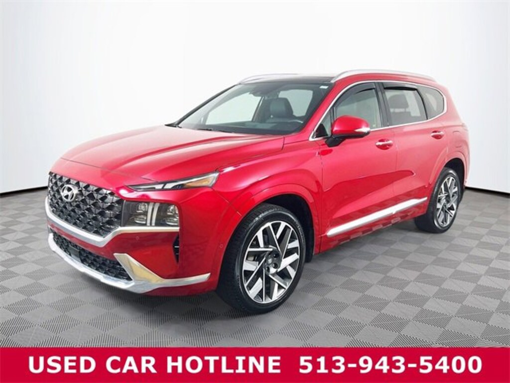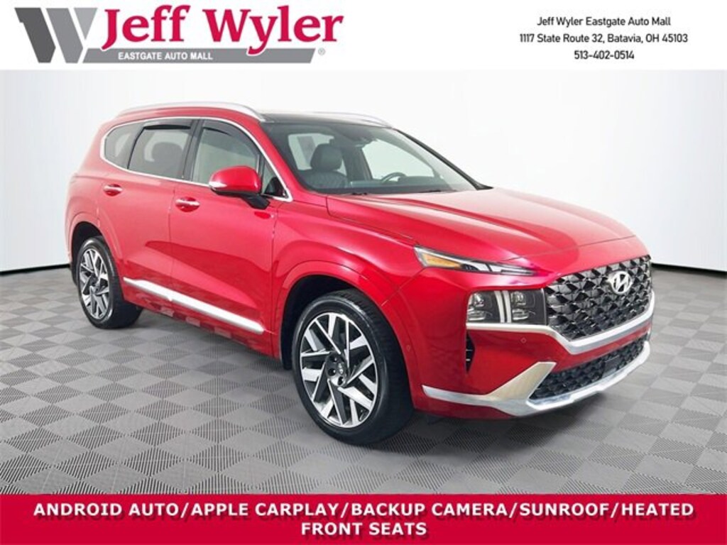 Jeff Wyler Eastgate Auto Mall is pleased to offer this terrific 2023 Hyundai Santa Fe Calligraphy in Calypso Red. Well equipped with: Cargo Package (Cargo Net, Cargo Tray, and First Aid Kit), Option Group 01, 12 Speakers, 4-Wheel Disc Brakes, ABS brakes, Air Conditioning, Alloy wheels, AM/FM radio: SiriusXM, Apple CarPlay & Android Auto, Auto High-beam Headlights, Auto-dimming Rear-View mirror, Automatic temperature control, Axle Ratio: 3.316, Brake assist, Bumpers: body-color, Cargo Cover/Screen, Carpeted Floor Mats, Delay-off headlights, Driver door bin, Driver vanity mirror, Dual front impact airbags, Dual front side impact airbags, Electronic Stability Control, Emergency communication system, Exterior Parking Camera Rear, Four wheel independent suspension, Front anti-roll bar, Front Bucket Seats, Front Center Armrest, Front dual zone A/C, Front reading lights, Fully automatic headlights, Garage door transmitter: HomeLink, harman/kardon® Speakers, Heads-Up Display, Heated & Ventilated Front Bucket Seats, Heated door mirrors, Heated front seats, Heated rear seats, Heated steering wheel, Illuminated entry, Leather steering wheel, Low tire pressure warning, Memory seat, Mudguards, Navigation System, Occupant sensing airbag, Outside temperature display, Overhead airbag, Overhead console, Panic alarm, Passenger door bin, Passenger vanity mirror, Power door mirrors, Power driver seat, Power Liftgate, Power moonroof, Power passenger seat, Power steering, Power windows, Quilted Premium Nappa Leather Seat Trim, Radio: AM/FM Harman Kardon Display Audio, Rain sensing wipers, Rear anti-roll bar, Rear seat center armrest, Rear window defroster, Rear window wiper, Remote keyless entry, Security system, Speed control, Speed-sensing steering, Split folding rear seat, Spoiler, Steering wheel mounted audio controls, Tachometer, Telescoping steering wheel, Tilt steering wheel, Traction control, Trip computer, Turn signal indicator mirrors, Variably intermittent wipers, Ventilated front seats, Wheel Locks, and Wheels: 20" x 8.0J Alloy. Ask about available certifications. Used vehicles 10 years of age or newer with less than 100,000 miles are eligible for the Wyler Assurance Program, but eligible vehicles must pass our reconditioning process and multi-point inspection. Provided the vehicle passes inspection, vehicles will be eligible for the 6 month/6,000 mile limited warranty. The 6 month/6,000 mile limited warranty is NOT available on AS-IS vehicles, wholesale vehicles, lease buyback/pass-thru vehicles or un-inspected vehicles. Note that this program can also apply to vehicles where the remaining factory coverage is less than 6 months or 6,000 miles. Please check the Federal Trade Commission (FTC) Buyers guide on the vehicle for full details as to whether or not warranty coverage may apply. Contact Dealer for additional details. The Wyler Assurance 6 month/6,000 Mile limited warranty ends 6 months from the date of the Retail Purchase Agreement (BUYERS ORDER) or when the vehicle's odometer registers 6,000 additional miles to the mileage listed on the BUYERS ORDER, whichever comes first. Your Deductible - The warranty holder on your contract pays the first $100 of each covered repair.