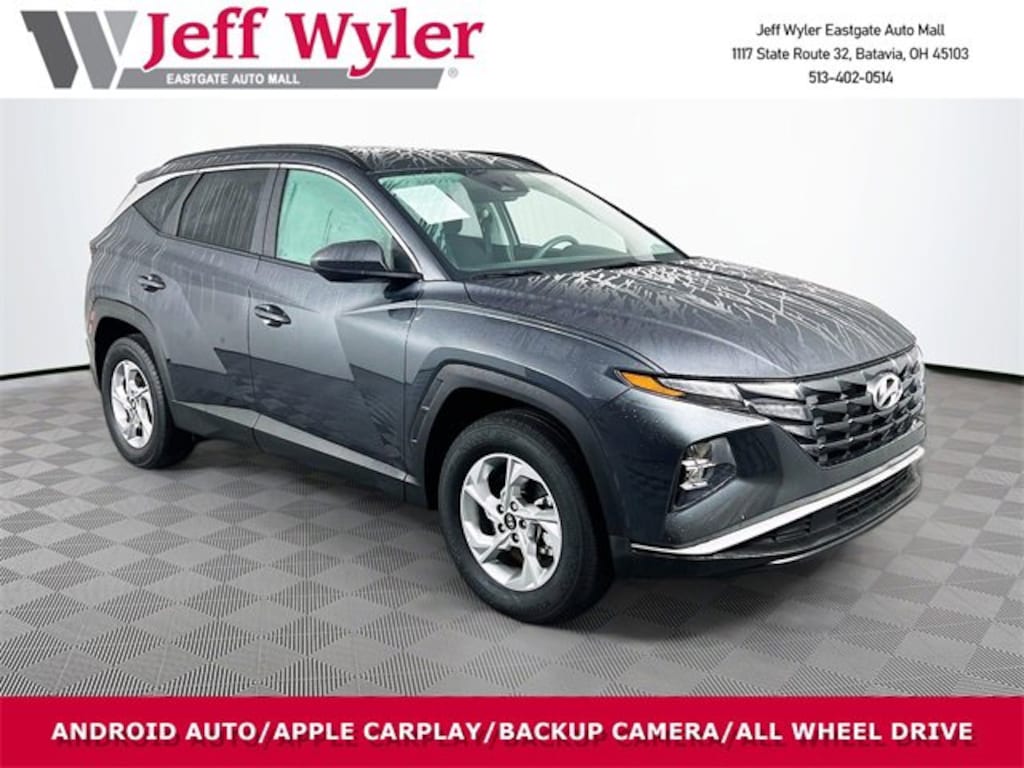 Jeff Wyler Eastgate Auto Mall is very proud to offer this terrific-looking 2024 Hyundai Tucson SEL in Dark Gray Metallic. Well equipped with: Option Group 01, 3.648 Axle Ratio, 4-Wheel Disc Brakes, 6 Speakers, ABS brakes, Air Conditioning, Alloy wheels, AM/FM radio: SiriusXM, Apple CarPlay & Android Auto, Auto High-beam Headlights, Automatic temperature control, Brake assist, Bumpers: body-color, Cargo Net, Cargo Tray, Carpeted Floor Mats, Delay-off headlights, Driver door bin, Driver vanity mirror, Dual front impact airbags, Dual front side impact airbags, Electronic Stability Control, Emergency communication system: Blue Link Connected Car Service (3-year complimentary subscription), Exterior Parking Camera Rear, Four wheel independent suspension, Front anti-roll bar, Front Bucket Seats, Front Center Armrest, Front dual zone A/C, Front reading lights, Fully automatic headlights, Heated door mirrors, Heated Front Bucket Seats, Heated front seats, Illuminated entry, Low tire pressure warning, Occupant sensing airbag, Outside temperature display, Overhead airbag, Overhead console, Panic alarm, Passenger door bin, Passenger vanity mirror, Power door mirrors, Power driver seat, Power Liftgate, Power steering, Power windows, Radio data system, Radio: AM/FM/HD Audio System, Rear anti-roll bar, Rear seat center armrest, Rear side impact airbag, Rear window defroster, Rear window wiper, Remote keyless entry, Roof rack: rails only, Security system, Speed control, Split folding rear seat, Spoiler, Stain & Odor Resistant Cloth Seat Trim, Steering wheel mounted audio controls, Tachometer, Telescoping steering wheel, Tilt steering wheel, Tow Hitch, Traction control, Trip computer, Variably intermittent wipers, Wheel Locks, Wheels: 17" x 7.0J" Alloy, and Wheels: 19" x 7.5J" Machine-Face Finish Alloy. CARFAX One-Owner. Clean CARFAX. Ask about available certifications. Used vehicles 10 years of age or newer with less than 100,000 miles are eligible for the Wyler Assurance Program, but eligible vehicles must pass our reconditioning process and multi-point inspection. Provided the vehicle passes inspection, vehicles will be eligible for the 6 month/6,000 mile limited warranty. The 6 month/6,000 mile limited warranty is NOT available on AS-IS vehicles, wholesale vehicles, lease buyback/pass-thru vehicles or un-inspected vehicles. Note that this program can also apply to vehicles where the remaining factory coverage is less than 6 months or 6,000 miles. Please check the Federal Trade Commission (FTC) Buyers guide on the vehicle for full details as to whether or not warranty coverage may apply. Contact Dealer for additional details. The Wyler Assurance 6 month/6,000 Mile limited warranty ends 6 months from the date of the Retail Purchase Agreement (BUYERS ORDER) or when the vehicle's odometer registers 6,000 additional miles to the mileage listed on the BUYERS ORDER, whichever comes first. Your Deductible - The warranty holder on your contract pays the first $100 of each covered repair.