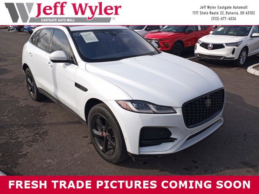 Jeff Wyler Eastgate Auto Mall is very proud to offer this handsome 2021 Jaguar F-PACE P250 S in White. Well equipped with: 11 Speakers, 4-Wheel Disc Brakes, ABS brakes, Adaptive suspension, Air Conditioning, Alloy wheels, AM/FM radio: SiriusXM, Apple CarPlay/Android Auto, Auto High-beam Headlights, Auto-dimming door mirrors, Auto-dimming Rear-View mirror, Automatic temperature control, Axle Ratio: 3.73, Brake assist, Bumpers: body-color, Compass, Delay-off headlights, Driver door bin, Driver vanity mirror, Dual front impact airbags, Dual front side impact airbags, Electronic Stability Control, Emergency communication system: Remote SOS Emergency Call, Four wheel independent suspension, Front anti-roll bar, Front Bucket Seats, Front Center Armrest, Front dual zone A/C, Front reading lights, Fully automatic headlights, Garage door transmitter: HomeLink, Genuine wood dashboard insert, Genuine wood door panel insert, Grained Leather Seat Trim, Heated door mirrors, Heated Front Bucket Seats, Heated front seats, Illuminated entry, Leather Shift Knob, Leather steering wheel, Low tire pressure warning, Navigation system: InControl Navigation Pro, Occupant sensing airbag, Outside temperature display, Overhead airbag, Overhead console, Panic alarm, Passenger door bin, Passenger vanity mirror, Power door mirrors, Power driver seat, Power Liftgate, Power moonroof, Power passenger seat, Power steering, Power windows, Radio data system, Radio: Meridian 380W Sound System, Rain sensing wipers, Rear anti-roll bar, Rear fog lights, Rear reading lights, Rear seat center armrest, Rear window defroster, Rear window wiper, Remote keyless entry, Security system, Speed control, Speed-sensing steering, Split folding rear seat, Spoiler, Steering wheel mounted audio controls, Tachometer, Telescoping steering wheel, Tilt steering wheel, Traction control, Trip computer, Turn signal indicator mirrors, Variably intermittent wipers, Wheels: 19" 5 Split-Spoke Gloss Grey (Style 5038), and Wheels: 19" 5 Spoke Gloss Black (Style 5103) Ask about available certifications. Used vehicles 10 years of age or newer with less than 100,000 miles are eligible for the Wyler Assurance Program, but eligible vehicles must pass our reconditioning process and multi-point inspection. Provided the vehicle passes inspection, vehicles will be eligible for the 6 month/6,000 mile limited warranty. The 6 month/6,000 mile limited warranty is NOT available on AS-IS vehicles, wholesale vehicles, lease buyback/pass-thru vehicles or un-inspected vehicles. Note that this program can also apply to vehicles where the remaining factory coverage is less than 6 months or 6,000 miles. Please check the Federal Trade Commission (FTC) Buyers guide on the vehicle for full details as to whether or not warranty coverage may apply. Contact Dealer for additional details. The Wyler Assurance 6 month/6,000 Mile limited warranty ends 6 months from the date of the Retail Purchase Agreement (BUYERS ORDER) or when the vehicle's odometer registers 6,000 additional miles to the mileage listed on the BUYERS ORDER, whichever comes first. Your Deductible - The warranty holder on your contract pays the first $100 of each covered repair.
