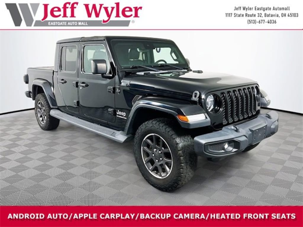 Jeff Wyler Eastgate Auto Mall is pumped up to offer this good-looking 2020 Jeep Gladiator Overland in Black Clearcoat. Well equipped with: 8.4" Radio & Premium Audio Group (1-Year SiriusXM Guardian Trial, 5-Year SiriusXM Traffic Service, 5-Year SiriusXM Travel Link Service, Alpine Premium Audio System, Auto-Dimming Rear-View Mirror, Emergency/Assistance Call, For Details, Visit DriveUconnect.com, HD Radio, Radio: Uconnect 4C Nav w/8.4" Display, SiriusXM Traffic Plus, and SiriusXM Travel Link), Advanced Safety Group (Advanced Brake Assist and Full Speed Forward Collision Warning Plus), Auxiliary Switch Group (240 Amp Alternator, 700 Amp Maintenance Free Battery, and Auxiliary Switches), Cargo Group w/Trail Rail System (400W Inverter, Exterior 115V AC Outlet, and Lockable Rear Underseat Storage), Cold Weather Group (Heated Front Seats and Heated Steering Wheel), LED Lighting Group (Daytime Running Lamps LED Accents, Front LED Fog Lamps, LED Park Turn Lamps, LED Reflector Headlamps, and LED Taillamps), Quick Order Package 24G, Safety Group (Blind Spot & Cross Path Detection and ParkSense Rear Park Assist System), Trailer Tow Package (Class IV Hitch Receiver, Heavy-Duty Engine Cooling, and Trailer Hitch Zoom), 3.73 Rear Axle Ratio, 4-Wheel Disc Brakes, 8 Speakers, ABS brakes, Air Conditioning, All-Weather Slush Mats, Alloy wheels, AM/FM radio: SiriusXM, Anti-Spin Differential Rear Axle, Apple CarPlay/Android Auto, Automatic temperature control, Black 3-Piece Hard Top, Brake assist, Compass, Delay-off headlights, Driver door bin, Driver vanity mirror, Dual front impact airbags, Dual front side impact airbags, Electronic Stability Control, Freedom Panel Storage Bag, Front anti-roll bar, Front Bucket Seats, Front Center Armrest w/Storage, Front dual zone A/C, Front fog lights, Front reading lights, Fully automatic headlights, Garage door transmitter, Hardtop Headliner, Heated door mirrors, Illuminated entry, Integrated roll-over protection, Leather steering wheel, Low tire pressure warning, MOPAR Hard Tri-Fold Tonneau Cover, No Soft Top, Normal Duty Plus Suspension, Occupant sensing airbag, Outside temperature display, Overland Cloth Bucket Seats, Panic alarm, ParkView Rear Back-Up Camera, Passenger door bin, Passenger vanity mirror, Power door mirrors, Power steering, Power windows, Premium Door Trim Panel, Radio data system, Radio: Uconnect 4 w/7" Display, Rear anti-roll bar, Rear reading lights, Rear Sliding Window, Rear Window Defroster, Remote keyless entry, Remote Proximity Keyless Entry, Remote Start System, Security system, Speed control, Split folding rear seat, Spray In Bedliner, Steering wheel mounted audio controls, Tachometer, Telescoping steering wheel, Tilt steering wheel, Traction control, Trip computer, Variably intermittent wipers, Voltmeter, and Wheels: 18" x 7.5" Granite Crystal AluminuM. Awards: * NACTOY 2020 North American Truck of the Year * 2020 KBB.com 10 Favorite New-for-2020 Cars Ask about available certifications. Used vehicles 10 years of age or newer with less than 100,000 miles are eligible for the Wyler Assurance Program, but eligible vehicles must pass our reconditioning process and multi-point inspection. Provided the vehicle passes inspection, vehicles will be eligible for the 6 month/6,000 mile limited warranty. The 6 month/6,000 mile limited warranty is NOT available on AS-IS vehicles, wholesale vehicles, lease buyback/pass-thru vehicles or un-inspected vehicles. Note that this program can also apply to vehicles where the remaining factory coverage is less than 6 months or 6,000 miles. Please check the Federal Trade Commission (FTC) Buyers guide on the vehicle for full details as to whether or not warranty coverage may apply. Contact Dealer for additional details. The Wyler Assurance 6 month/6,000 Mile limited warranty ends 6 months from the date of the Retail Purchase Agreement (BUYERS ORDER) or when the vehicle's odometer registers 6,000 additional miles to the mileage listed on the BUYERS O