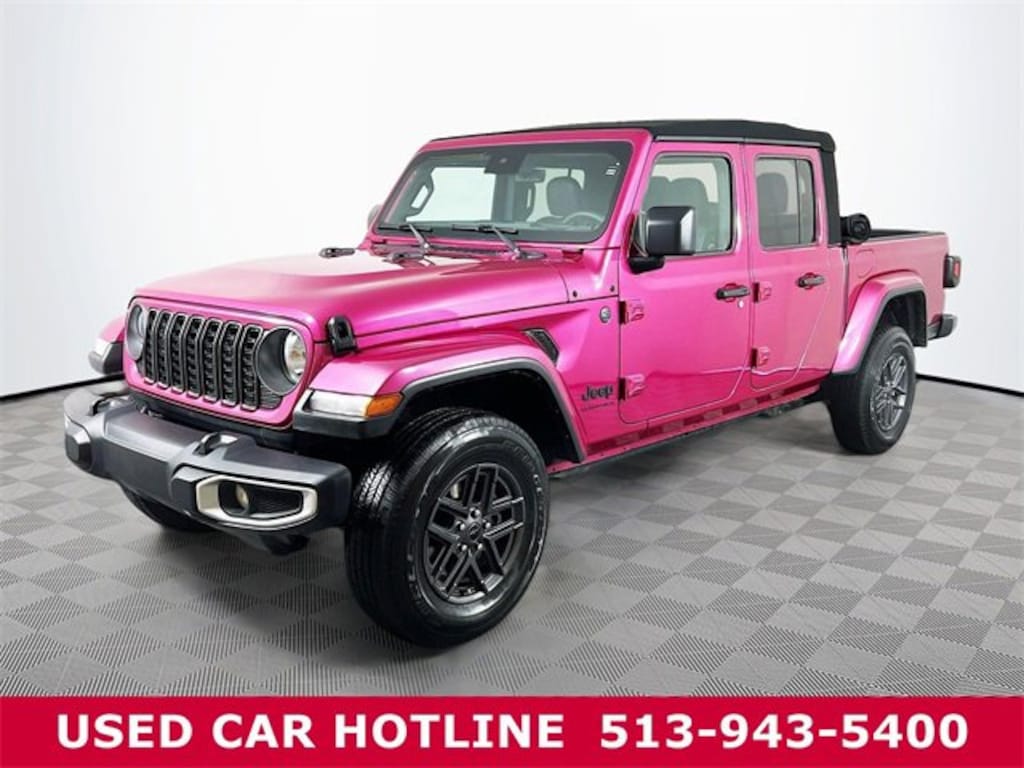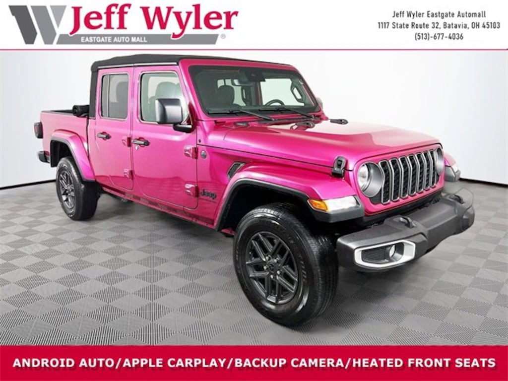Jeff Wyler Eastgate Auto Mall is pumped up to offer this attractive-looking 2024 Jeep Gladiator Sport in Tuscadero Pearlcoat. Only two used available within 500 miles. CUSTOM floral embossed LEATHER! Cargo Group w/Trail Rail System (240 Amp Alternator, 400W Inverter, Exterior 115V AC Outlet, Exterior 230V AC Outlet, Lockable Rear Underseat Storage, Roll-Up Tonneau Cover, and Trail Rails), Convenience Group, Quick Order Package 24S Sport S (Advanced Brake Assist, Automatic Headlamps, Body Color Fender Flares (2-Piece), Daytime Running Lamp System, Deep Tint Sunscreen Windows, Enhanced Adaptive Cruise Control, Front 1-Touch Down Power Windows, Full Speed Forward Collision Warning Plus, Normal Duty Plus Suspension, Power Heated Mirrors, Power Tailgate Lock, Premium Wrapped Steering Wheel, Remote Keyless Entry, Security Alarm, Speed Sensitive Power Locks, Sun Visors w/Illuminated Vanity Mirrors, and Wheels: 17" x 7.5" Gray), Technology Group (115V Auxiliary Power Outlet, 12.3" Touchscreen Display, 4G LTE Wi-Fi Hot Spot, Alexa Built-In, Alpine Premium Audio System, Apple CarPlay, Auto-Dimming Rear-View Mirror, Bluetooth Wireless Speaker, Connected Travel & Traffic Services, Connectivity - US/Canada, Disassociated Touchscreen Display, Emergency Vehicle Alert System (EVAS), For Details, Visit DriveUconnect.com, Google Android Auto, GPS Antenna Input, GPS Navigation, HD Radio, Integrated Center Stack Radio, Integrated Voice Command w/Bluetooth, Media Hub w/2 Charge Only USBs, Radio: Uconnect 5 Nav w/12.3" Display, SiriusXM Radio Service, SiriusXM w/360L, and USB Host Flip), 110 MPH Vehicle Max Speed Calibration, 3.73 Rear Axle Ratio, 4-Wheel Disc Brakes, 8 Speakers, ABS brakes, Air Conditioning, AM/FM radio: SiriusXM with 360L, Apple CarPlay/Android Auto, Brake assist, Cloth Low-Back Bucket Seats, Compass, Delay-off headlights, Driver door bin, Driver vanity mirror, Dual front impact airbags, Dual front side impact airbags, Electronic Stability Control, Emergency communication system: Jeep Connect, Front anti-roll bar, Front Bucket Seats, Front Center Armrest w/Storage, Front fog lights, Front License Plate Bracket, Front reading lights, Integrated roll-over protection, Low tire pressure warning, MOPAR Spray In Bedliner, Normal Duty Suspension, Occupant sensing airbag, Outside temperature display, Overhead airbag, ParkView Rear Back-Up Camera, Passenger door bin, Passenger vanity mirror, Power steering, Radio data system, Radio: Uconnect 5 w/12.3" Display, Rear anti-roll bar, Rear reading lights, Speed control, Split folding rear seat, Steering wheel mounted audio controls, Tachometer, Telescoping steering wheel, Tilt steering wheel, Traction control, Trip computer, Variably intermittent wipers, Voltmeter, and Wheels: 17" x 7.5" Black Steel StyleD. CARFAX One-Owner. Clean CARFAX. Ask about available certifications. Used vehicles 10 years of age or newer with less than 100,000 miles are eligible for the Wyler Assurance Program, but eligible vehicles must pass our reconditioning process and multi-point inspection. Provided the vehicle passes inspection, vehicles will be eligible for the 6 month/6,000 mile limited warranty. The 6 month/6,000 mile limited warranty is NOT available on AS-IS vehicles, wholesale vehicles, lease buyback/pass-thru vehicles or un-inspected vehicles. Note that this program can also apply to vehicles where the remaining factory coverage is less than 6 months or 6,000 miles. Please check the Federal Trade Commission (FTC) Buyers guide on the vehicle for full details as to whether or not warranty coverage may apply. Contact Dealer for additional details. The Wyler Assurance 6 month/6,000 Mile limited warranty ends 6 months from the date of the Retail Purchase Agreement (BUYERS ORDER) or when the vehicle's odometer registers 6,000 additional miles to the mileage listed on the BUYERS ORDER, whichever comes first. Your Deductible - The warranty holder on your contract pays the first $100 of each covered repair.
