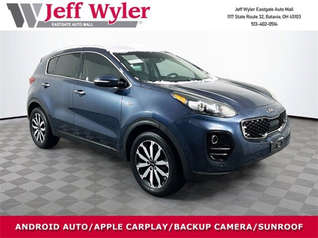 Jeff Wyler Eastgate Auto Mall is delighted to offer this fantastic 2017 Kia Sportage EX in Pacific Blue. Well equipped with: EX Premium Package (Auto-Dimming Rear View Mirror w/HomeLink, Blind Spot Detection (BSD), Heated Power Folding Mirrors, Heated Steering Wheel, Lane Change Assist (LCA), LED Interior Lighting, Panoramic Sunroof, and Rear Cross Traffic Alert (RCTA)), EX Technology Package (8-Way Power Passenger Seat w/2-Way Power Lumbar, Automated Emergency Braking, Front & Rear Park Assist, Lane Departure Warning System, Radio: AM/FM/SiriusXM w/Navigation, Smart Power Tailgate, and Ventilated Front Seats), 18" Alloy Wheels, 3-Step Heated Front Bucket Seats, 3.195 Axle Ratio, 4-Wheel Disc Brakes, 6 Speakers, ABS brakes, Air Conditioning, Alloy wheels, AM/FM radio: SiriusXM, Android Auto, Automatic temperature control, Brake assist, Bumpers: body-color, Cargo Cover, Carpet Floor Mats, Delay-off headlights, Driver door bin, Driver vanity mirror, Dual front impact airbags, Dual front side impact airbags, Electronic Stability Control, Exterior Parking Camera Rear, Four wheel independent suspension, Front anti-roll bar, Front Bucket Seats, Front Center Armrest, Front dual zone A/C, Front fog lights, Front reading lights, Fully automatic headlights, Heated door mirrors, Heated front seats, Illuminated entry, Leather Seat Trim, Leather Shift Knob, Low tire pressure warning, Occupant sensing airbag, Outside temperature display, Overhead airbag, Overhead console, Panic alarm, Passenger door bin, Passenger vanity mirror, Power door mirrors, Power driver seat, Power steering, Power windows, Radio: AM/FM/SiriusXM, Rear anti-roll bar, Rear seat center armrest, Rear window defroster, Rear window wiper, Remote keyless entry, Remote Start (Push-Button Start), Roof rack: rails only, Security system, Speed control, Speed-sensing steering, Split folding rear seat, Spoiler, Steering wheel mounted audio controls, Tachometer, Telescoping steering wheel, Tilt steering wheel, Traction control, Trip computer, and Variably intermittent wipers. CARFAX One-Owner. Reviews: * Rides smoothly over bumps; quiet interior at highway speeds; spacious seating front and rear; attractive dashboard layout with many appealing features; feels nimble around turns. Source: EdmundsAwards: * 2017 IIHS Top Safety Pick, Top Safety Pick+ * 2017 KBB.com 10 Best All-Wheel-Drive Vehicles Under $25,000 * 2017 KBB.com 12 Best Family Cars * 2017 KBB.com 10 Most Awarded Cars * 2017 KBB.com 10 Best SUVs Under $25,000 * 2017 KBB.com Best Buy Awards * 2017 KBB.com 10 Most Awarded Brands Ask about available certifications. Used vehicles 10 years of age or newer with less than 100,000 miles are eligible for the Wyler Assurance Program, but eligible vehicles must pass our reconditioning process and multi-point inspection. Provided the vehicle passes inspection, vehicles will be eligible for the 6 month/6,000 mile limited warranty. The 6 month/6,000 mile limited warranty is NOT available on AS-IS vehicles, wholesale vehicles, lease buyback/pass-thru vehicles or un-inspected vehicles. Note that this program can also apply to vehicles where the remaining factory coverage is less than 6 months or 6,000 miles. Please check the Federal Trade Commission (FTC) Buyers guide on the vehicle for full details as to whether or not warranty coverage may apply. Contact Dealer for additional details. The Wyler Assurance 6 month/6,000 Mile limited warranty ends 6 months from the date of the Retail Purchase Agreement (BUYERS ORDER) or when the vehicle's odometer registers 6,000 additional miles to the mileage listed on the BUYERS ORDER, whichever comes first. Your Deductible - The warranty holder on your contract pays the first $100 of each covered repair.