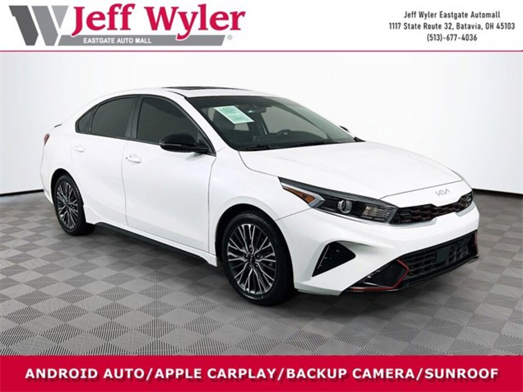 Jeff Wyler Eastgate Auto Mall is proud to offer this wonderful 2023 Kia Forte GT-Line in Snow White Pearl. Well equipped with: GT-Line Premium Package (Electronic Parking Brake (EPB), Forward Collision Avoidance-Assist - Cyclist, LED Interior Lighting, Navigation-Based Smart Cruise Control (NSCC), Power Sunroof, Radio: harman kardon Premium Audio, Smart Cruise Control w/Stop & Go, and Wireless Charging), 17" x 7.0J Alloy Wheels, 4-Wheel Disc Brakes, 6 Speakers, ABS brakes, Air Conditioning, Alloy wheels, AM/FM radio: SiriusXM, Apple CarPlay & Android Auto, Auto High-beam Headlights, Automatic temperature control, Brake assist, Bumpers: body-color, Cloth & SynTex Seat Trim, Delay-off headlights, Driver door bin, Driver vanity mirror, Dual front impact airbags, Dual front side impact airbags, Electronic Stability Control, Emergency communication system, Exterior Parking Camera Rear, Front anti-roll bar, Front Bucket Seats, Front Center Armrest, Front dual zone A/C, Front fog lights, Front reading lights, Front wheel independent suspension, Fully automatic headlights, Heated door mirrors, Illuminated entry, Leather Shift Knob, Leather steering wheel, Low tire pressure warning, Navigation System, Occupant sensing airbag, Outside temperature display, Overhead airbag, Overhead console, Panic alarm, Passenger door bin, Passenger vanity mirror, Power door mirrors, Power steering, Power windows, Radio data system, Radio: 10.25" Display Audio, Rear seat center armrest, Rear window defroster, Remote keyless entry, Security system, Speed control, Split folding rear seat, Spoiler, Sport steering wheel, Steering wheel mounted audio controls, Tachometer, Telescoping steering wheel, Tilt steering wheel, Traction control, Trip computer, Turn signal indicator mirrors, and Variably intermittent wipers. CARFAX One-Owner. Clean CARFAX. Ask about available certifications. Used vehicles 10 years of age or newer with less than 100,000 miles are eligible for the Wyler Assurance Program, but eligible vehicles must pass our reconditioning process and multi-point inspection. Provided the vehicle passes inspection, vehicles will be eligible for the 6 month/6,000 mile limited warranty. The 6 month/6,000 mile limited warranty is NOT available on AS-IS vehicles, wholesale vehicles, lease buyback/pass-thru vehicles or un-inspected vehicles. Note that this program can also apply to vehicles where the remaining factory coverage is less than 6 months or 6,000 miles. Please check the Federal Trade Commission (FTC) Buyers guide on the vehicle for full details as to whether or not warranty coverage may apply. Contact Dealer for additional details. The Wyler Assurance 6 month/6,000 Mile limited warranty ends 6 months from the date of the Retail Purchase Agreement (BUYERS ORDER) or when the vehicle's odometer registers 6,000 additional miles to the mileage listed on the BUYERS ORDER, whichever comes first. Your Deductible - The warranty holder on your contract pays the first $100 of each covered repair.