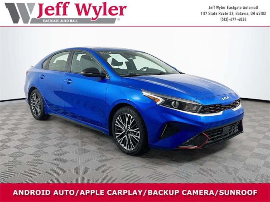 Jeff Wyler Eastgate Auto Mall is excited to offer this attractive-looking 2023 Kia Forte GT-Line in Sporty Blue. Well equipped with: GT-Line Premium Package (Electronic Parking Brake (EPB), Forward Collision Avoidance-Assist - Cyclist, LED Interior Lighting, Navigation-Based Smart Cruise Control (NSCC), Power Sunroof, Radio: harman kardon Premium Audio, Smart Cruise Control w/Stop & Go, and Wireless Charging), 17" x 7.0J Alloy Wheels, 4-Wheel Disc Brakes, 6 Speakers, ABS brakes, Air Conditioning, Alloy wheels, AM/FM radio: SiriusXM, Apple CarPlay & Android Auto, Auto High-beam Headlights, Automatic temperature control, Brake assist, Bumpers: body-color, Cloth & SynTex Seat Trim, Delay-off headlights, Driver door bin, Driver vanity mirror, Dual front impact airbags, Dual front side impact airbags, Electronic Stability Control, Emergency communication system, Exterior Parking Camera Rear, Front anti-roll bar, Front Bucket Seats, Front Center Armrest, Front dual zone A/C, Front fog lights, Front reading lights, Front wheel independent suspension, Fully automatic headlights, Heated door mirrors, Illuminated entry, Leather Shift Knob, Leather steering wheel, Low tire pressure warning, Navigation System, Occupant sensing airbag, Outside temperature display, Overhead airbag, Overhead console, Panic alarm, Passenger door bin, Passenger vanity mirror, Power door mirrors, Power steering, Power windows, Radio data system, Radio: 10.25" Display Audio, Rear seat center armrest, Rear window defroster, Remote keyless entry, Security system, Speed control, Split folding rear seat, Spoiler, Sport steering wheel, Steering wheel mounted audio controls, Tachometer, Telescoping steering wheel, Tilt steering wheel, Traction control, Trip computer, Turn signal indicator mirrors, and Variably intermittent wipers. CARFAX One-Owner. Clean CARFAX. Certified. Kia Certified Pre-Owned Details: * Roadside Assistance * 165 Point Inspection * Warranty Deductible: $50 * Limited Warranty: 12 Month/12,000 Mile (whichever comes first) "Platinum Coverage" from certified purchase date * Transferable Warranty * Includes Rental Car and Trip Interruption Reimbursement. 3 month Sirius trial subscription * Vehicle History * Powertrain Limited Warranty: 120 Month/100,000 Mile (whichever comes first) from original in-service dateAsk about available certifications. Used vehicles 10 years of age or newer with less than 100,000 miles are eligible for the Wyler Assurance Program, but eligible vehicles must pass our reconditioning process and multi-point inspection. Provided the vehicle passes inspection, vehicles will be eligible for the 6 month/6,000 mile limited warranty. The 6 month/6,000 mile limited warranty is NOT available on AS-IS vehicles, wholesale vehicles, lease buyback/pass-thru vehicles or un-inspected vehicles. Note that this program can also apply to vehicles where the remaining factory coverage is less than 6 months or 6,000 miles. Please check the Federal Trade Commission (FTC) Buyers guide on the vehicle for full details as to whether or not warranty coverage may apply. Contact Dealer for additional details. The Wyler Assurance 6 month/6,000 Mile limited warranty ends 6 months from the date of the Retail Purchase Agreement (BUYERS ORDER) or when the vehicle's odometer registers 6,000 additional miles to the mileage listed on the BUYERS ORDER, whichever comes first. Your Deductible - The warranty holder on your contract pays the first $100 of each covered repair.