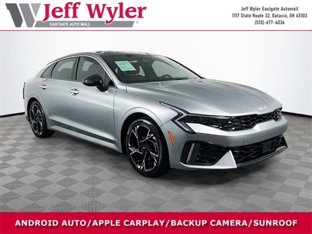 Jeff Wyler Eastgate Auto Mall is excited to offer this charming 2025 Kia K5 GT-Line in Steel Matte Gray. Well equipped with: GT-Line Premium Package (Active Sound Design, Bose Premium Audio, LED Interior Lighting, and Panoramic Sunroof), GT-Line Red Interior Package (SynTex Seat Trim), 4-Wheel Disc Brakes, 6 Speakers, ABS brakes, Air Conditioning, Alloy wheels, AM/FM radio: SiriusXM, Auto High-beam Headlights, Automatic temperature control, Brake assist, Bumpers: body-color, Carpeted Floor Mats, Delay-off headlights, Driver door bin, Driver vanity mirror, Dual front impact airbags, Dual front side impact airbags, Electronic Stability Control, Emergency communication system: Kia Connect (includes 1 year free trial), Four wheel independent suspension, Front anti-roll bar, Front Bucket Seats, Front Center Armrest, Front dual zone A/C, Front fog lights, Front reading lights, Fully automatic headlights, Heated door mirrors, Heated Front Bucket Seats, Heated front seats, Heated steering wheel, Illuminated entry, Knee airbag, Leather Shift Knob, Leather steering wheel, Low tire pressure warning, Navigation System, Occupant sensing airbag, Outside temperature display, Overhead airbag, Overhead console, Panic alarm, Passenger door bin, Passenger vanity mirror, Power door mirrors, Power driver seat, Power steering, Power windows, Radio data system, Radio: AM/FM Audio System, Rear anti-roll bar, Rear seat center armrest, Rear side impact airbag, Rear window defroster, Remote keyless entry, Security system, Speed control, Speed-sensing steering, Split folding rear seat, Sport steering wheel, Steering wheel mounted audio controls, Tachometer, Telescoping steering wheel, Tilt steering wheel, Traction control, Trip computer, Turn signal indicator mirrors, Variably intermittent wipers, and Wheels: 18" x 7.5J Gloss Black Machined Finish Alloy. CARFAX One-Owner. Ask about available certifications. Used vehicles 10 years of age or newer with less than 100,000 miles are eligible for the Wyler Assurance Program, but eligible vehicles must pass our reconditioning process and multi-point inspection. Provided the vehicle passes inspection, vehicles will be eligible for the 6 month/6,000 mile limited warranty. The 6 month/6,000 mile limited warranty is NOT available on AS-IS vehicles, wholesale vehicles, lease buyback/pass-thru vehicles or un-inspected vehicles. Note that this program can also apply to vehicles where the remaining factory coverage is less than 6 months or 6,000 miles. Please check the Federal Trade Commission (FTC) Buyers guide on the vehicle for full details as to whether or not warranty coverage may apply. Contact Dealer for additional details. The Wyler Assurance 6 month/6,000 Mile limited warranty ends 6 months from the date of the Retail Purchase Agreement (BUYERS ORDER) or when the vehicle's odometer registers 6,000 additional miles to the mileage listed on the BUYERS ORDER, whichever comes first. Your Deductible - The warranty holder on your contract pays the first $100 of each covered repair.