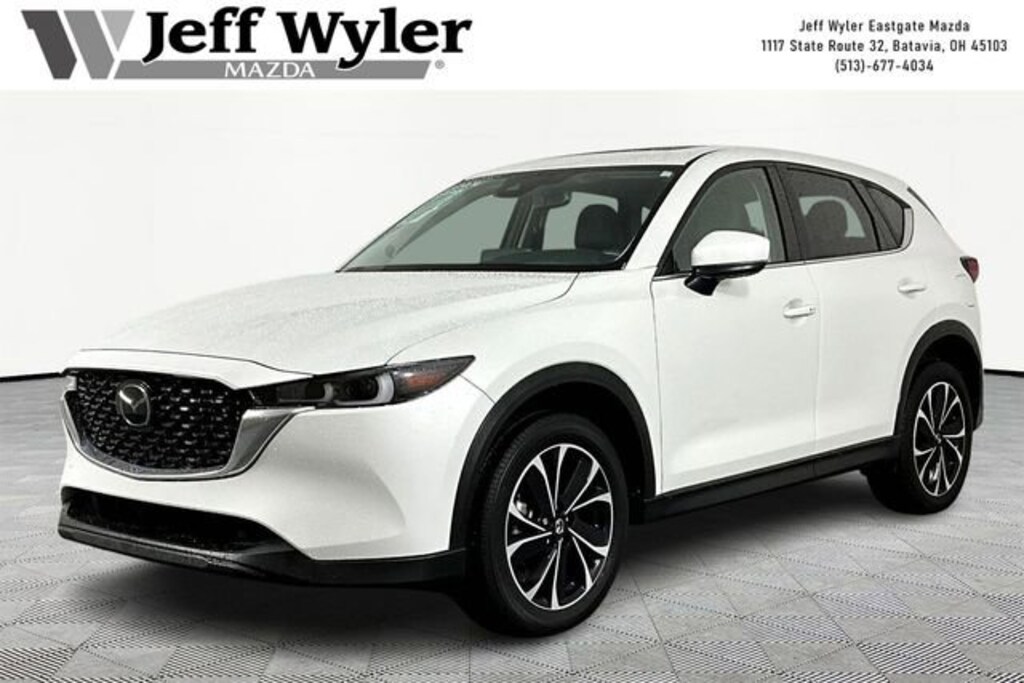 Jeff Wyler Eastgate Auto Mall is proud to offer this wonderful 2023 Mazda CX-5 2.5 S Premium Package in Rhodium White Metallic. Well equipped with: 10 Speakers, 4-Wheel Disc Brakes, 4.624 Axle Ratio, ABS brakes, Air Conditioning, Alloy wheels, AM/FM radio: SiriusXM, AppLink/Apple CarPlay and Android Auto, Auto High-beam Headlights, Auto-dimming Rear-View mirror, Automatic temperature control, Brake assist, Bumpers: body-color, Cargo Mat, Cargo Tray, Delay-off headlights, Driver door bin, Driver vanity mirror, Dual front impact airbags, Dual front side impact airbags, E911 Automatic Emergency Notification, Electronic Stability Control, Emergency communication system: MAZDA CONNECT, Exterior Parking Camera Rear, Four wheel independent suspension, Front anti-roll bar, Front Bucket Seats, Front Center Armrest w/Storage, Front dual zone A/C, Front reading lights, Fully automatic headlights, Garage door transmitter: HomeLink, Heated door mirrors, Heated Front Bucket Seats, Heated front seats, Illuminated entry, Infotainment System Voice Command, Leather Seat Trim, Leather Shift Knob, Low tire pressure warning, Memory seat, Multifunction Commander Control, Occupant sensing airbag, Outside temperature display, Overhead airbag, Overhead console, Pandora, Panic alarm, Passenger door bin, Passenger vanity mirror, Power door mirrors, Power driver seat, Power Liftgate, Power moonroof, Power passenger seat, Power steering, Power windows, Radio Broadcast Data System Program Information, Radio data system, Radio: AM/FM/HD Audio System, Rain sensing wipers, Rear anti-roll bar, Rear Bumper Guard, Rear reading lights, Rear seat center armrest, Rear window defroster, Rear window wiper, Remote keyless entry, Rhodium White Metallic Paint, Roof Rack Side Rails, SMS Text Msg Audio Delivery & Reply, Speed control, Speed-sensing steering, Split folding rear seat, Spoiler, Steering wheel mounted audio controls, Tachometer, Telescoping steering wheel, Tilt steering wheel, Traction control, Trip computer, Turn signal indicator mirrors, Variably intermittent wipers, and Wheels: 19" x 7J Aluminum Alloy. CARFAX One-Owner. Clean CARFAX. Ask about available certifications. Used vehicles 10 years of age or newer with less than 100,000 miles are eligible for the Wyler Assurance Program, but eligible vehicles must pass our reconditioning process and multi-point inspection. Provided the vehicle passes inspection, vehicles will be eligible for the 6 month/6,000 mile limited warranty. The 6 month/6,000 mile limited warranty is NOT available on AS-IS vehicles, wholesale vehicles, lease buyback/pass-thru vehicles or un-inspected vehicles. Note that this program can also apply to vehicles where the remaining factory coverage is less than 6 months or 6,000 miles. Please check the Federal Trade Commission (FTC) Buyers guide on the vehicle for full details as to whether or not warranty coverage may apply. Contact Dealer for additional details. The Wyler Assurance 6 month/6,000 Mile limited warranty ends 6 months from the date of the Retail Purchase Agreement (BUYERS ORDER) or when the vehicle's odometer registers 6,000 additional miles to the mileage listed on the BUYERS ORDER, whichever comes first. Your Deductible - The warranty holder on your contract pays the first $100 of each covered repair.