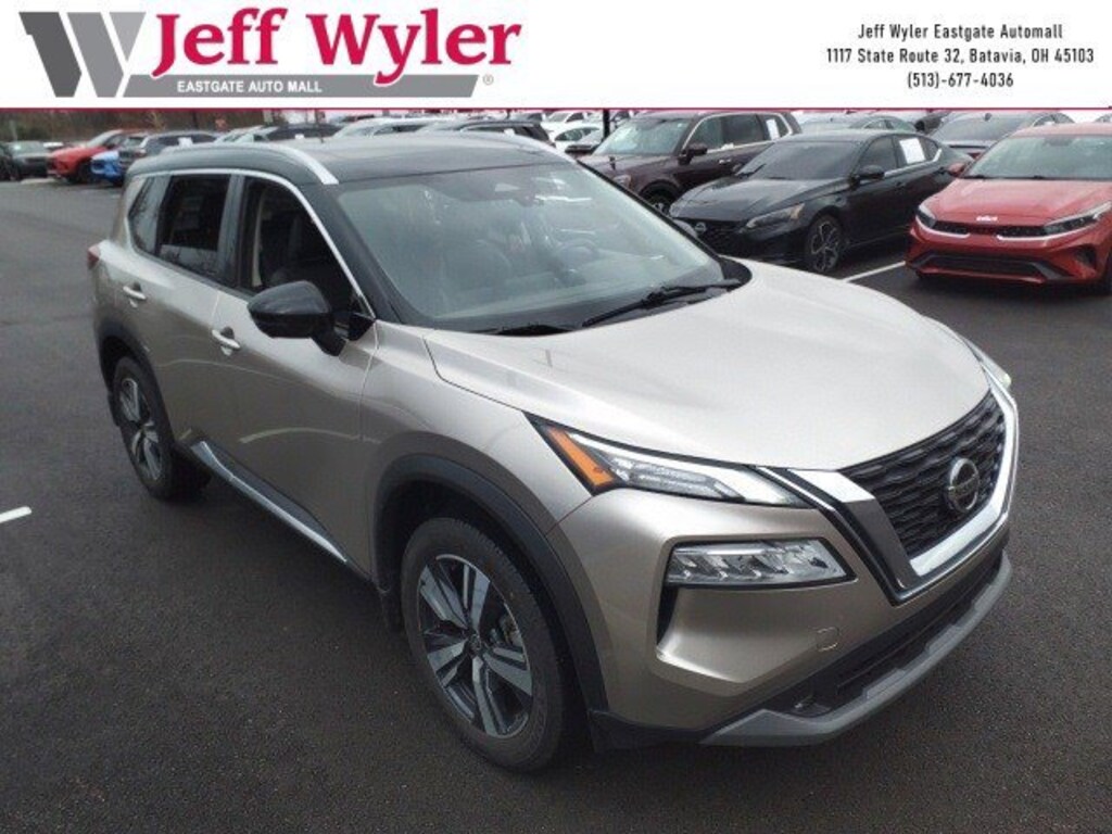Jeff Wyler Eastgate Auto Mall is very proud to offer this attractive 2021 Nissan Rogue SL in Champagne Silver Metallic/Super Black. Well equipped with: 19" Aluminum Alloy Wheels, 4-Wheel Disc Brakes, 5.604 Axle Ratio, 6 Speakers, ABS brakes, Air Conditioning, Alloy wheels, AM/FM Radio, AM/FM radio, Auto High-beam Headlights, Auto-dimming Rear-View mirror, Automatic temperature control, Black Splash Guards (Set of 4), Brake assist, Bumpers: body-color, Chrome Rear Bumper Protector, Delay-off headlights, Driver door bin, Driver vanity mirror, Dual front impact airbags, Dual front side impact airbags, Electronic Stability Control, Emergency communication system: NissanConnect Services, Exterior Parking Camera Rear, First Aid Kit, Floor Mats w/2-Piece Cargo Area Protector, Four wheel independent suspension, Front anti-roll bar, Front Bucket Seats, Front Center Armrest, Front dual zone A/C, Front fog lights, Front reading lights, Fully automatic headlights, Heated door mirrors, Heated Front Bucket Seats, Heated front seats, Heated steering wheel, Illuminated entry, Knee airbag, Leather steering wheel, Leather-Appointed Seat Trim, Low tire pressure warning, Memory seat, NissanConnect featuring Apple CarPlay and Android Auto, Occupant sensing airbag, Outside temperature display, Overhead airbag, Overhead console, Panic alarm, Passenger door bin, Passenger vanity mirror, Power door mirrors, Power driver seat, Power Liftgate, Power moonroof, Power passenger seat, Power steering, Power windows, Radio data system, Rear air conditioning, Rear anti-roll bar, Rear Parking Sensors, Rear seat center armrest, Rear side impact airbag, Rear window defroster, Rear window wiper, Remote keyless entry, Roof rack: rails only, Security system, Speed control, Speed-Sensitive Wipers, Split folding rear seat, Spoiler, Steering wheel mounted audio controls, Tachometer, Telescoping steering wheel, Tilt steering wheel, Traction control, Trip computer, Turn signal indicator mirrors, and Variably intermittent wipers. Ask about available certifications. Used vehicles 10 years of age or newer with less than 100,000 miles are eligible for the Wyler Assurance Program, but eligible vehicles must pass our reconditioning process and multi-point inspection. Provided the vehicle passes inspection, vehicles will be eligible for the 6 month/6,000 mile limited warranty. The 6 month/6,000 mile limited warranty is NOT available on AS-IS vehicles, wholesale vehicles, lease buyback/pass-thru vehicles or un-inspected vehicles. Note that this program can also apply to vehicles where the remaining factory coverage is less than 6 months or 6,000 miles. Please check the Federal Trade Commission (FTC) Buyers guide on the vehicle for full details as to whether or not warranty coverage may apply. Contact Dealer for additional details. The Wyler Assurance 6 month/6,000 Mile limited warranty ends 6 months from the date of the Retail Purchase Agreement (BUYERS ORDER) or when the vehicle's odometer registers 6,000 additional miles to the mileage listed on the BUYERS ORDER, whichever comes first. Your Deductible - The warranty holder on your contract pays the first $100 of each covered repair.
