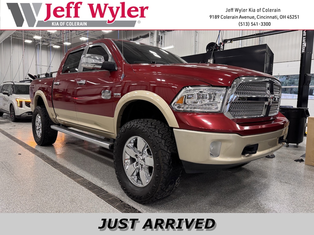 Jeff Wyler Kia of Colerain is pleased to offer this fantastic-looking 2013 Ram 1500 Laramie Longhorn in Deep Cherry Red Crystal Pearlcoat. Convenience Group (Auto High Beam Headlamp Control, Keyless Enter-N-Go, Rain Sensitive Windshield Wipers, and Remote Proximity Keyless Entry), Protection Group, Quick Order Package 25K Laramie Longhorn (DISC), 10 Speakers, 115V Auxiliary Power Outlet, 20" x 9" Aluminum Polished/Gold Inserts Wheels, 3.92 Rear Axle Ratio, 4-Wheel Disc Brakes, ABS brakes, Adjustable pedals, Air Conditioning, Alloy wheels, AM/FM radio: SiriusXM, Anti-Spin Differential Rear Axle, Audio memory, Auto-dimming door mirrors, Auto-dimming Rear-View mirror, Automatic temperature control, Brake assist, Bucket Seats, Chrome Exterior Mirrors, Chrome Tubular Side Steps, Class IV Receiver Hitch, Compass, Delay-off headlights, Driver door bin, Driver vanity mirror, Dual front impact airbags, Dual front side impact airbags, Electronic Stability Control, Emergency communication system, Exterior Mirrors Courtesy Lamps, Exterior Mirrors w/Heating Element, Exterior Mirrors w/Memory, Exterior Mirrors w/Supplemental Signals, Front anti-roll bar, Front Bucket Seats, Front Center Armrest w/Storage, Front dual zone A/C, Front fog lights, Front reading lights, Front wheel independent suspension, Fully automatic headlights, Garage door transmitter, Genuine wood dashboard insert, Genuine wood door panel insert, Heated door mirrors, Heated Front Seats, Heated front seats, Heated rear seats, Heated Second Row Seats, Heated Steering Wheel, Heated steering wheel, High Back Seats, Illuminated entry, Leather Shift Knob, Leather steering wheel, Low tire pressure warning, Memory seat, Navigation System, Occupant sensing airbag, Outside temperature display, Overhead airbag, Overhead console, Panic alarm, Passenger door bin, Passenger vanity mirror, Pedal memory, Power door mirrors, Power driver seat, Power passenger seat, Power steering, Power Sunroof, Power windows, Premium Filigree Leather Seats, Radio data system, Radio: Uconnect 8.4AN AM/FM/BT/Access/NAV, Rear 60/40 Split Folding Seat, Rear anti-roll bar, Rear seat center armrest, Rear step bumper, Remote keyless entry, Security system, Single Disc Remote CD Player, Speed control, Split folding rear seat, Steering Wheel Mounted Audio Controls, Steering wheel mounted audio controls, Tachometer, Tilt steering wheel, Traction control, Trailer Brake Control, Tri-Fold Tonneau Cover, Trip computer, Turn signal indicator mirrors, Variably intermittent wipers, Ventilated Front Seats, Ventilated front seats, and Voltmeter Our PRE-OWNED vehicles are put through a rigorous 167- POINT QUALITY ASSURANCE INSPECTION along with an average amount of over $1,400.00 SPENT to recondition each vehicle so we can be sure to deliver you the highest quality vehicle like you deserve! ***ONLINE PRICE DOES NOT INCLUDE WYLER FAMILY FIRST PACKAGE***