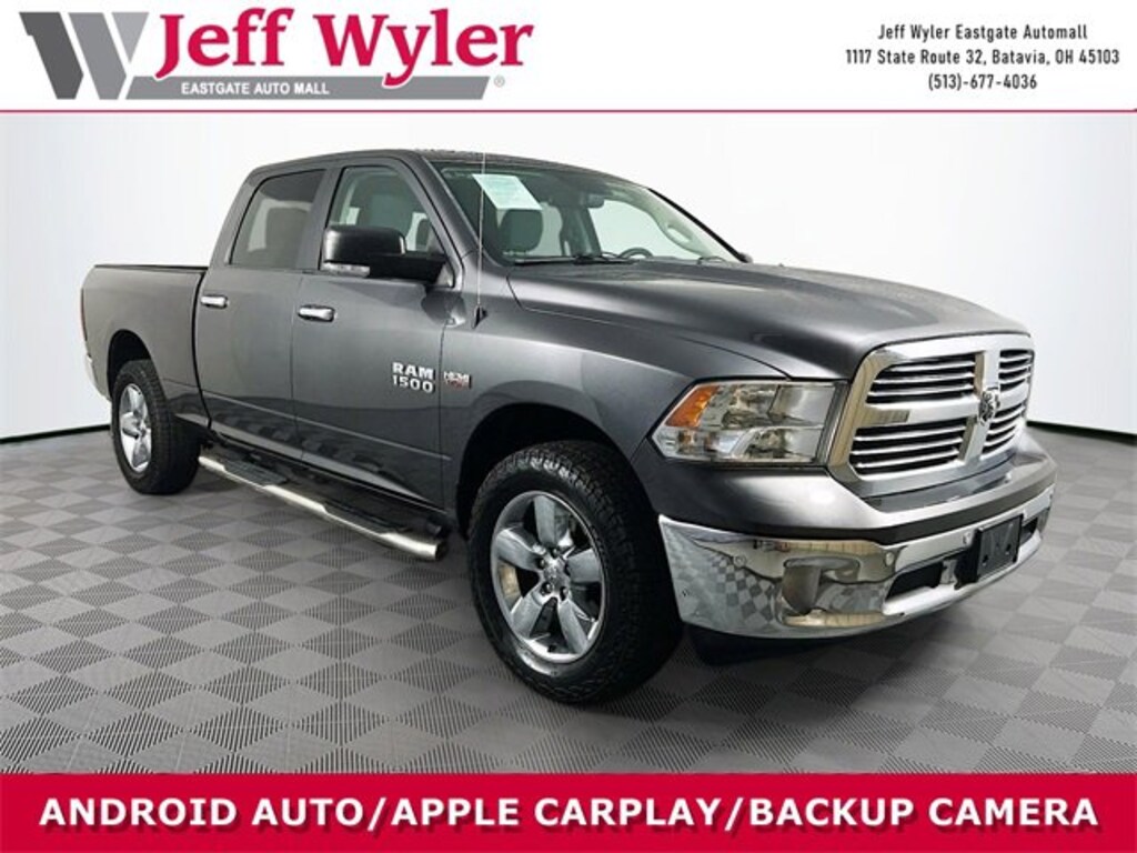 Jeff Wyler Eastgate Auto Mall is proud to offer this gorgeous 2017 Ram 1500 Big Horn in Granite Crystal Metallic Clearcoat. Well equipped with: Big Horn Regional Package, Quick Order Package 26S Big Horn (115V Auxiliary Power Outlet, 40/20/40 Split Bench Seat, 6 Month Trial (Reg. Required), 6 Month Trial (Registration Required), 8.4" Touchscreen Display, Air Conditioning ATC w/Dual Zone Control, Audio Jack Input for Mobile Devices, Auto-Dimming Exterior Mirrors, Auto-Dimming Rear-View Mirror, Big Horn Badge, Bright/Bright Billets Grille, Charge Only Remote USB Port, Class IV Receiver Hitch, Dual Rear Exhaust w/Bright Tips, Electric Shift-On-Demand Transfer Case, Electroluminescent Instrument Cluster, Exterior Mirrors Courtesy Lamps, Exterior Mirrors w/Supplemental Signals, Fog Lamps, Folding Flat Load Floor Storage, For Details Visit DriveUconnect.com, Front Armrest w/3 Cupholders, Front Center Seat Cushion Storage, Glove Box Lamp, GPS Antenna Input, Integrated Voice Command w/Bluetooth, Leather Wrapped Steering Wheel, LED Bed Lighting, Media Hub (USB, AUX), Nav-Capable! See Dealer for Details, Overhead Console w/Garage Door Opener, ParkSense Front/Rear Park Assist System, ParkView Rear Back-Up Camera, Power 10-Way Driver Seat, Power Heated Fold-Away Mirrors, Power Lumbar Adjust, Power-Folding Mirrors, Premium Cloth 40/20/40 Bench Seat, Radio: Uconnect 3C w/8.4" Display, Rear 60/40 Split Folding Seat, Rear Dome w/On/Off Switch Lamp, Remote Start System, Remote USB Port, Security Alarm, SIRIUSXM Satellite Radio, Steering Wheel Mounted Audio Controls, Storage Tray, Sun Visors w/Illuminated Vanity Mirrors, Uconnect Access, Underhood Lamp, Universal Garage Door Opener, and Wheels: 20" x 8" Aluminum Chrome Clad), 17" x 7" Aluminum Wheels, 3.21 Rear Axle Ratio, 4-Wheel Disc Brakes, 6 Speakers, ABS brakes, Active Grille Shutters, Air Conditioning, Alloy wheels, AM/FM radio, Black Exterior Mirrors, Black Rotary Shifter, Brake assist, Bumpers: chrome, Center Hub, Cloth 40/20/40 Bench Seat, Compass, Delay-off headlights, Driver door bin, Dual front impact airbags, Dual front side impact airbags, Electronic Shift, Electronic Stability Control, Electronically Controlled Throttle, Engine Oil Heat Exchanger, Exterior Mirrors w/Heating Element, Front anti-roll bar, Front Center Armrest w/Storage, Front reading lights, Front wheel independent suspension, Fully automatic headlights, Heated door mirrors, Heavy-Duty Engine Cooling, Hemi Badge, Illuminated entry, Low tire pressure warning, Manufacturer's Statement of Origin, Occupant sensing airbag, Outside temperature display, Overhead airbag, Overhead console, Panic alarm, Passenger door bin, Passenger vanity mirror, Power door mirrors, Power steering, Power windows, Radio data system, Radio: Uconnect 3 w/5" Display, Rear anti-roll bar, Rear seat center armrest, Rear step bumper, Remote keyless entry, Speed control, Tachometer, Tilt steering wheel, Tip Start, Traction control, Trip computer, Variably intermittent wipers, and VoltmeteR. Ask about available certifications. Used vehicles 10 years of age or newer with less than 100,000 miles are eligible for the Wyler Assurance Program, but eligible vehicles must pass our reconditioning process and multi-point inspection. Provided the vehicle passes inspection, vehicles will be eligible for the 6 month/6,000 mile limited warranty. The 6 month/6,000 mile limited warranty is NOT available on AS-IS vehicles, wholesale vehicles, lease buyback/pass-thru vehicles or un-inspected vehicles. Note that this program can also apply to vehicles where the remaining factory coverage is less than 6 months or 6,000 miles. Please check the Federal Trade Commission (FTC) Buyers guide on the vehicle for full details as to whether or not warranty coverage may apply. Contact Dealer for additional details. The Wyler Assurance 6 month/6,000 Mile limited warranty ends 6 months from the date of the Retail Purchase Agreement (BUYERS ORDER) or when the vehicle's odometer regi