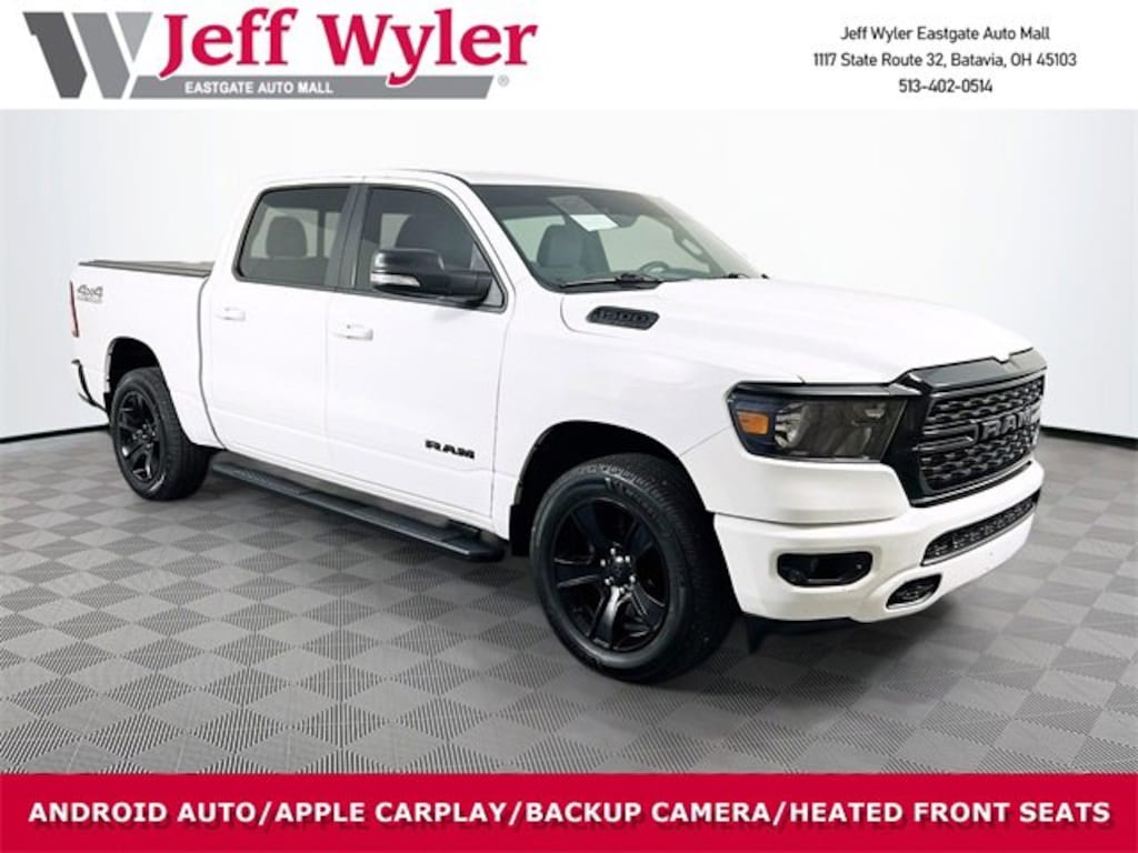 Jeff Wyler Eastgate Auto Mall is excited to offer this attractive-looking 2022 Ram 1500 Big Horn/Lone Star in Bright White Clearcoat. Well equipped with: Big Horn Level B Equipment Group (DISC) (115V Auxiliary Power Outlet, 115V Auxiliary Rear Power Outlet, 2nd Row In Floor Storage Bins, 400W Inverter, 4G LTE Wi-Fi Hot Spot, 8.4" Touchscreen Display, Air Conditioning ATC w/Dual Zone Control, Apple CarPlay, Auto-Dimming Exterior Driver Mirror, Auto-Dimming Rear-View Mirror, Black Premium Power Mirrors (GUL), Bluetooth Handsfree Phone & Audio, Class IV Receiver Hitch, Cluster 7.0" TFT Color Display, Connectivity - US/Canada, Exterior Mirrors Courtesy Lamps, Exterior Mirrors w/Supplemental Signals, Foam Bottle Insert (Door Trim Panel), For More Info, Call 800-643-2112, Glove Box Lamp, Google Android Auto, Heated Front Seats, Heated Steering Wheel, Integrated Center Stack Radio, Media Hub w/2 Charge Only USBs, ParkSense Front/Rear Park Assist w/Stop, Power 2-Way Driver Lumbar Adjust, Power 8-Way Driver Seat, Power Adjustable Pedals, Radio: Uconnect 5 W w/8.4" Display, Rear Dome w/On/Off Switch Lamp, Rear Power Sliding Window, Rear Window Defroster, Remote Start System, Security Alarm, SiriusXM Radio Service, SiriusXM Satellite Radio, Sun Visors w/Illuminated Vanity Mirrors, Universal Garage Door Opener, and USB Host Flip), Night Edition (DISC) (3 Rear Seat Head Restraints, 4 Way Front Headrests, Anti-Spin Differential Rear Axle, Black Exterior Truck Badging, Black Headlamp Bezels, Black Interior Accents, Body Color Front Bumper, Body Color Rear Bumper w/Step Pads, Bucket Seats, Delete LED Lamp - Floor Console Bin, Deluxe Cloth Bucket Seats, Dual Exhaust w/Black Tips, Front Seat Back Map Pockets, Full Length Floor Console, Manual Adjust 4-Way Front Passenger Seat, Rear 60/40 Folding Seat, Rear Center Armrest, and Wheels: 20" x 9.0" Premium Paint/Polished (DISC)), Quick Order Package 25Z Big Horn (Big Horn Badge), 3.21 Rear Axle Ratio, 4-Wheel Disc Brakes, 48V Belt Starter Generator, 6 Speakers, ABS brakes, Air Conditioning, Alloy wheels, AM/FM radio, Black Exterior Mirrors, Brake assist, Bumpers: chrome, Cloth Bench Seat, Compass, Convex Wide-Angle Mirror Insert, Delay-off headlights, Driver door bin, Dual front impact airbags, Dual front side impact airbags, Electronic Stability Control, Emergency communication system: SiriusXM Guardian, Front anti-roll bar, Front Center Armrest w/Storage, Front fog lights, Front License Plate Bracket, Front reading lights, Front wheel independent suspension, Fully automatic headlights, Global Telematics Box Module (TBM), GPS Antenna Input, Heated door mirrors, Heavy-Duty Engine Cooling, Illuminated entry, Integrated Voice Command w/Bluetooth, Leather steering wheel, Low tire pressure warning, Occupant sensing airbag, Outside temperature display, Overhead airbag, Overhead console, Panic alarm, ParkView Rear Back-Up Camera, Passenger door bin, Passenger vanity mirror, Power door mirrors, Power steering, Power windows, Radio data system, Radio: Uconnect 3 w/5" Display, Rear anti-roll bar, Rear seat center armrest, Rear step bumper, Rear Underseat Compartment Storage (DISC), Remote keyless entry, Speed control, Split folding rear seat, Steering wheel mounted audio controls, Tachometer, Telescoping steering wheel, Tilt steering wheel, Traction control, Trip computer, Variably intermittent wipers, Voltmeter, and Wheels: 18" x 8" Cast-Aluminum Painted. Clean CARFAX. Ask about available certifications. Used vehicles 10 years of age or newer with less than 100,000 miles are eligible for the Wyler Assurance Program, but eligible vehicles must pass our reconditioning process and multi-point inspection. Provided the vehicle passes inspection, vehicles will be eligible for the 6 month/6,000 mile limited warranty. The 6 month/6,000 mile limited warranty is NOT available on AS-IS vehicles, wholesale vehicles, lease buyback/pass-thru vehicles or un-inspected vehicles. Note that this program can also apply to veh