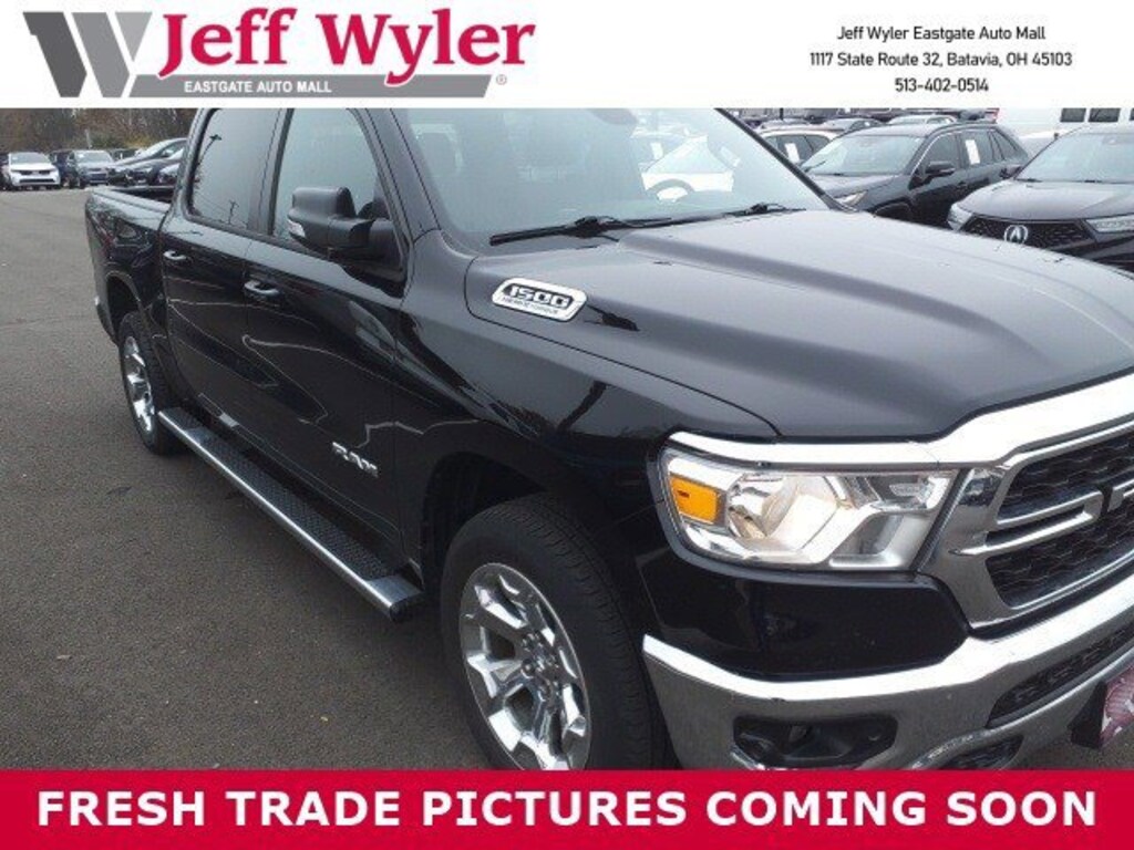 Jeff Wyler Eastgate Auto Mall is pleased to offer this great-looking 2022 Ram 1500 Big Horn/Lone Star in Diamond Black Crystal Pearlcoat. Well equipped with: Big Horn Level 2 Equipment Group (115V Auxiliary Power Outlet, 115V Auxiliary Rear Power Outlet, 2nd Row In Floor Storage Bins, 400W Inverter, 4G LTE Wi-Fi Hot Spot, 8.4" Touchscreen Display, Air Conditioning ATC w/Dual Zone Control, Apple CarPlay, Auto-Dimming Exterior Driver Mirror, Auto-Dimming Rear-View Mirror, Black Exterior Mirrors, Black Premium Power Mirrors, Bluetooth Handsfree Phone & Audio, Class IV Receiver Hitch, Cluster 7.0" TFT Color Display, Connectivity - US/Canada, Convex Wide-Angle Mirror Insert, Exterior Mirrors Courtesy Lamps, Exterior Mirrors w/Heating Element, Exterior Mirrors w/Supplemental Signals, For Details, Visit DriveUconnect.com, Global Telematics Box Module (TBM), Glove Box Lamp, Google Android Auto, GPS Antenna Input, Heated Front Seats, Heated Steering Wheel, Integrated Center Stack Radio, Media Hub w/2 Charge Only USBs, ParkSense Front/Rear Park Assist w/Stop, Power 2-Way Driver Lumbar Adjust, Power 8-Way Driver Seat, Power Adjustable Pedals, Power-Folding Mirrors, Radio: Uconnect 5 W w/8.4" Display, Rear Dome w/On/Off Switch Lamp, Rear Power Sliding Window, Rear Window Defroster, Remote Start System, Security Alarm, SiriusXM Radio Service, SiriusXM Satellite Radio, Sun Visors w/Illuminated Vanity Mirrors, Universal Garage Door Opener, and USB Host Flip), Quick Order Package 27Z Big Horn (Big Horn Badge), 3 Rear Seat Head Restraints, 3.21 Rear Axle Ratio, 4 Way Front Headrests, 4-Wheel Disc Brakes, 48V Belt Starter Generator, 6 Speakers, ABS brakes, Air Conditioning, Alloy wheels, AM/FM radio, Brake assist, Bumpers: chrome, Cloth Bench Seat, Compass, Connected Services Delete Credit, Delay-off headlights, Driver door bin, Dual front impact airbags, Dual front side impact airbags, Electronic Stability Control, Emergency communication system: SiriusXM Guardian, Front anti-roll bar, Front Center Armrest w/Storage, Front fog lights, Front License Plate Bracket, Front reading lights, Front Seat Back Map Pockets, Front wheel independent suspension, Fully automatic headlights, Heated door mirrors, Heavy-Duty Engine Cooling, Illuminated entry, Integrated Voice Command w/Bluetooth, Leather steering wheel, Low tire pressure warning, MOPAR Front & Rear Rubber Floor Mats, Occupant sensing airbag, Outside temperature display, Overhead airbag, Overhead console, Panic alarm, ParkView Rear Back-Up Camera, Passenger door bin, Passenger vanity mirror, Power door mirrors, Power steering, Power windows, Radio data system, Radio: Uconnect 3 w/5" Display, Rear 60/40 Folding Seat, Rear anti-roll bar, Rear seat center armrest, Rear step bumper, Remote keyless entry, Speed control, Split folding rear seat, Steering wheel mounted audio controls, Tachometer, Telescoping steering wheel, Tilt steering wheel, Traction control, Trip computer, Variably intermittent wipers, Voltmeter, Wheel to Wheel Side Steps, Wheels: 18" x 8" Cast-Aluminum Painted, and Wheels: 20" x 9" Aluminum Chrome Clad (WRK) CARFAX One-Owner. Clean CARFAX. Ask about available certifications. Used vehicles 10 years of age or newer with less than 100,000 miles are eligible for the Wyler Assurance Program, but eligible vehicles must pass our reconditioning process and multi-point inspection. Provided the vehicle passes inspection, vehicles will be eligible for the 6 month/6,000 mile limited warranty. The 6 month/6,000 mile limited warranty is NOT available on AS-IS vehicles, wholesale vehicles, lease buyback/pass-thru vehicles or un-inspected vehicles. Note that this program can also apply to vehicles where the remaining factory coverage is less than 6 months or 6,000 miles. Please check the Federal Trade Commission (FTC) Buyers guide on the vehicle for full details as to whether or not warranty coverage may apply. Contact Dealer for additional details. The Wyler Assurance 6 month/6,000 Mile limited