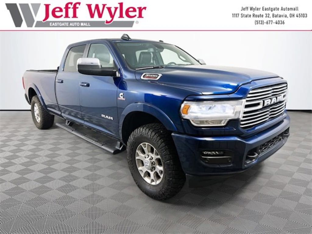 Jeff Wyler Eastgate Auto Mall is honored to offer this outstanding 2022 Ram 3500 Laramie in Patriot Blue Pearlcoat. Well equipped with: Cold Weather Group (Engine Block Heater and MOPAR Winter Front Grille Cover), Laramie Level D Equipment Group (DISC) (17 Speaker harman kardon Premium Sound, 2nd Row In Floor Storage Bins, 4G LTE Wi-Fi Hot Spot, 8.4" Touchscreen Display, Alexa Built-In, All R1 High Radios, All Radio Equipped Vehicles, Apple CarPlay, Auto High Beam Headlamp Control, Connected Travel & Traffic Services, Connectivity - US/Canada, Disassociated Touchscreen Display, Exterior Mirrors w/Memory, Foam Bottle Insert (Door Trim Panel), For Details Visit DriveUconnect.com, For More Info, Call 800-643-2112, Global Telematics Box Module (TBM), Google Android Auto, GPS Antenna Input, GPS Navigation, HD Radio, Heated Second Row Seats, Integrated Center Stack Radio, Integrated Voice Command w/Bluetooth, Mirror-Mounted Aux Reverse Lamps, Off-Road Information Pages, Power Adjustable Pedals w/Memory, Power Multi-Function Manual Folding Mirrors, Radio: Uconnect 5 Nav w/8.4" Display, Radio/Driver Seat/Mirrors/Pedals Memory, Rain Sensitive Windshield Wipers, Remote Tailgate Release, Selectable Tire Fill Alert, SiriusXM Radio Service, SiriusXM w/360L, and Ventilated Front Seats), Protection Group, Quick Order Package 21H Laramie, Sport Appearance Package (Black Interior Accents, Body Color Door Handles, Body Color Grille Surround, Center Hub, Painted Front Bumper, Painted Rear Bumper, and Sport Decal), #1 Seat Foam Cushion, 10 Speakers, 115V Auxiliary Rear Power Outlet, 2 Way Rear Headrest Seat, 220 Amp Alternator, 3.73 Axle Ratio, 4 Way Front Headrests, 4-Wheel Disc Brakes, 5th Wheel/Gooseneck Towing Prep Group, ABS brakes, Active Noise Control System, Adjustable pedals, Air Conditioning, Air Suspension Decal, Alloy wheels, AM/FM radio: SiriusXM, Apple CarPlay/Android Auto, Auto Level Rear Air Suspension, Auto-dimming Rear-View mirror, Automatic temperature control, Bluetooth Handsfree Phone & Audio, Brake assist, Bumpers: chrome, Chrome Exterior Mirrors, Compass, Dash Pass Thru Wire Circuits, Delay-off headlights, Driver door bin, Driver vanity mirror, Dual front impact airbags, Dual front side impact airbags, Electronic Stability Control, Electronically Controlled Throttle, Folding Flat Load Floor Storage, Front anti-roll bar, Front Bumper Sight Shields, Front Center Armrest w/Storage, Front dual zone A/C, Front fog lights, Front License Plate Bracket, Front reading lights, Front Seat Back Map Pockets, Fully automatic headlights, Garage door transmitter, Heated door mirrors, Heated Front Seats, Heated front seats, Heated Steering Wheel, Heated steering wheel, High Back Seats, I/P Mounted Auxiliary Switches, Illuminated entry, Leather steering wheel, Leather Trim 40/20/40 Bench Seat, Low tire pressure warning, MOPAR Spray In Bedliner, Occupant sensing airbag, Outside temperature display, Overhead airbag, Overhead console, Panic alarm, ParkView Rear Back-Up Camera, Passenger door bin, Passenger vanity mirror, Power 8-Way Adjustable Passenger Seat, Power Adjust 8-Way Driver Seat, Power door mirrors, Power driver seat, Power passenger seat, Power steering, Power windows, Radio data system, Radio: Uconnect 5 w/8.4" Display, Rear 60/40 Folding Seat, Rear reading lights, Rear seat center armrest, Rear step bumper, Rear window defroster, Remote keyless entry, Security system, SiriusXM Satellite Radio, Speed control, Split folding rear seat, Steering wheel mounted audio controls, Tachometer, Tilt steering wheel, Tip Start, Traction control, Trip computer, Turn signal indicator mirrors, Variably intermittent wipers, Voltmeter, and Wheels: 18" x 8.0" Polished AluminuM. CARFAX One-Owner. Ask about available certifications. Used vehicles 10 years of age or newer with less than 100,000 miles are eligible for the Wyler Assurance Program, but eligible vehicles must pass our reconditioning process and multi-point inspection. Provided the vehicle p