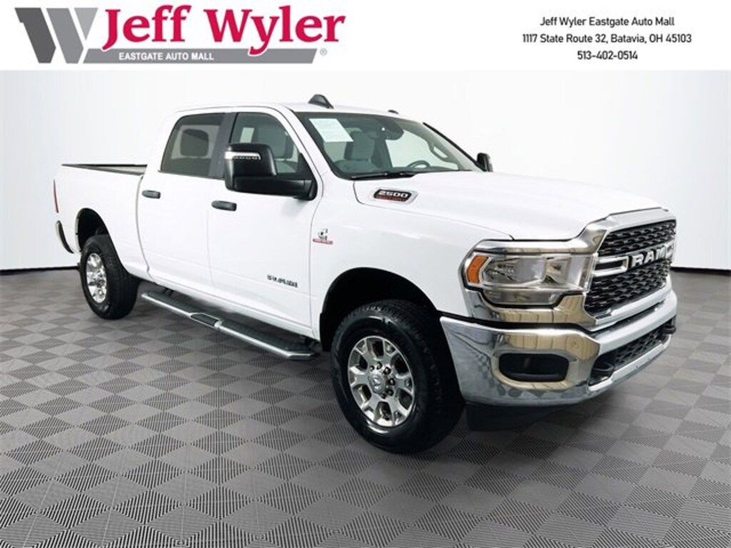 Jeff Wyler Eastgate Auto Mall is honored to offer this charming 2024 Ram 2500 Big Horn in Bright White Clearcoat. Well equipped with: Level 1 Equipment Group (2 Way Rear Headrest Seat, 2nd Row In Floor Storage Bins, 4 Way Front Headrests, 40/20/40 Split Bench Seat, 4G LTE Wi-Fi Hot Spot, 8.4" Touchscreen Display, Apple CarPlay, Auto Power-Folding Mirrors, Big Horn IP Badge, Black Exterior Mirrors, Bluetooth Handsfree Phone & Audio, Center Hub, Connectivity - US/Canada, Dual Glove Boxes, Exterior Mirrors Courtesy Lamps, Exterior Mirrors w/Heating Element, Exterior Mirrors w/Supplemental Signals, Foam Bottle Insert (Door Trim Panel), Footwell Courtesy Lamp, For Details, Visit DriveUconnect.com, For More Info, Call 800-643-2112, Forward & Reverse Utility Lights, Front Armrest w/Cupholders, Front Center Seat Cushion Storage, Front Fog Lamps, Front Seat Back Map Pockets, Global Telematics Box Module (TBM), Glove Box Lamp, Google Android Auto, GPS Antenna Input, Integrated Center Stack Radio, Integrated Voice Command w/Bluetooth, Leather Wrapped Steering Wheel, Locking Lower Glove Box, Manual Adjust 4-Way Front Passenger Seat, Mirror Running Lights, Power 2-Way Driver Lumbar Adjust, Power Adjust 8-Way Driver Seat, Power Adjust Mirrors, Power Adjustable Convex Aux Mirrors, Power Heated Fold Telescope Mirrors, Power Telescoping Mirrors, Rear 60/40 Folding Seat, Rear Dome w/On/Off Switch Lamp, Remote USB Port - Charge Only, Selectable Tire Fill Alert, SiriusXM Radio Service, SiriusXM Satellite Radio, Steering Wheel Mounted Audio Controls, Storage Tray, and Wheels: 18" x 8.0" Polished Aluminum), Quick Order Package 2HZ Big Horn, 3.73 Axle Ratio, 4-Wheel Disc Brakes, 6 Speakers, ABS brakes, Active Noise Control System, Air Conditioning, Anti-Spin Differential Rear Axle, Brake assist, Bumpers: chrome, Center Stack Storage Drawer, Chrome Flat Cab-Length Side Steps, Cloth 40/20/40 Bench Seat, Compass, Delay-off headlights, Driver door bin, Dual front impact airbags, Dual front side impact airbags, Electronic Stability Control, Electronically Controlled Throttle, Emergency communication system: SiriusXM Guardian, Front anti-roll bar, Front Center Armrest w/Storage, Front License Plate Bracket, Front reading lights, Fully automatic headlights, Heated door mirrors, Illuminated entry, Low tire pressure warning, Manual Adjust 4-Way Driver Seat, Manufacturer's Statement of Origin, Occupant sensing airbag, Outside temperature display, Overhead airbag, Overhead console, Panic alarm, ParkView Rear Back-Up Camera, Passenger door bin, Passenger vanity mirror, Power door mirrors, Power steering, Power windows, Premium Cloth 40/20/40 Bench Seat (DISC), Radio data system, Radio: Uconnect 3 w/5" Display, Radio: Uconnect 5 W w/8.4" Display, Rear anti-roll bar, Rear Folding Seat, Rear seat center armrest, Rear step bumper, Remote keyless entry, Speed control, Tachometer, Tilt steering wheel, Tip Start, Tow Hooks, Traction control, Trip computer, Turn signal indicator mirrors, Variably intermittent wipers, Voltmeter, and Wheels: 18" x 8.0" Steel Chrome ClaD. CARFAX One-Owner. Clean CARFAX. Ask about available certifications. Used vehicles 10 years of age or newer with less than 100,000 miles are eligible for the Wyler Assurance Program, but eligible vehicles must pass our reconditioning process and multi-point inspection. Provided the vehicle passes inspection, vehicles will be eligible for the 6 month/6,000 mile limited warranty. The 6 month/6,000 mile limited warranty is NOT available on AS-IS vehicles, wholesale vehicles, lease buyback/pass-thru vehicles or un-inspected vehicles. Note that this program can also apply to vehicles where the remaining factory coverage is less than 6 months or 6,000 miles. Please check the Federal Trade Commission (FTC) Buyers guide on the vehicle for full details as to whether or not warranty coverage may apply. Contact Dealer for additional details. The Wyler Assurance 6 month/6,000 Mile limited warranty ends 6 months from