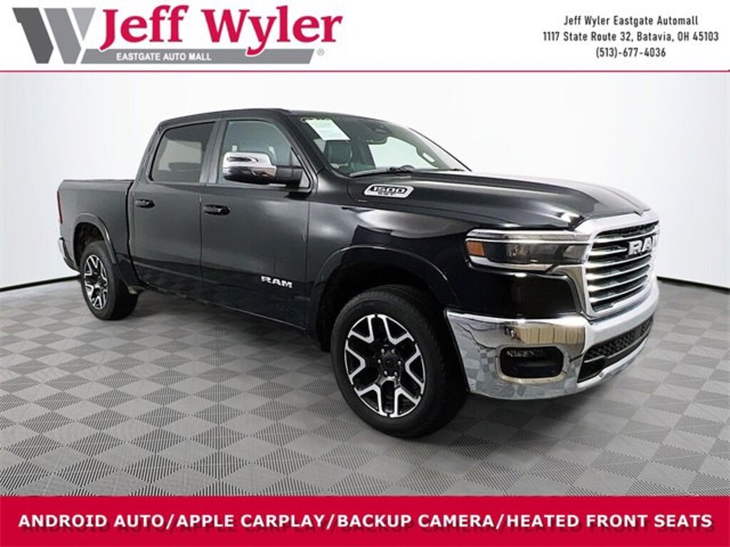 Jeff Wyler Eastgate Auto Mall is honored to offer this good-looking 2025 Ram 1500 Laramie in Diamond Black Crystal Pearlcoat. Well equipped with: Laramie Level 1 Equipment Group (Rain Sensitive Windshield Wipers and Remote Tailgate Release), Quick Order Package 21H Laramie, 10 Speakers, 3 Rear Seat Head Restraints, 3.55 Rear Axle Ratio, 4 Way Front Headrests, 4-Wheel Disc Brakes, 4G LTE Wi-Fi Hot Spot, ABS brakes, Air Conditioning, Alloy wheels, AM/FM radio: SiriusXM with 360L, Apple CarPlay, Apple CarPlay/Android Auto, Audio memory, Auto High-beam Headlights, Auto Power-Folding Mirrors, Auto-dimming door mirrors, Auto-Dimming Exterior Driver Mirror, Auto-dimming Rear-View mirror, Automatic temperature control, Brake assist, Bumpers: chrome, Chrome Exterior Mirrors, Compass, Connected Travel & Traffic Services, Connectivity - US/Canada, Convex Wide-Angle Exterior Mirror Insert, Delay-off headlights, Driver door bin, Driver Seat Memory, Driver vanity mirror, Dual front impact airbags, Dual front side impact airbags, Electronic Stability Control, Exterior Mirrors Courtesy Lamps, Exterior Mirrors w/Heating Element, Exterior Mirrors w/Memory, Exterior Mirrors w/Supplemental Signals, Front anti-roll bar, Front Center Armrest w/Storage, Front dual zone A/C, Front fog lights, Front License Plate Bracket, Front reading lights, Front Seat Back Map Pockets, Front wheel independent suspension, Fully automatic headlights, Garage door transmitter, Google Android Auto, GPS Antenna Input, GPS Navigation, HD Radio, Heated door mirrors, Heated Front Seats, Heated front seats, Heated rear seats, Heated Steering Wheel, Heated steering wheel, Illuminated entry, Integrated Voice Command w/Bluetooth, Leather steering wheel, Leather Trim 40/20/40 Bench Seat, Low tire pressure warning, Manufacturer's Statement of Origin, Memory seat, Navigation System, Occupant sensing airbag, Outside temperature display, Overhead airbag, Overhead console, Panic alarm, ParkView Rear Back-Up Camera, Passenger door bin, Passenger vanity mirror, Power 2-Way Driver Lumbar Adjust, Power 2-Way Passenger Lumbar Adjust, Power Adjust 8-Way Front Passenger Seat, Power door mirrors, Power driver seat, Power passenger seat, Power steering, Power windows, Radio data system, Radio: Uconnect 5 Nav w/12.0" Display, RAM Grille Badge - Chrome, Rear anti-roll bar, Rear reading lights, Rear seat center armrest, Rear step bumper, Remote keyless entry, Security system, SiriusXM w/360L, Speed control, Split folding rear seat, Steering wheel mounted audio controls, Tachometer, Telescoping steering wheel, Tilt steering wheel, Traction control, Trip computer, Turn signal indicator mirrors, USB Host Flip, Variably intermittent wipers, Ventilated Front Seats, Ventilated front seats, Voltmeter, and Wheels: 20" x 9" Premium Paint/Polish. CARFAX One-Owner. Awards: * Motor Trend Automobiles of the year Ask about available certifications. Used vehicles 10 years of age or newer with less than 100,000 miles are eligible for the Wyler Assurance Program, but eligible vehicles must pass our reconditioning process and multi-point inspection. Provided the vehicle passes inspection, vehicles will be eligible for the 6 month/6,000 mile limited warranty. The 6 month/6,000 mile limited warranty is NOT available on AS-IS vehicles, wholesale vehicles, lease buyback/pass-thru vehicles or un-inspected vehicles. Note that this program can also apply to vehicles where the remaining factory coverage is less than 6 months or 6,000 miles. Please check the Federal Trade Commission (FTC) Buyers guide on the vehicle for full details as to whether or not warranty coverage may apply. Contact Dealer for additional details. The Wyler Assurance 6 month/6,000 Mile limited warranty ends 6 months from the date of the Retail Purchase Agreement (BUYERS ORDER) or when the vehicle's odometer registers 6,000 additional miles to the mileage listed on the BUYERS ORDER, whichever comes first. Your Deductible - The warranty holder on yo