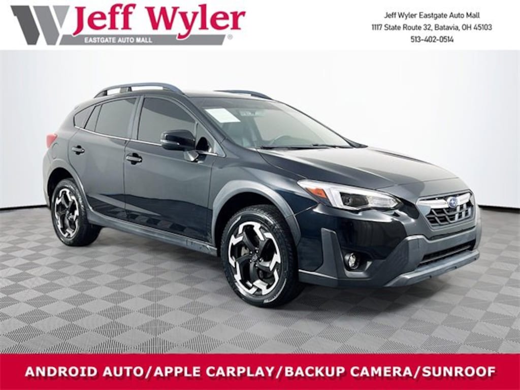 Jeff Wyler Eastgate Auto Mall is proud to offer this good-looking 2021 Subaru Crosstrek Limited in Crystal Black Silica. Well equipped with: Moonroof Package 1 (Power Moonroof), 3.70 Axle Ratio, 4-Wheel Disc Brakes, 6 Speakers, ABS brakes, Aero Crossbar Set, Air Conditioning, All-Weather Floor Liners, Alloy wheels, AM/FM radio: SiriusXM, Anti-whiplash front head restraints, Auto High-beam Headlights, Auto-Dimming Mirror w/Compass & HomeLink, Automatic temperature control, Brake assist, Bumpers: body-color, CD player, Driver door bin, Driver vanity mirror, Dual front impact airbags, Dual front side impact airbags, Electronic Stability Control, Emergency communication system: STARLINK Safety and Security (Subscription Required), Exterior Parking Camera Rear, Four wheel independent suspension, Front anti-roll bar, Front Bucket Seats, Front Center Armrest, Front fog lights, Front reading lights, Fully automatic headlights, Heated door mirrors, Heated Front Bucket Seats, Heated front seats, Illuminated entry, Knee airbag, Leather-Trimmed Upholstery, Low tire pressure warning, Map & Dome Lights LED Upgrade, Occupant sensing airbag, Outside temperature display, Overhead airbag, Overhead console, Panic alarm, Passenger door bin, Passenger vanity mirror, Power door mirrors, Power driver seat, Power steering, Power windows, Radio data system, Radio: Subaru STARLINK 8.0" Multimedia Plus System, Rear anti-roll bar, Rear Bumper Cover, Rear seat center armrest, Rear window defroster, Rear window wiper, Remote keyless entry, Security system, Side Sill Plate, Speed control, Speed-sensing steering, Split folding rear seat, Spoiler, STARLINK/Apple CarPlay/Android Auto, Steering wheel mounted audio controls, Subaru STARLINK Smartphone Integration, Tachometer, Telescoping steering wheel, Tilt steering wheel, Traction control, Trip computer, Turn signal indicator mirrors, Variably intermittent wipers, and Wheels: 18" Alloy Machine Finish. CARFAX One-Owner. Awards: * ALG Residual Value Awards, Residual Value Awards Ask about available certifications. Used vehicles 10 years of age or newer with less than 100,000 miles are eligible for the Wyler Assurance Program, but eligible vehicles must pass our reconditioning process and multi-point inspection. Provided the vehicle passes inspection, vehicles will be eligible for the 6 month/6,000 mile limited warranty. The 6 month/6,000 mile limited warranty is NOT available on AS-IS vehicles, wholesale vehicles, lease buyback/pass-thru vehicles or un-inspected vehicles. Note that this program can also apply to vehicles where the remaining factory coverage is less than 6 months or 6,000 miles. Please check the Federal Trade Commission (FTC) Buyers guide on the vehicle for full details as to whether or not warranty coverage may apply. Contact Dealer for additional details. The Wyler Assurance 6 month/6,000 Mile limited warranty ends 6 months from the date of the Retail Purchase Agreement (BUYERS ORDER) or when the vehicle's odometer registers 6,000 additional miles to the mileage listed on the BUYERS ORDER, whichever comes first. Your Deductible - The warranty holder on your contract pays the first $100 of each covered repair.