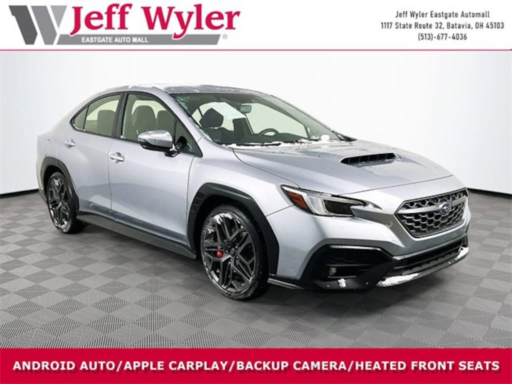 Jeff Wyler Eastgate Auto Mall is excited to offer this good-looking 2024 Subaru WRX TR in Ice Silver Metallic. Well equipped with: Popular Package #1A (Auto-Dimming Exterior Mirror w/Approach Light, Auto-Dimming Mirror w/Compass & HomeLink, Cargo Tray, LED Upgrade, and Side Sill Plates - Illuminated), Standard Model, 11 Speakers, 4-Wheel Disc Brakes, ABS brakes, Air Conditioning, All-Weather Floor Liners, Alloy wheels, AM/FM radio: SiriusXM, Auto High-beam Headlights, Auto-dimming Rear-View mirror, Automatic temperature control, Brake assist, Bumpers: body-color, Driver door bin, Driver vanity mirror, Dual front impact airbags, Dual front side impact airbags, Electronic Stability Control, Emergency communication system: STARLINK Safety and Security (Subscription Required), Exterior Parking Camera Rear, Four wheel independent suspension, Front anti-roll bar, Front Bucket Seats, Front Center Armrest, Front dual zone A/C, Front fog lights, Front reading lights, Fully automatic headlights, harman/kardon® Speakers, Heated door mirrors, Heated front seats, Illuminated entry, Knee airbag, Leather Shift Knob, Leather steering wheel, Low tire pressure warning, Navigation System, Occupant sensing airbag, Outside temperature display, Overhead airbag, Overhead console, Panic alarm, Passenger door bin, Passenger vanity mirror, Performance Design Recaro Heated Frt Bucket Seats, Power door mirrors, Power driver seat, Power steering, Power windows, Radio data system, Radio: Subaru STARLINK 11.6" Multimedia Plus Sys, Rear anti-roll bar, Rear seat center armrest, Rear window defroster, Remote keyless entry, Security system, Speed control, Speed-sensing steering, Split folding rear seat, Spoiler, Sport steering wheel, STARLINK/Apple CarPlay/Android Auto, Steering wheel mounted audio controls, Tachometer, Telescoping steering wheel, Tilt steering wheel, Traction control, Trip computer, Turn signal indicator mirrors, Ultrasuede & Leather-Trimmed Seats w/Red Stitching, Variably intermittent wipers, and Wheels: 19" x 8.5" Satin Gray Finish Alum Alloy. CARFAX One-Owner. Clean CARFAX. Ask about available certifications. Used vehicles 10 years of age or newer with less than 100,000 miles are eligible for the Wyler Assurance Program, but eligible vehicles must pass our reconditioning process and multi-point inspection. Provided the vehicle passes inspection, vehicles will be eligible for the 6 month/6,000 mile limited warranty. The 6 month/6,000 mile limited warranty is NOT available on AS-IS vehicles, wholesale vehicles, lease buyback/pass-thru vehicles or un-inspected vehicles. Note that this program can also apply to vehicles where the remaining factory coverage is less than 6 months or 6,000 miles. Please check the Federal Trade Commission (FTC) Buyers guide on the vehicle for full details as to whether or not warranty coverage may apply. Contact Dealer for additional details. The Wyler Assurance 6 month/6,000 Mile limited warranty ends 6 months from the date of the Retail Purchase Agreement (BUYERS ORDER) or when the vehicle's odometer registers 6,000 additional miles to the mileage listed on the BUYERS ORDER, whichever comes first. Your Deductible - The warranty holder on your contract pays the first $100 of each covered repair.