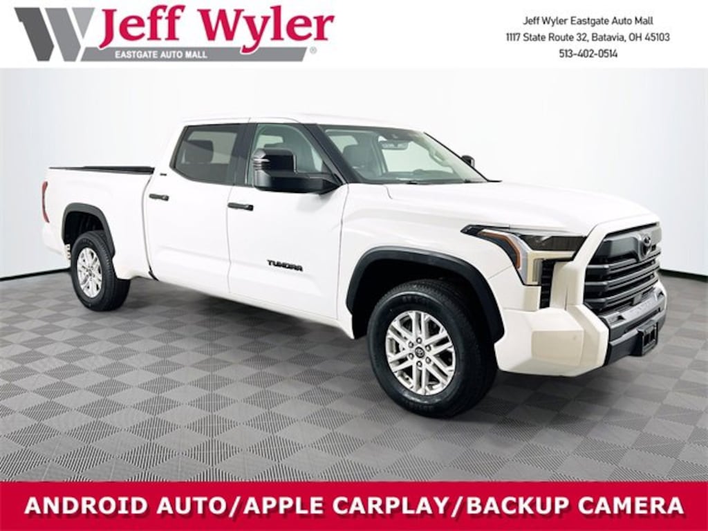 Jeff Wyler Eastgate Auto Mall is excited to offer this fantastic-looking 2022 Toyota Tundra SR5 in White. Well equipped with: 18" Alloy Wheels, 3.31 Axle Ratio, 4-Way Adjustable Front Bucket Seats, 4-Wheel Disc Brakes, 9 Speakers, ABS brakes, Air Conditioning, Alloy wheels, AM/FM radio: SiriusXM, Apple CarPlay/Android Auto, Auto High-beam Headlights, Automatic temperature control, Brake assist, Bumpers: body-color, Delay-off headlights, Driver door bin, Driver vanity mirror, Dual front impact airbags, Dual front side impact airbags, Electronic Stability Control, Emergency communication system: Safety Connect with 1-year trial, Exterior Parking Camera Rear, Fabric Seat Trim, Front anti-roll bar, Front Bucket Seats, Front Center Armrest, Front fog lights, Front reading lights, Front wheel independent suspension, Fully automatic headlights, Heated door mirrors, Illuminated entry, Knee airbag, Low tire pressure warning, Occupant sensing airbag, Outside temperature display, Overhead airbag, Overhead console, Panic alarm, Passenger door bin, Passenger vanity mirror, Power door mirrors, Power steering, Power windows, Radio data system, Radio: Audio Multimedia System, Rear reading lights, Rear step bumper, Rear window defroster, Remote keyless entry, Safety Connect, Security system, Speed control, Speed-sensing steering, Split folding rear seat, Steering wheel mounted audio controls, Tachometer, Telescoping steering wheel, Tilt steering wheel, Traction control, Trip computer, Turn signal indicator mirrors, Variably intermittent wipers, and Voltmeter. Awards: * ALG Residual Value Awards, Residual Value Awards Ask about available certifications. Used vehicles 10 years of age or newer with less than 100,000 miles are eligible for the Wyler Assurance Program, but eligible vehicles must pass our reconditioning process and multi-point inspection. Provided the vehicle passes inspection, vehicles will be eligible for the 6 month/6,000 mile limited warranty. The 6 month/6,000 mile limited warranty is NOT available on AS-IS vehicles, wholesale vehicles, lease buyback/pass-thru vehicles or un-inspected vehicles. Note that this program can also apply to vehicles where the remaining factory coverage is less than 6 months or 6,000 miles. Please check the Federal Trade Commission (FTC) Buyers guide on the vehicle for full details as to whether or not warranty coverage may apply. Contact Dealer for additional details. The Wyler Assurance 6 month/6,000 Mile limited warranty ends 6 months from the date of the Retail Purchase Agreement (BUYERS ORDER) or when the vehicle's odometer registers 6,000 additional miles to the mileage listed on the BUYERS ORDER, whichever comes first. Your Deductible - The warranty holder on your contract pays the first $100 of each covered repair.